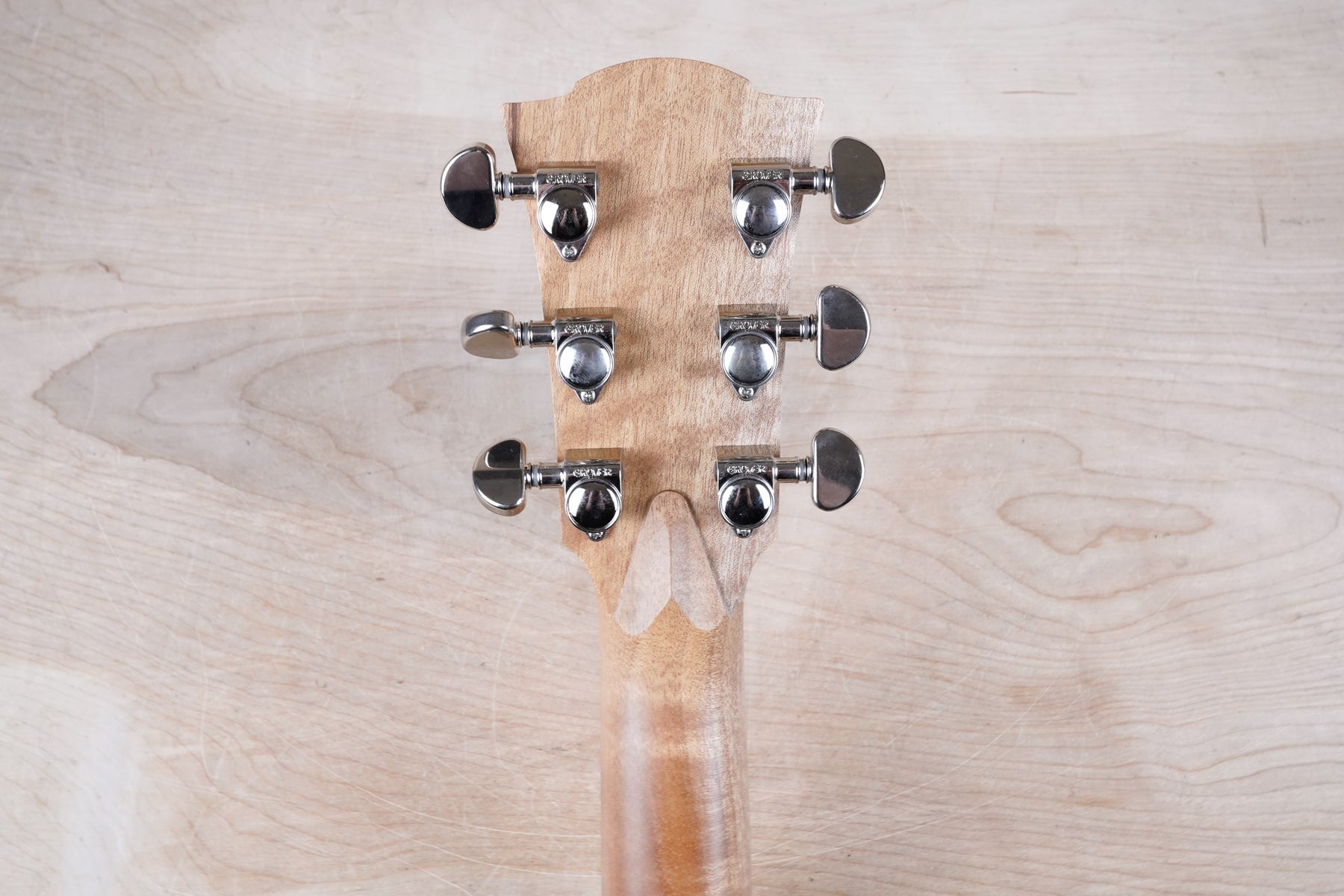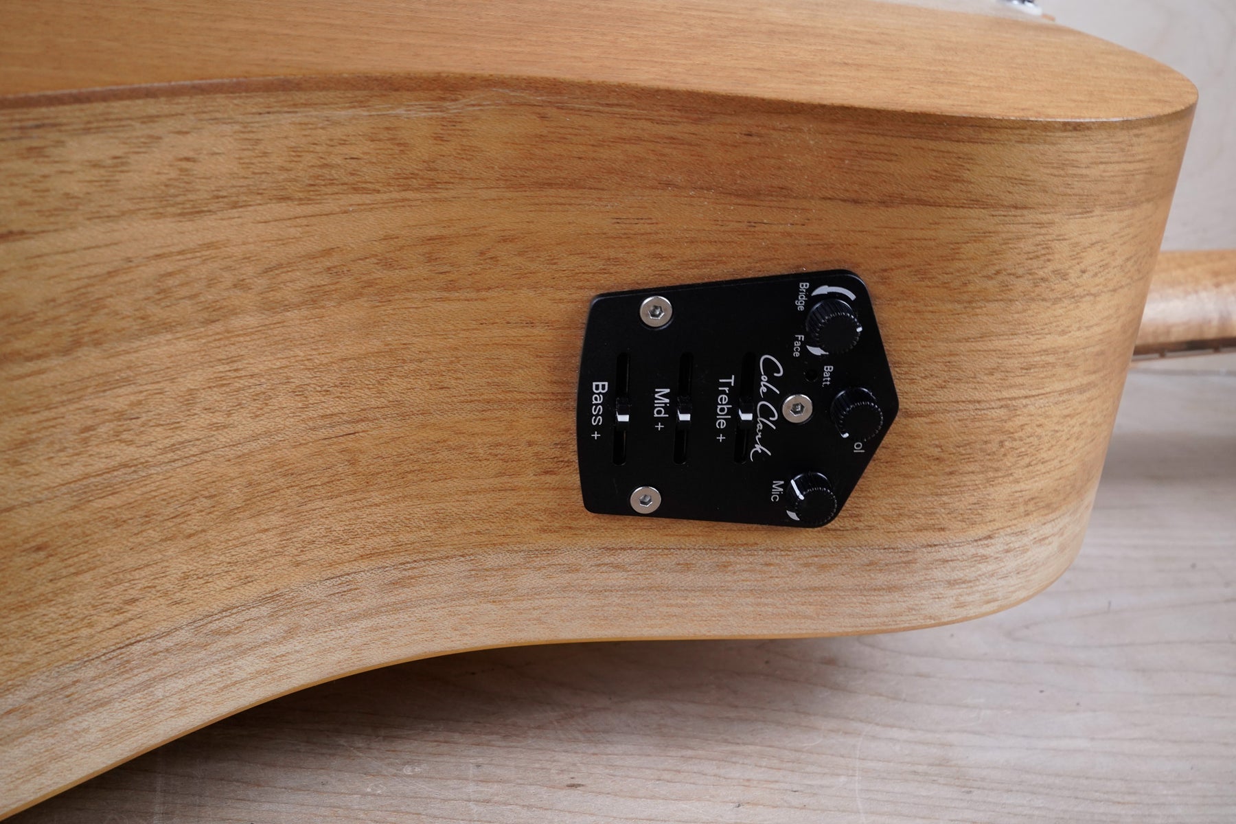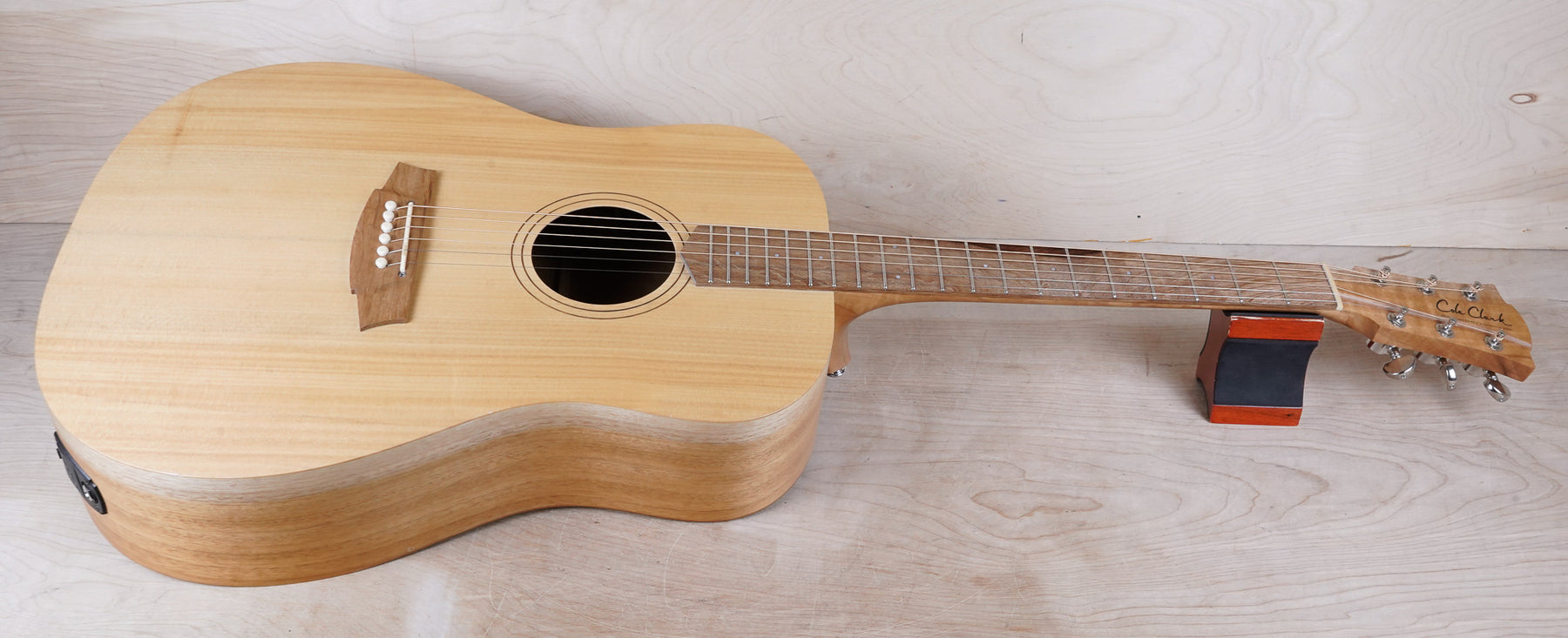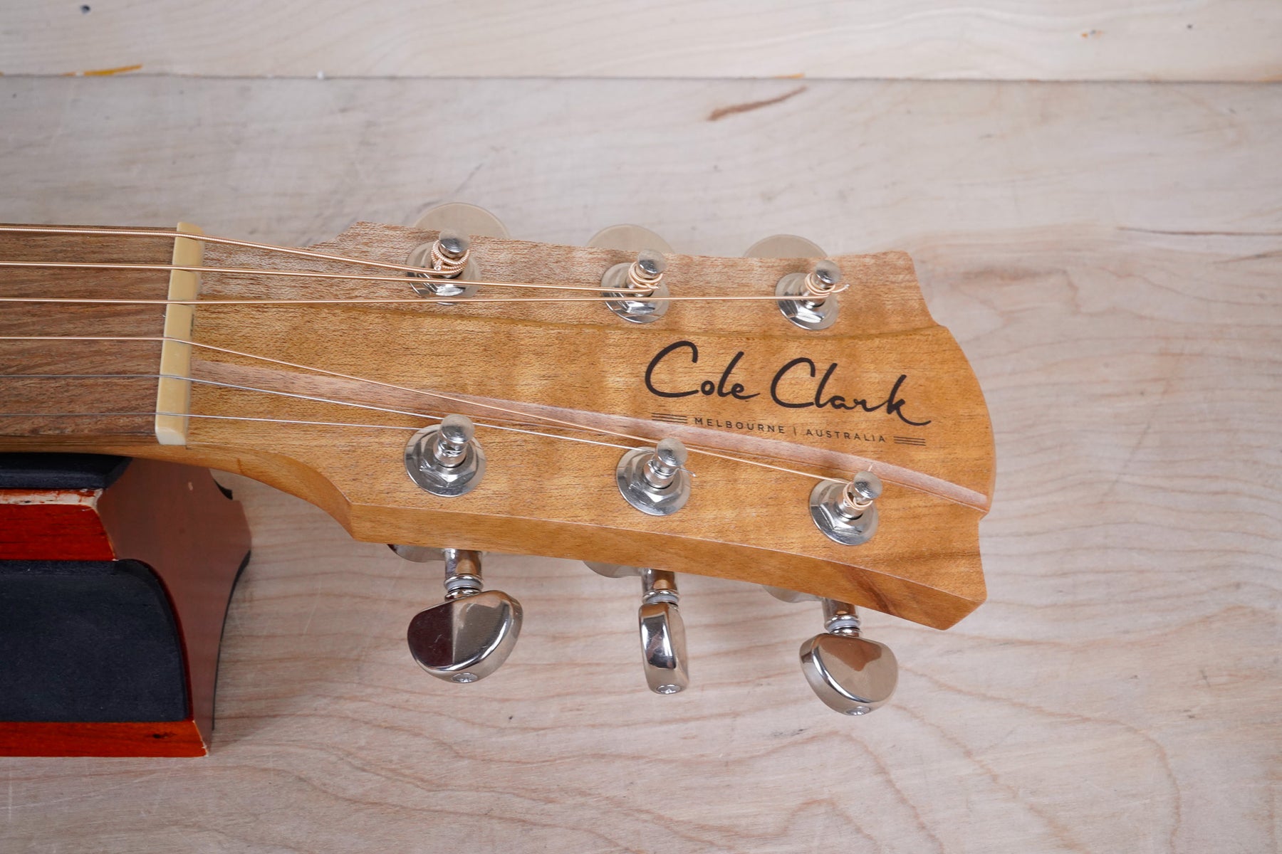 This Cole Clark CCFL1EC acoustic guitar is a very unique instrument and is made entirely from sustainably sourced timbers in Australia. The tone woods include a bunya top, Queensland maple neck, back, and sides, and a she oak fretboard. The electronics include the Cole Clark PG3 pickup system. The guitar plays great and has rich low end.