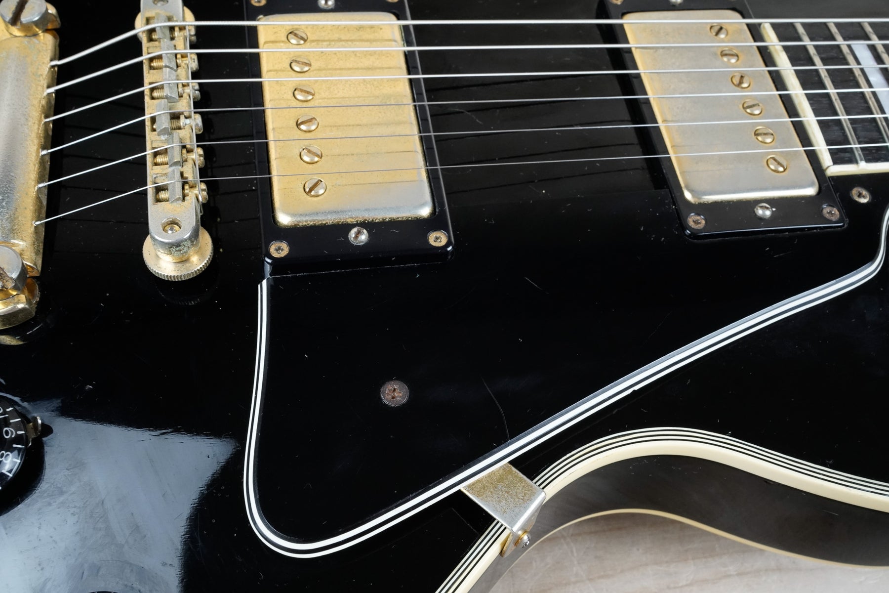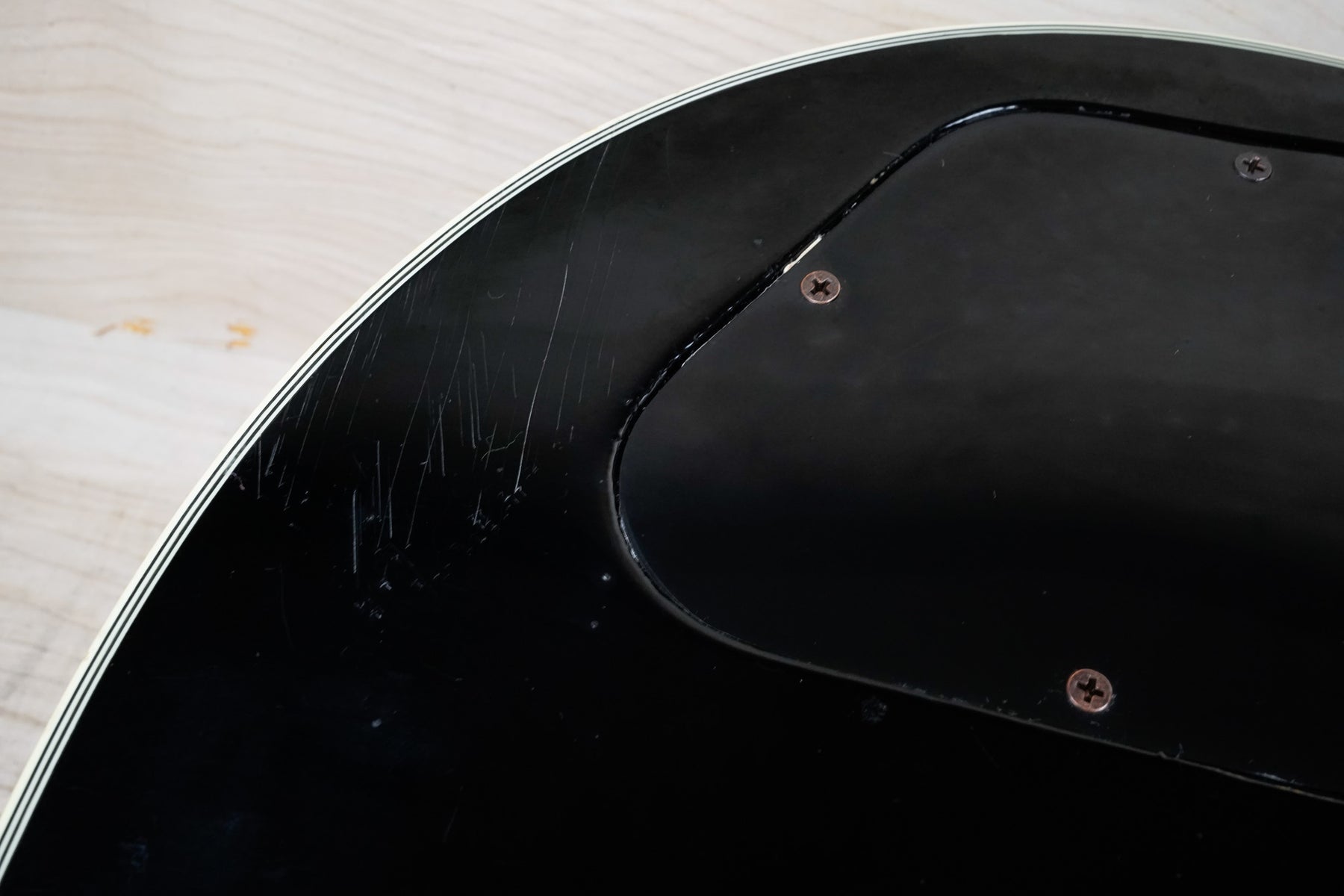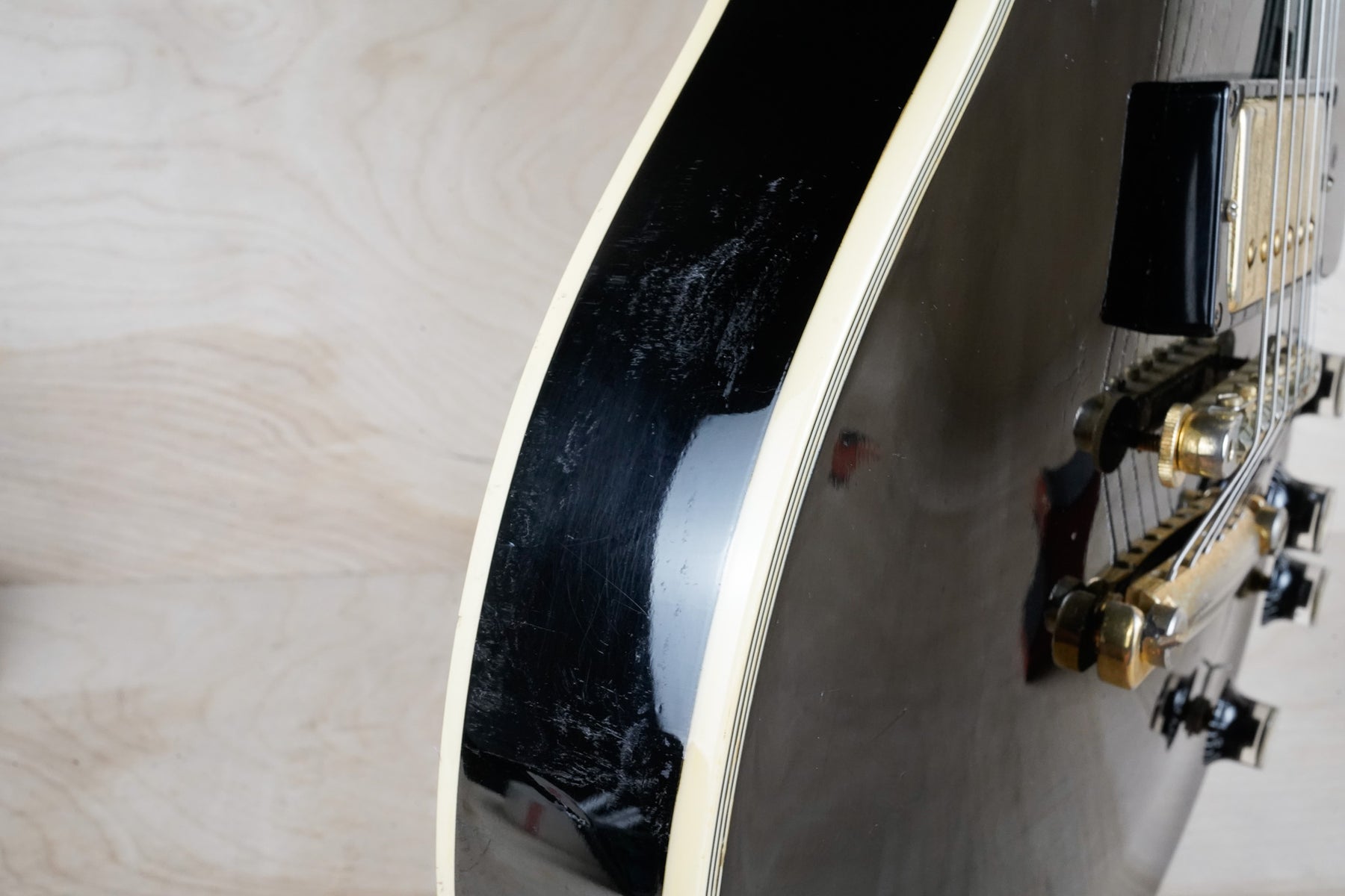 This guitar does show some cosmetic wear from over the years that includes various surface scratches, scuffs, and dents throughout the body with additional scratches and dings along the back of the neck and headstock. The gold hardware shows normal tarnishing and the binding has yellowed from over time. The binding along the neck also shows small chips throughout. The frets are used but still play great and the electronics work as they should.