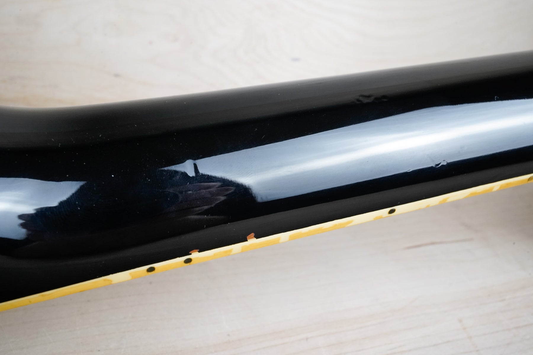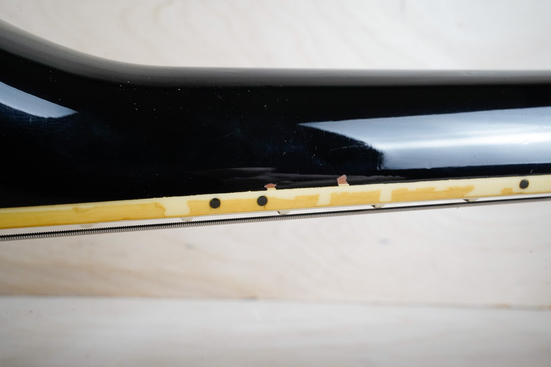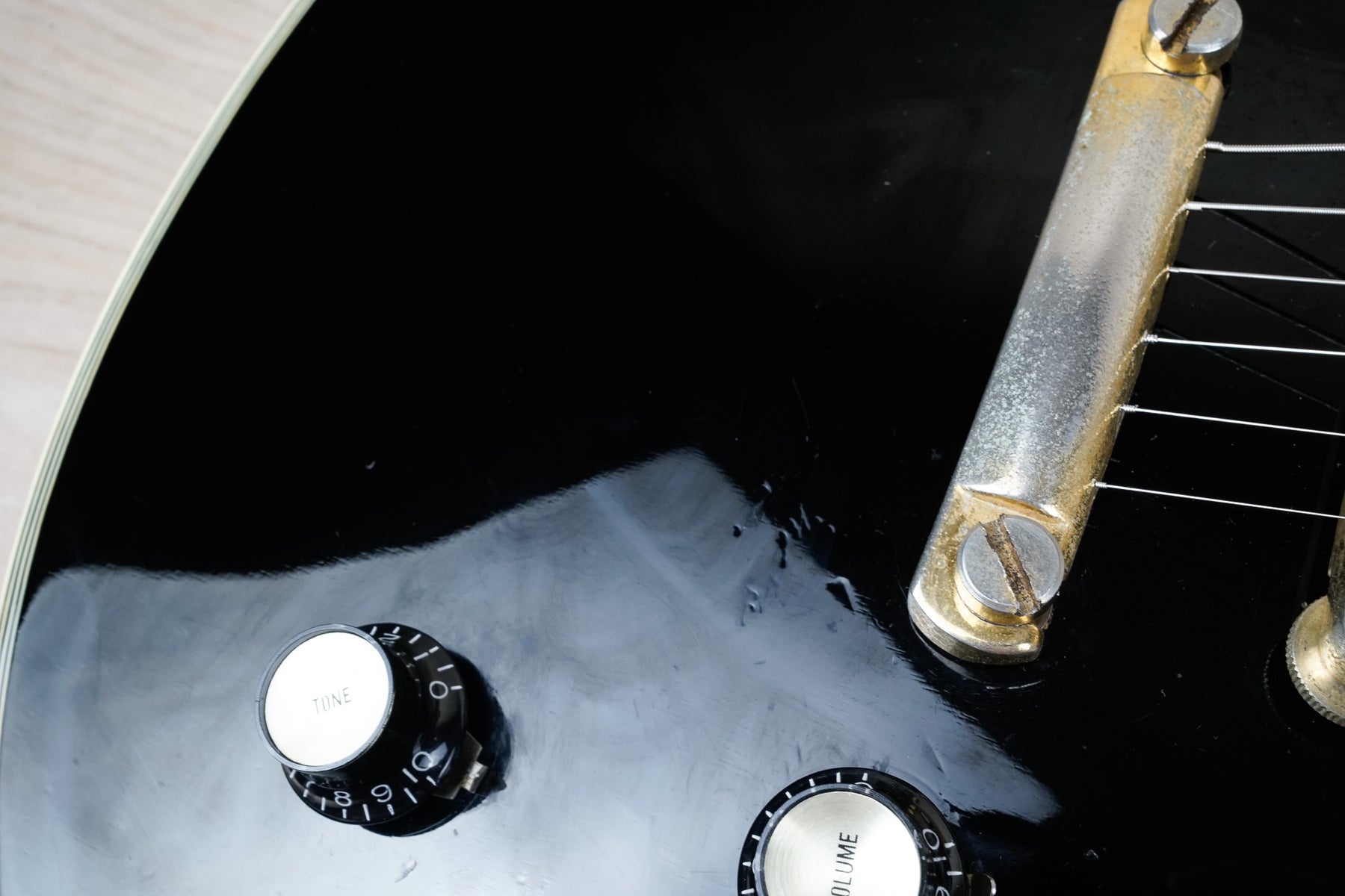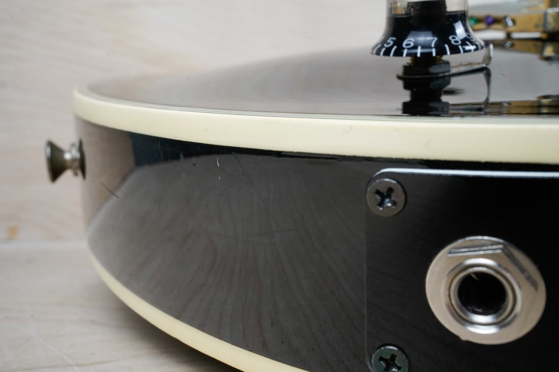 This guitar does show some cosmetic wear from over the years that includes various surface scratches, scuffs, and dents throughout the body with additional scratches and dings along the back of the neck and headstock. The gold hardware shows normal tarnishing and the binding has yellowed from over time. The binding along the neck also shows small chips throughout. The frets are used but still play great and the electronics work as they should.