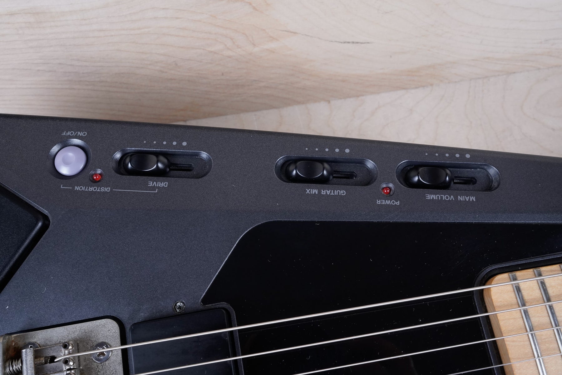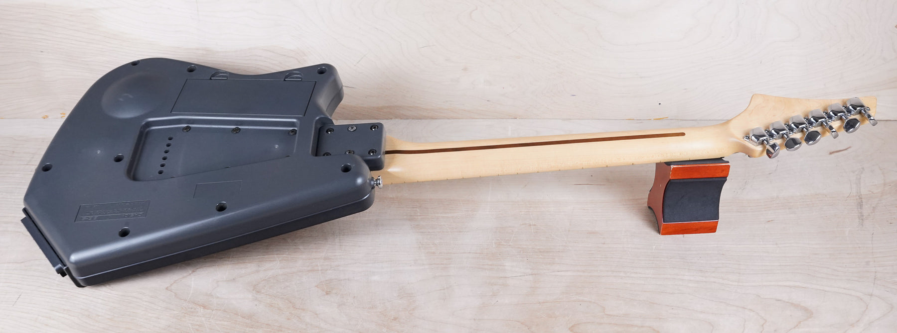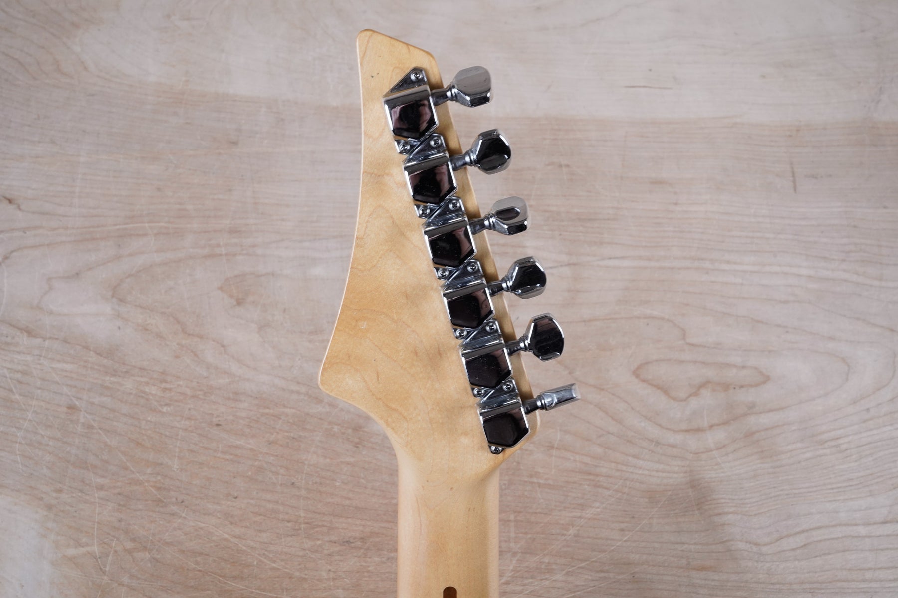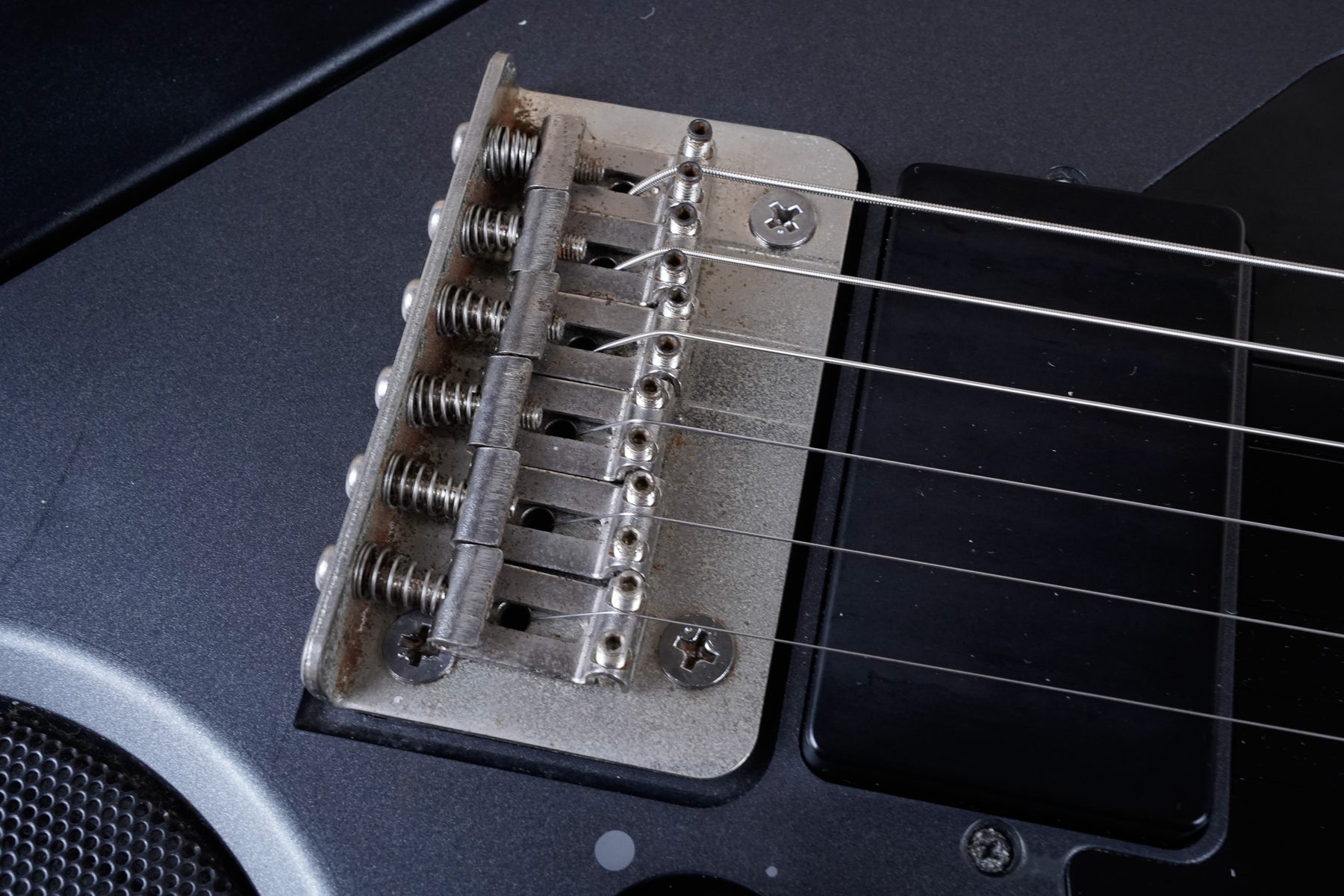 This guitar does show some cosmetic wear from over the years that includes various surface scratches throughout the body with minor dings along the back of the neck and headstock. The hardware, particularly the bridge, shows quite a bit of tarnish and oxidation from over time. The frets appear to still be in nice shape and the guitar runs perfectly on batteries. The power supply looses power when moving it but powers back up.