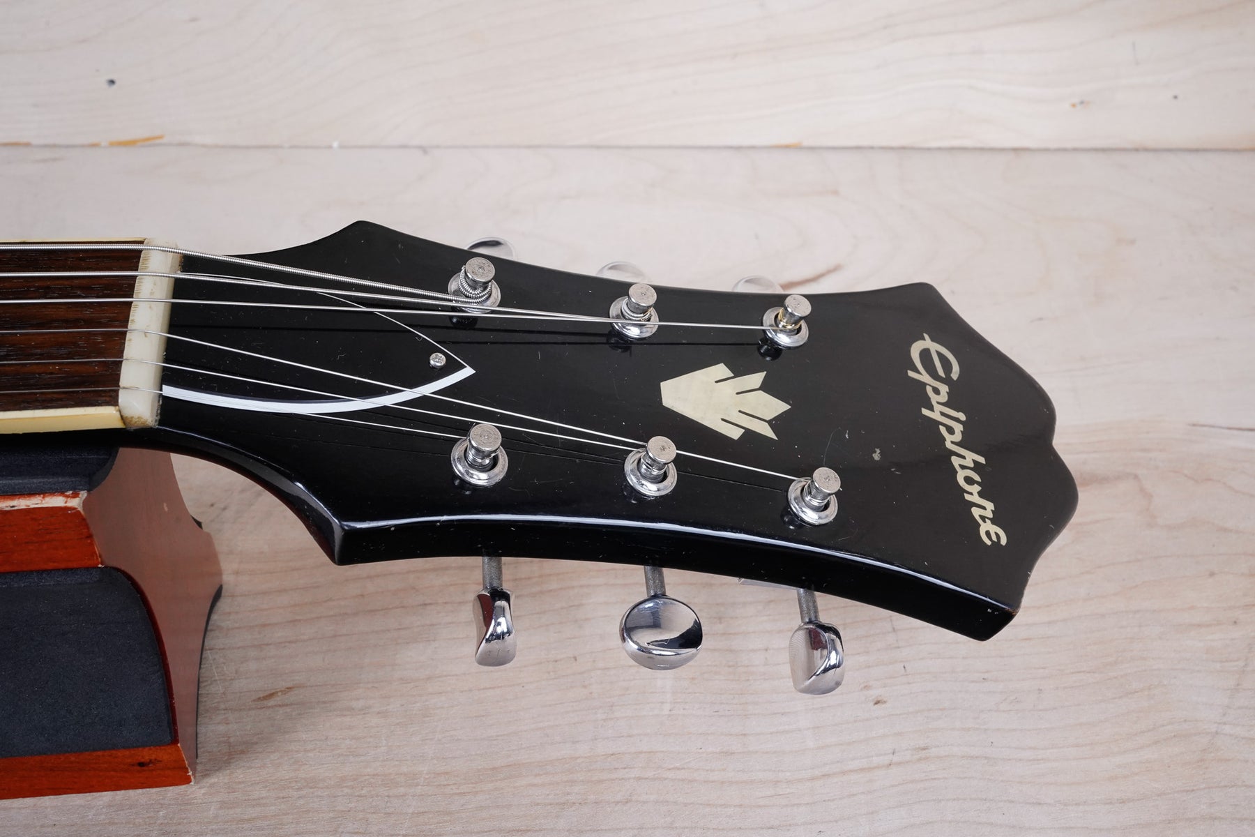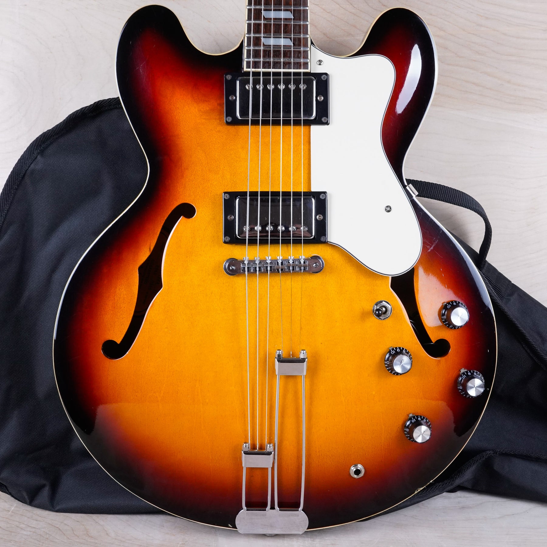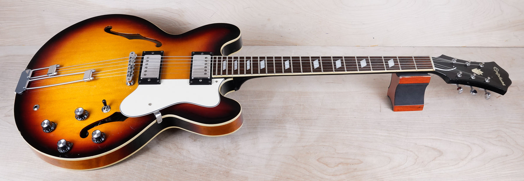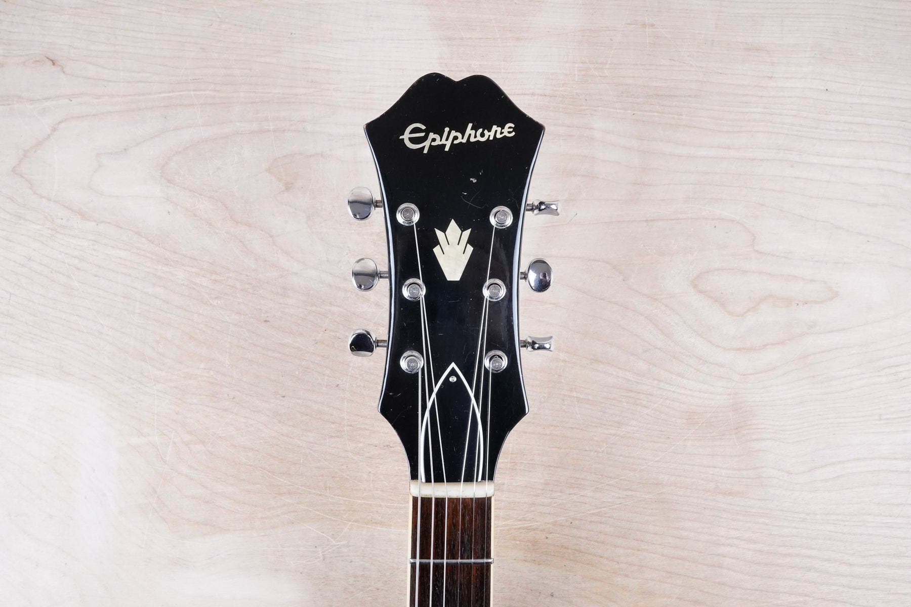 This Epiphone Riviera VC plays and sounds great! The guitar is a semi-hollow body construction and the tone woods include a maple body, slim taper mahogany neck, and rosewood fretboard. This is an earlier Riviera made at the Peerless factory in Korea in 1996.