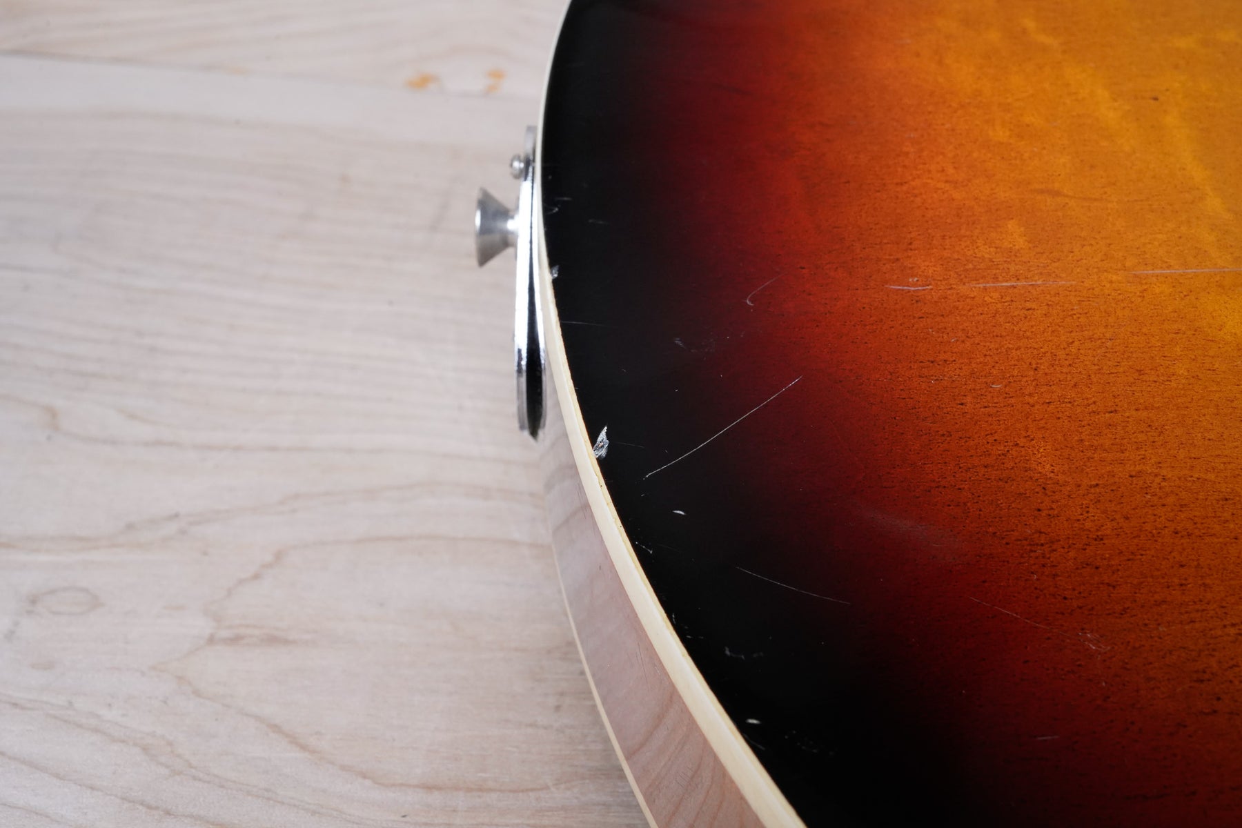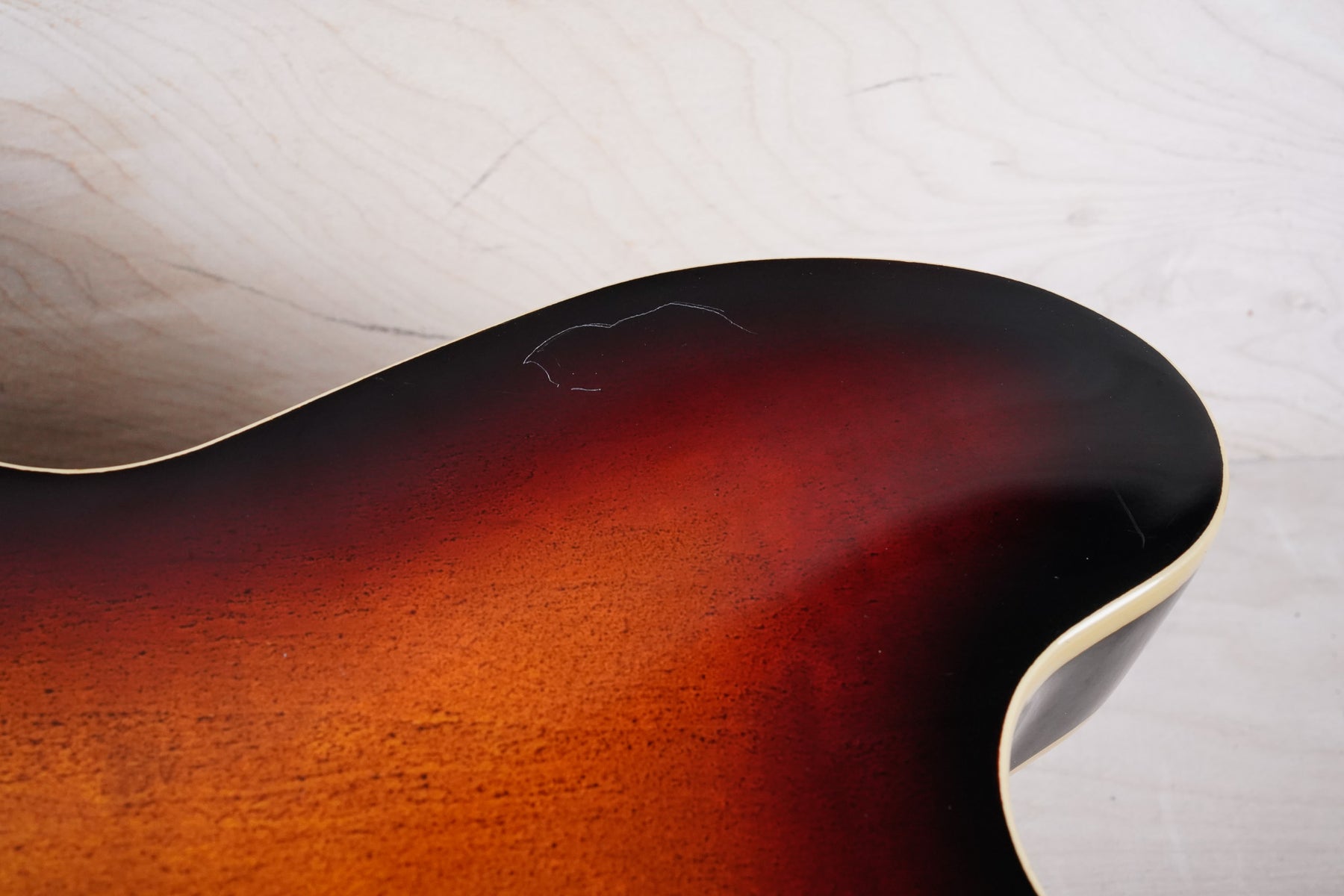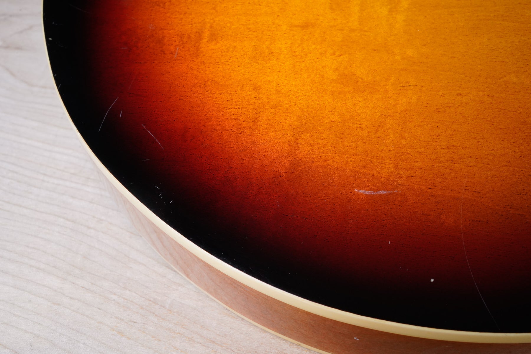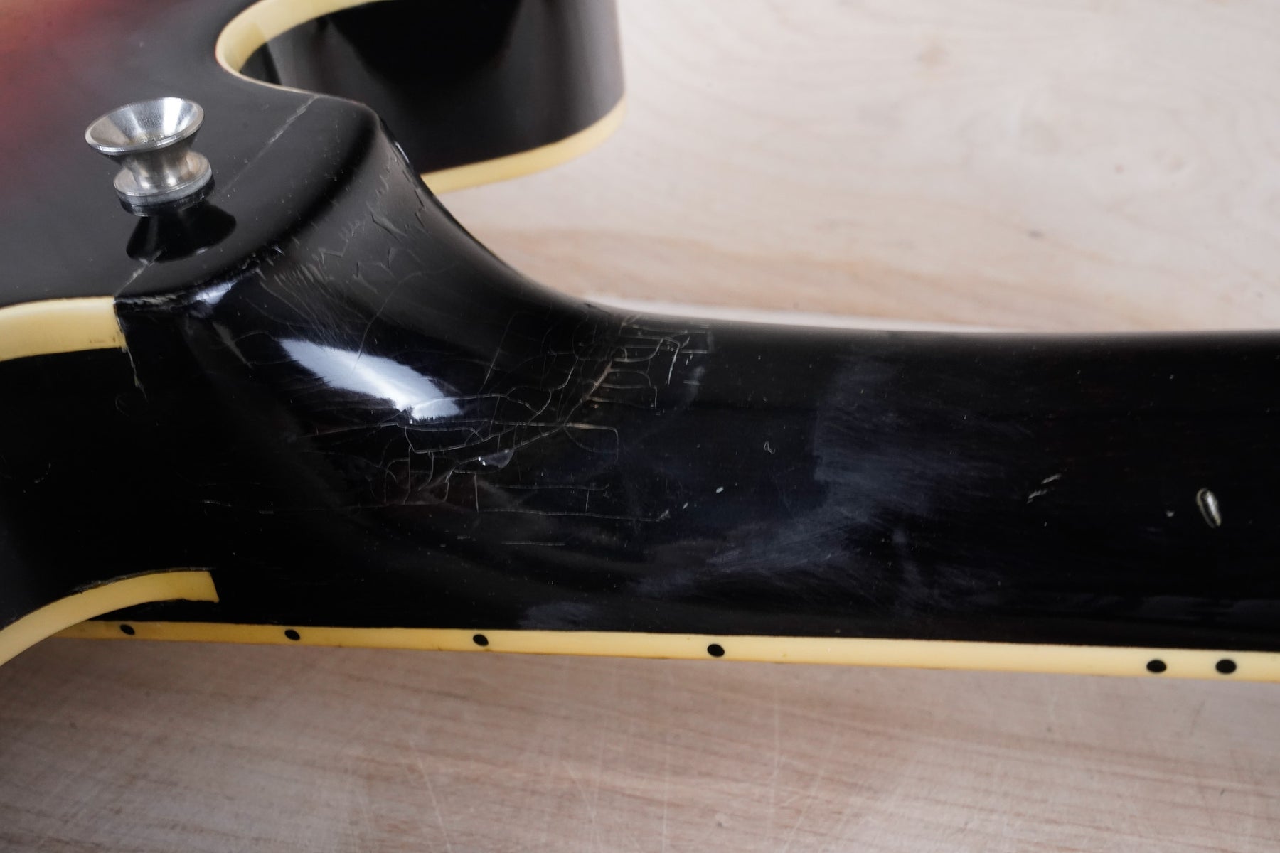 This guitar does show quite a bit of cosmetic wear from over the years that includes various surface scratches, scuffs, and dents throughout the body. There's also particularly quite a bit of wear along the neck joint and additional dings on the headstock. The binding has yellowed from over time and the hardware has normal tarnishing. The frets are used but still play well overall and the electronics work as they should.
