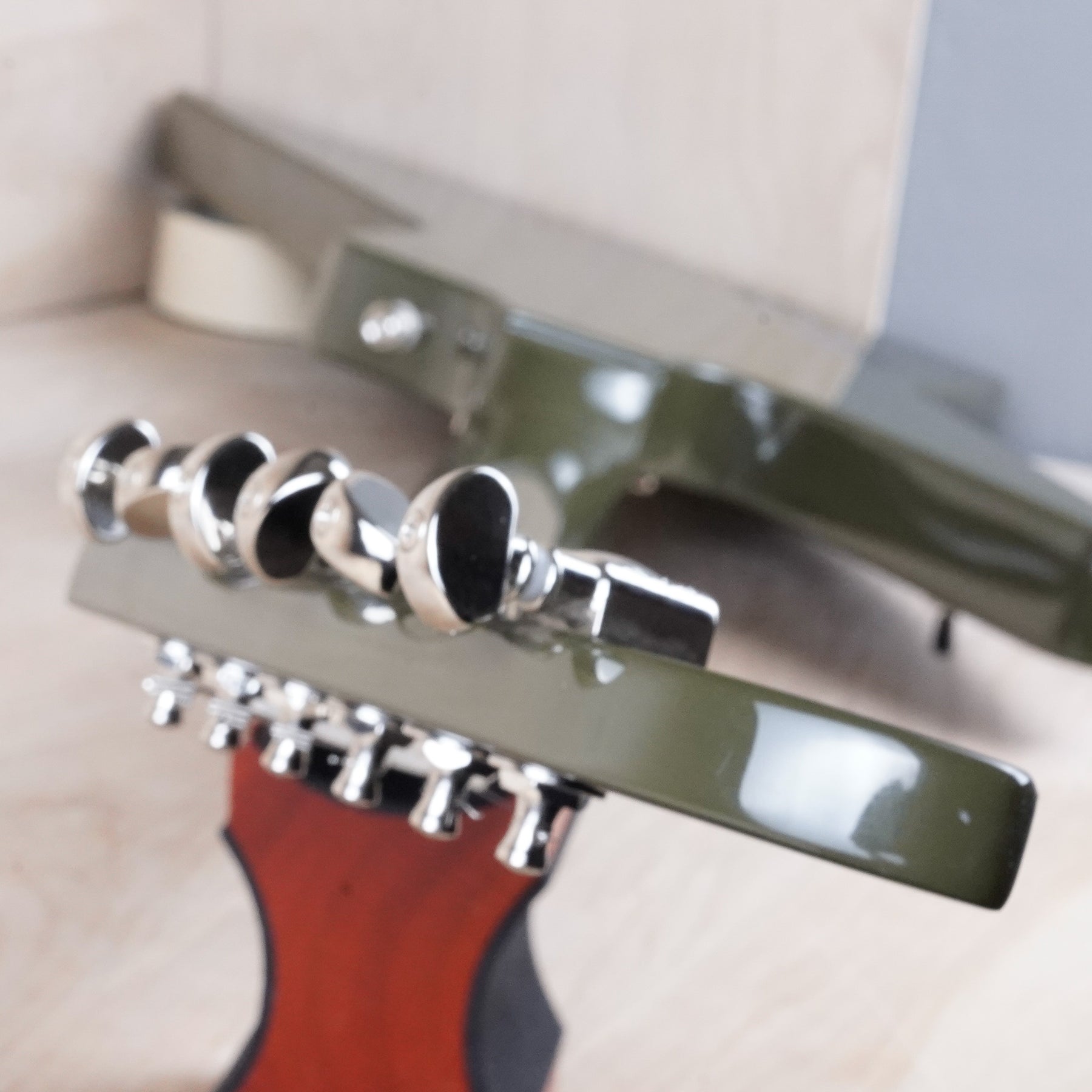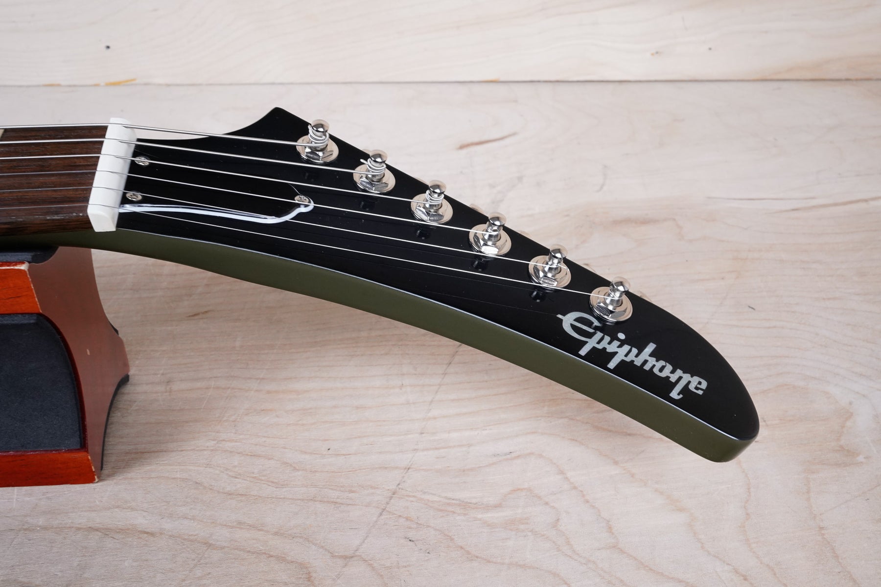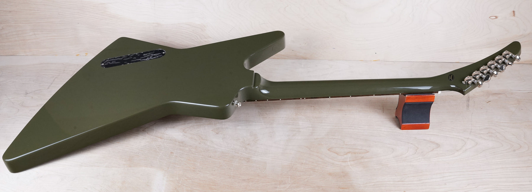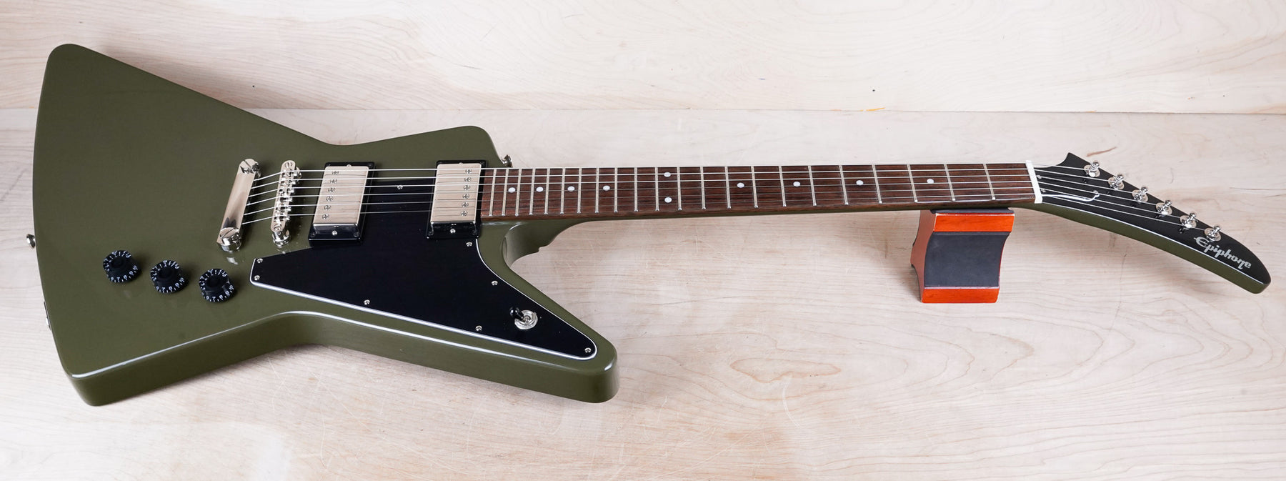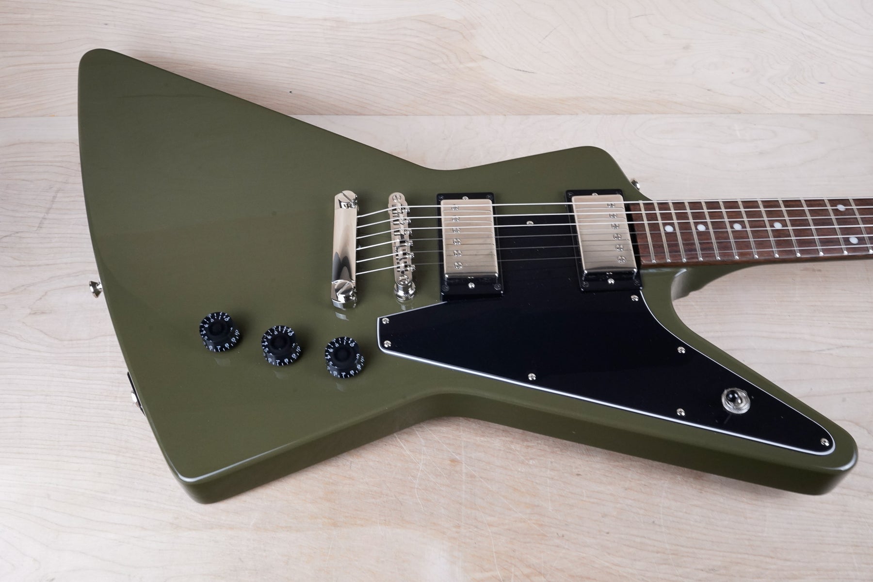 This Epiphone Limited Explorer plays and sounds great! The neck has a comfortably slim profile and the olive drab green finish is a nice color.