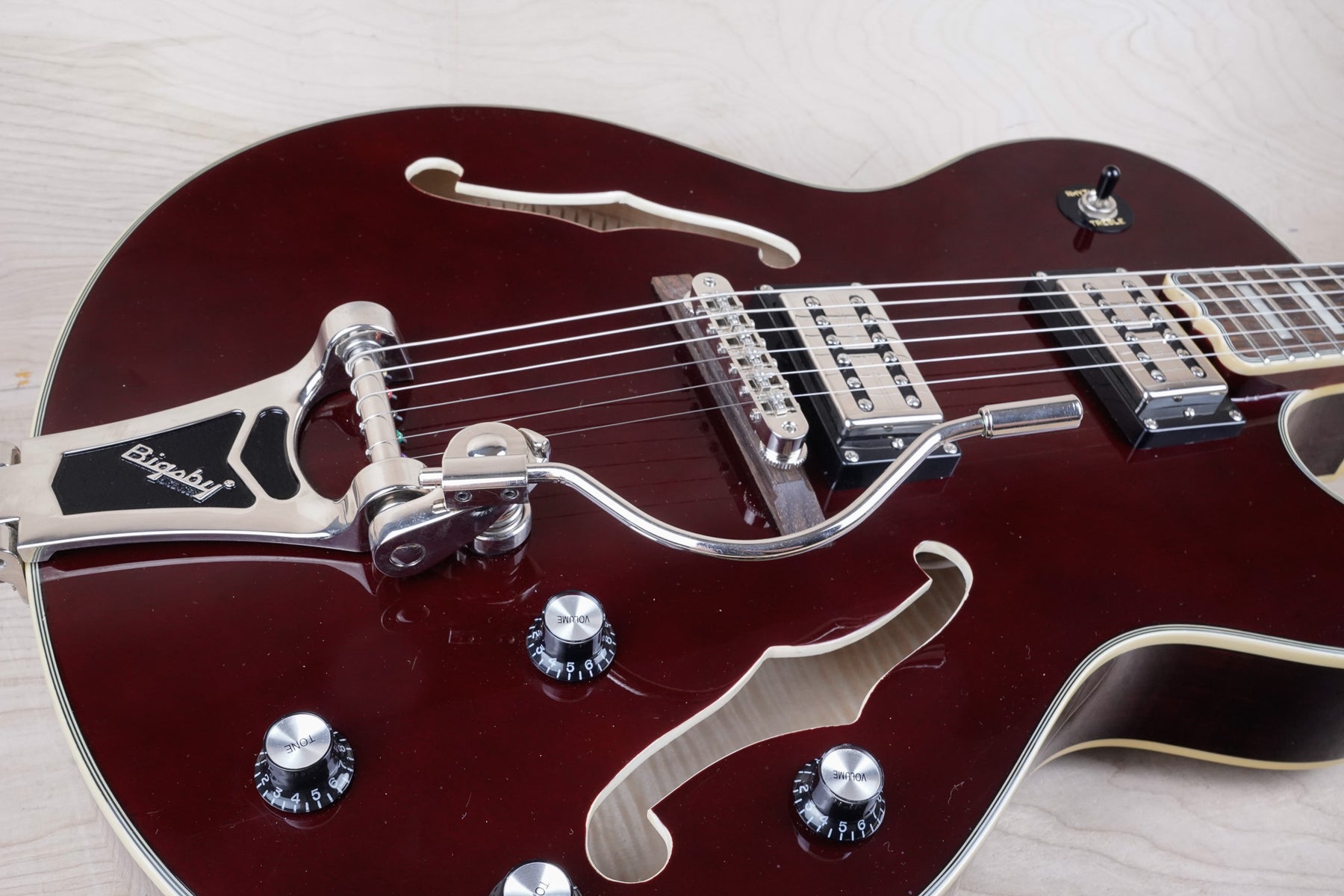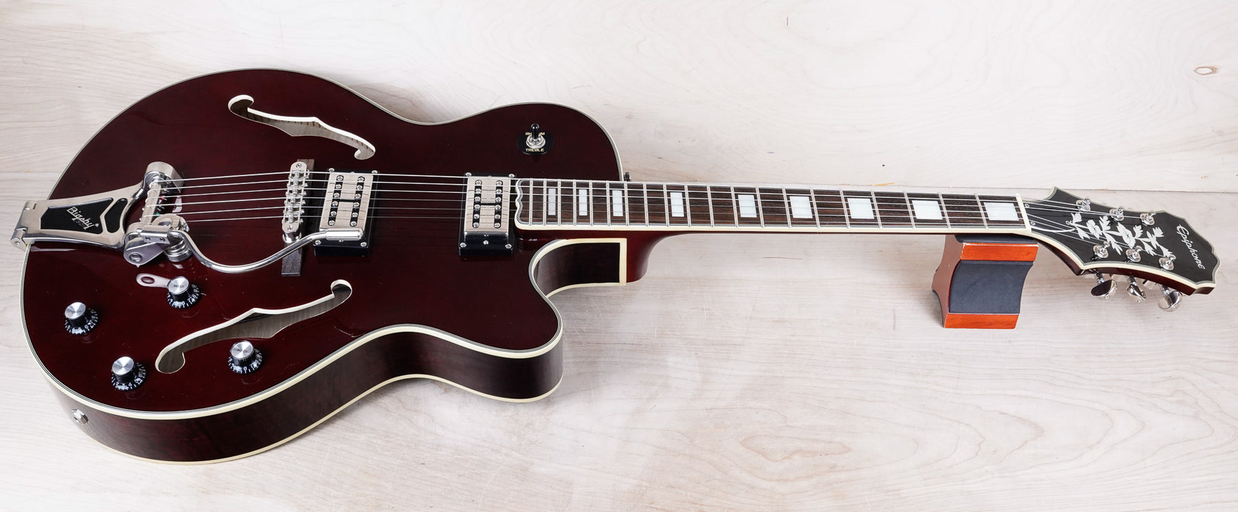 This Epiphone Swingster plays and sounds great! The Swingbucker pickups paired with the hollow body construction provide a very warm and full output. The neck has a slim taper profile and the tone woods include a spruce top, maple body and neck, with rosewood fretboard.