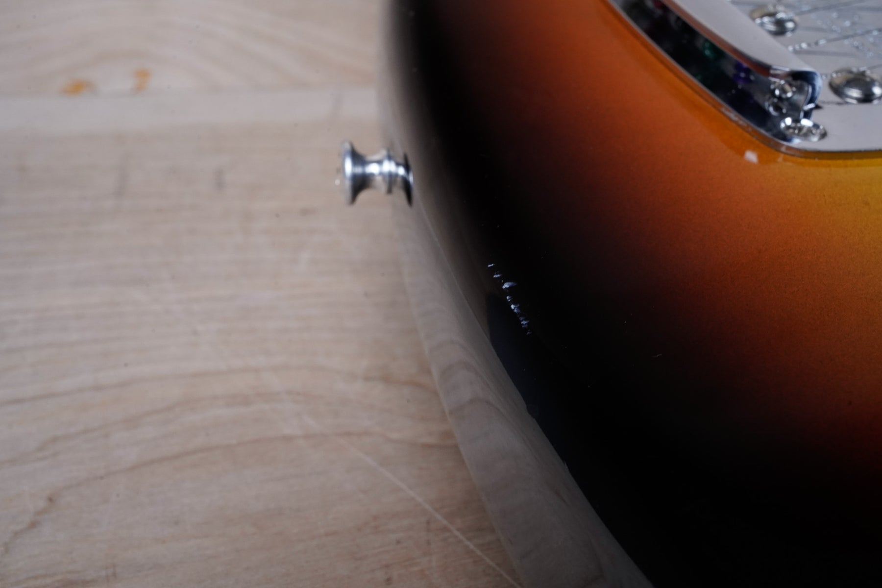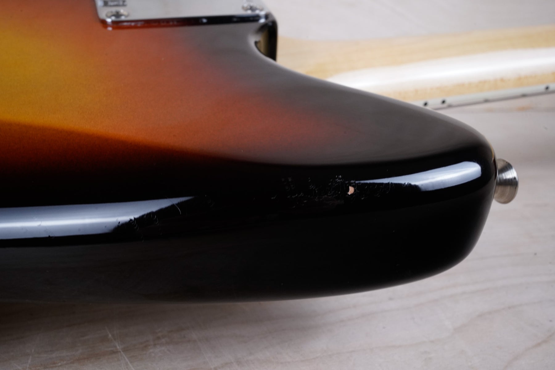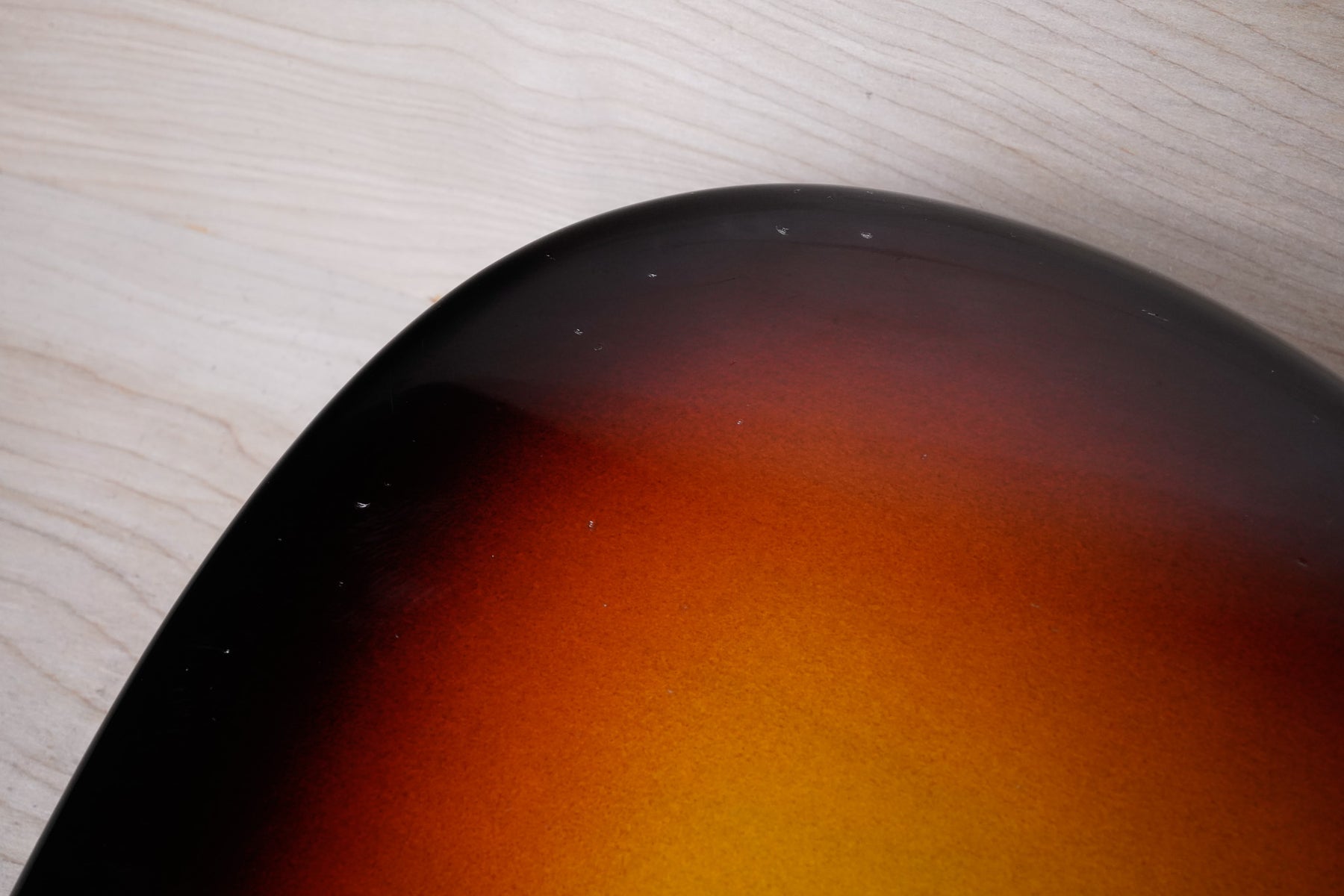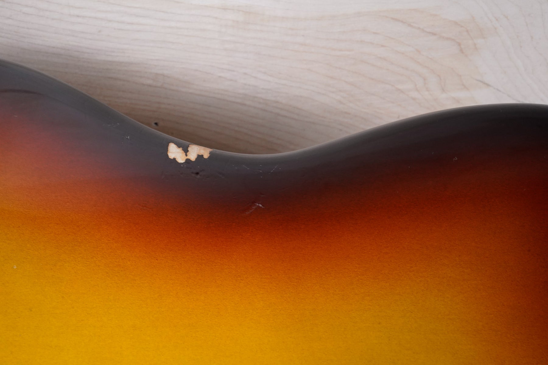 This guitar does show some cosmetic wear that includes various surface scratches, scuffs, dents, and finish chips throughout the body with small dings on the headstock. The binding around the fretboard also shows some small scuffs and is starting to age from over time. The frets are still in nice shape and the electronics work as they should.