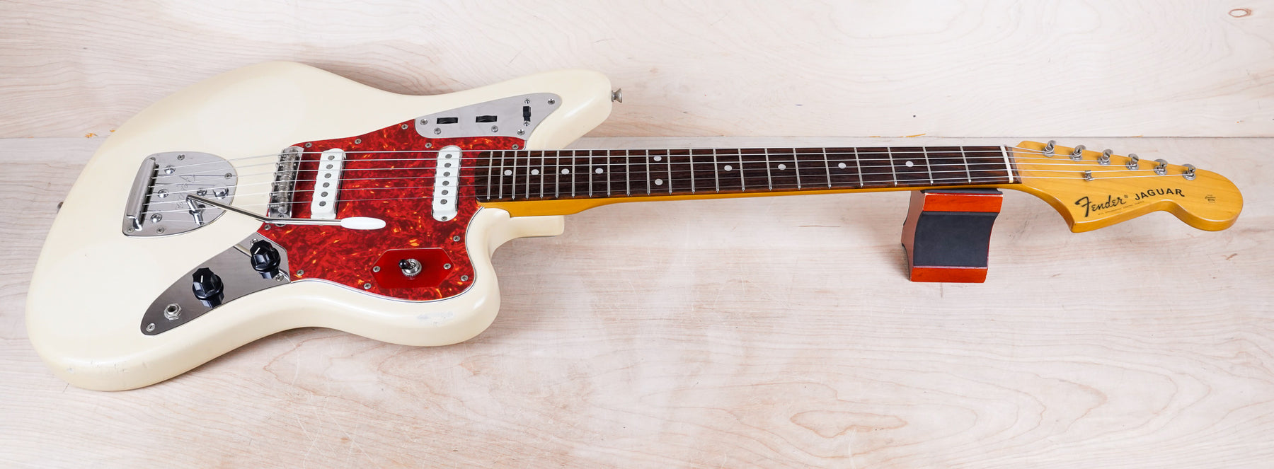 This crafted in Japan Fender JG-66 Jaguar Reissue plays and sounds great! This one has been modded for a 3-way pickup selector and the tone woods include an alder body, "C" shape maple neck, and rosewood fretboard. This is a fantastic recreation of the iconic '62 Jaguar, with the added bonus of easier pickup switching with the modification.