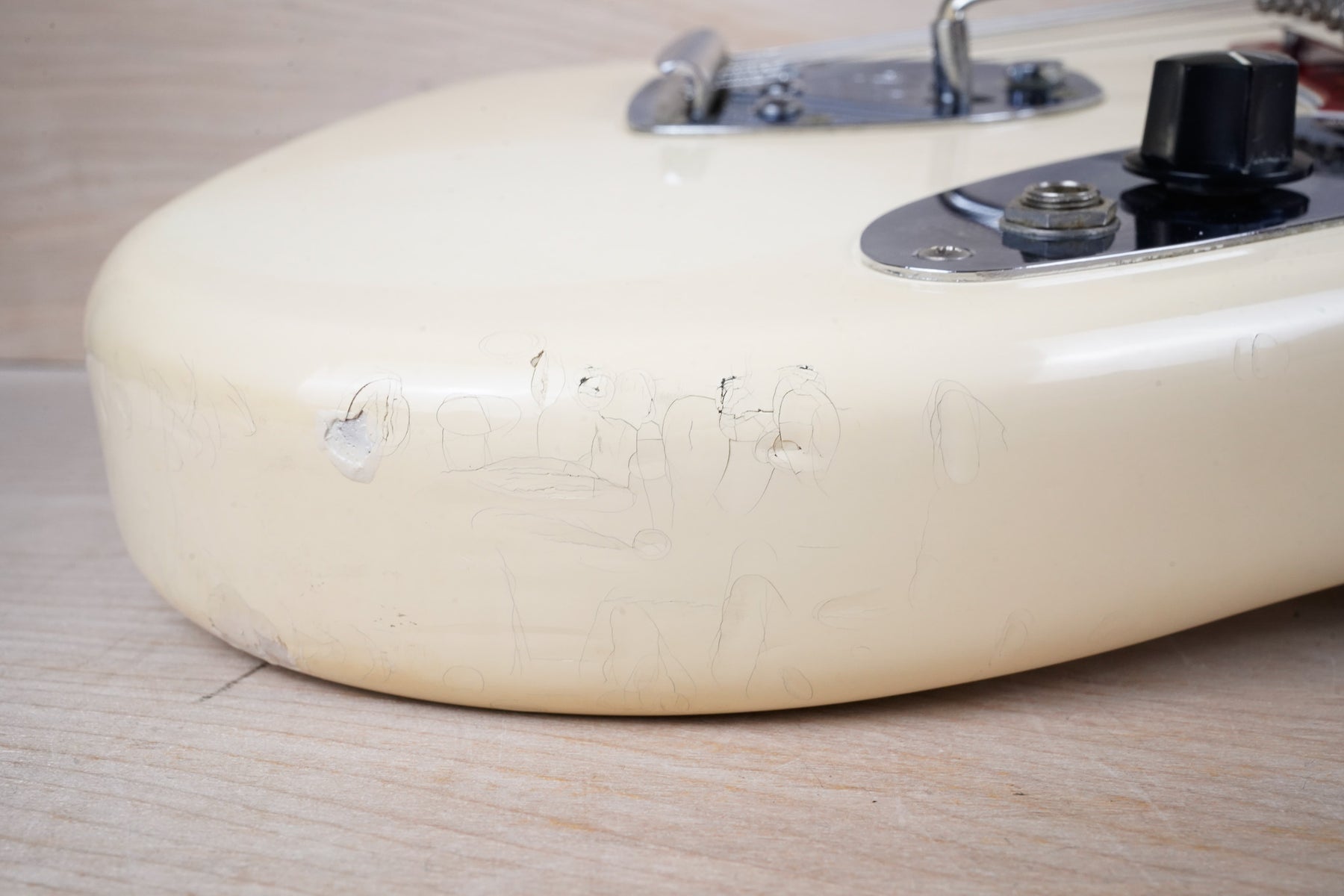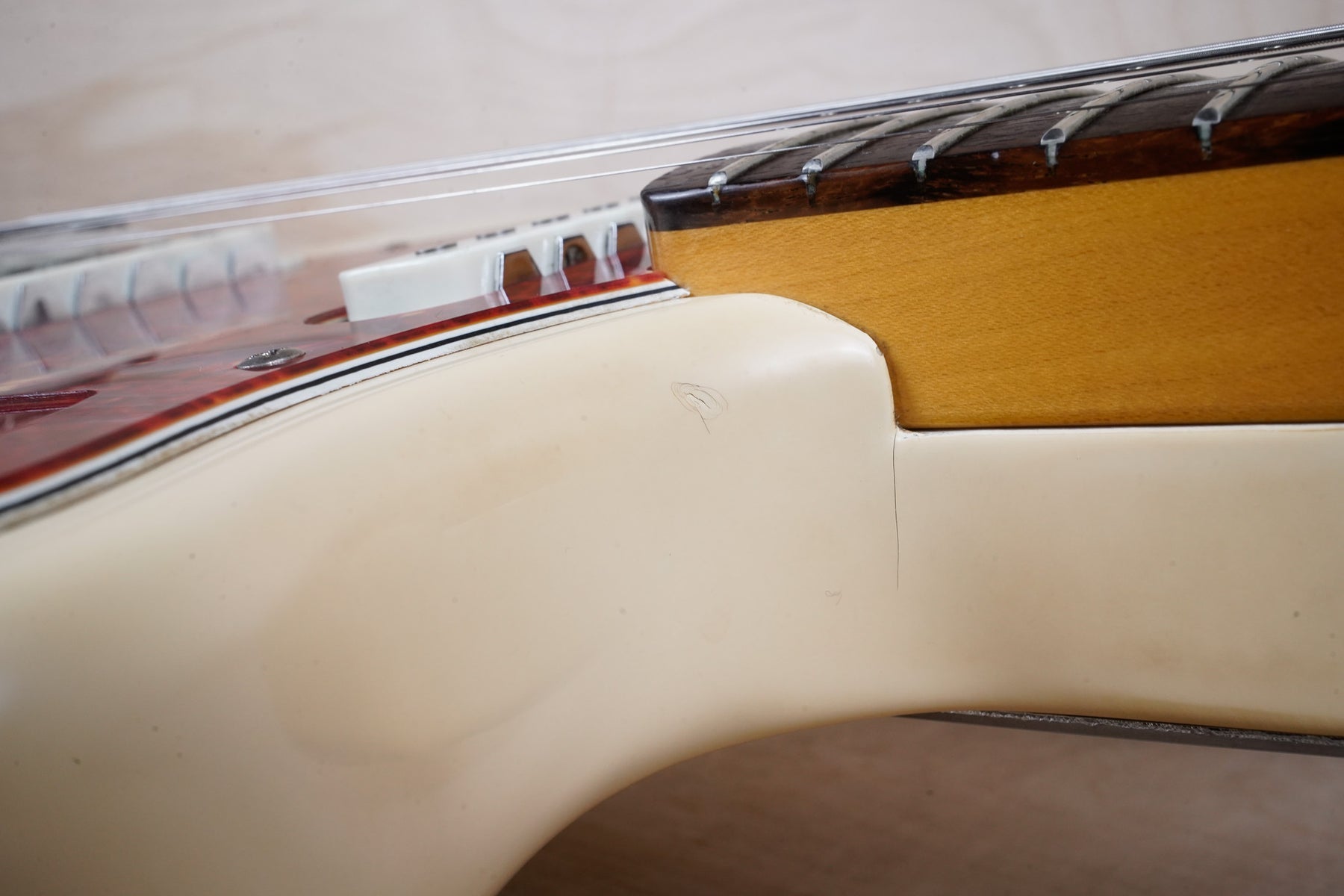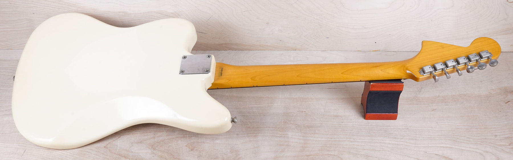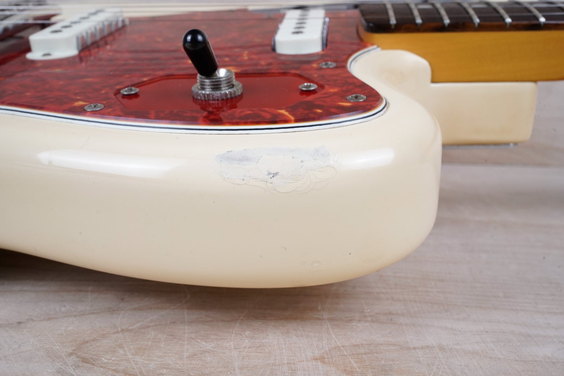 This guitar does show quite a bit of cosmetic wear from over the years that includes various surface scratches, scuffs, and dents throughout the body, particularly along the sides, with additional dings along the back of the neck and headstock. There's also a few finish chips along the sides of the body that appear to have been filled and sealed off. The Olympic White finish has yellowed from over time and there's an imprint on the back of the body from where a large sticker had been placed at one point in time. The hardware also shows normal light tarnishing. The frets are used but otherwise still play great and the electronics work as they should.
