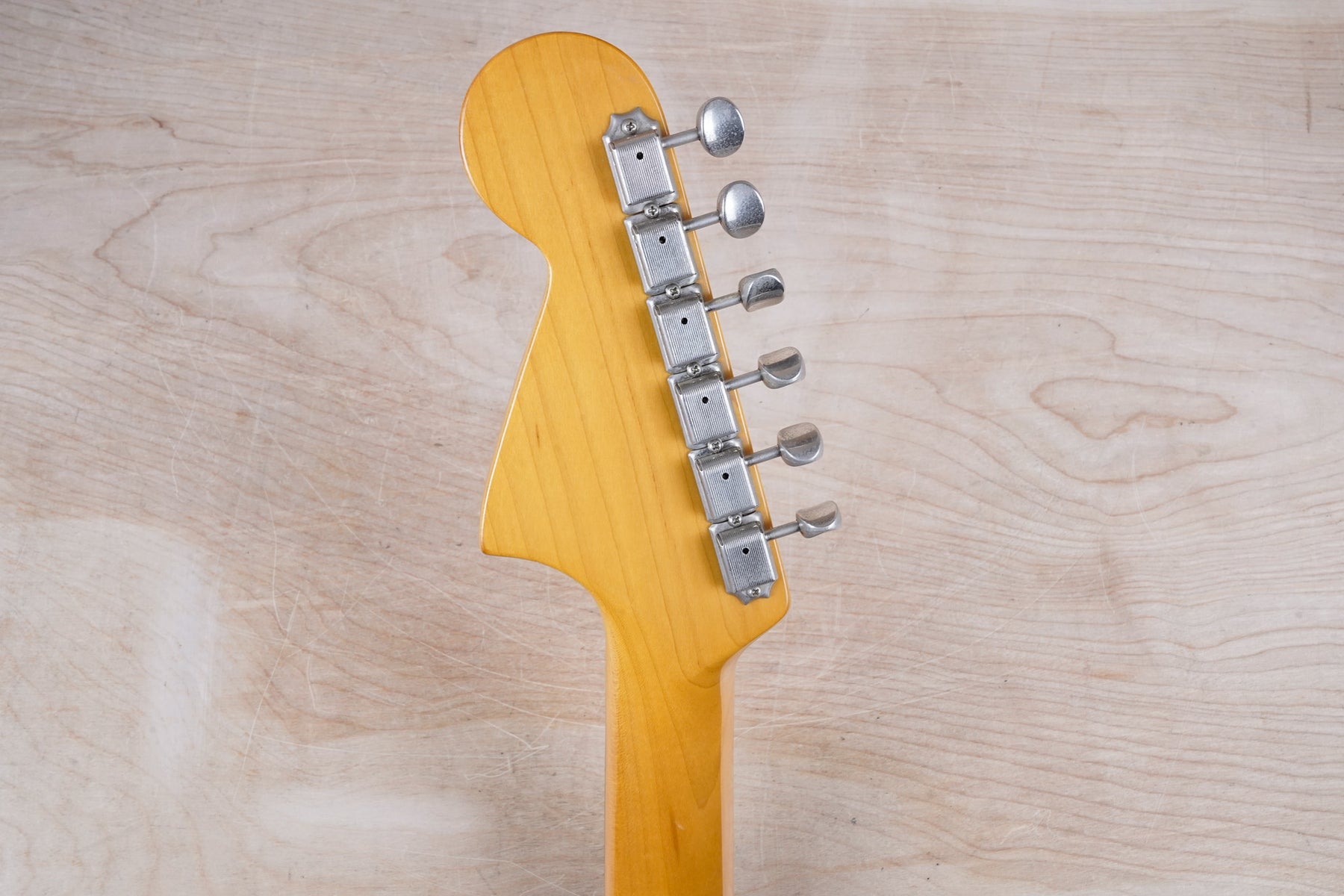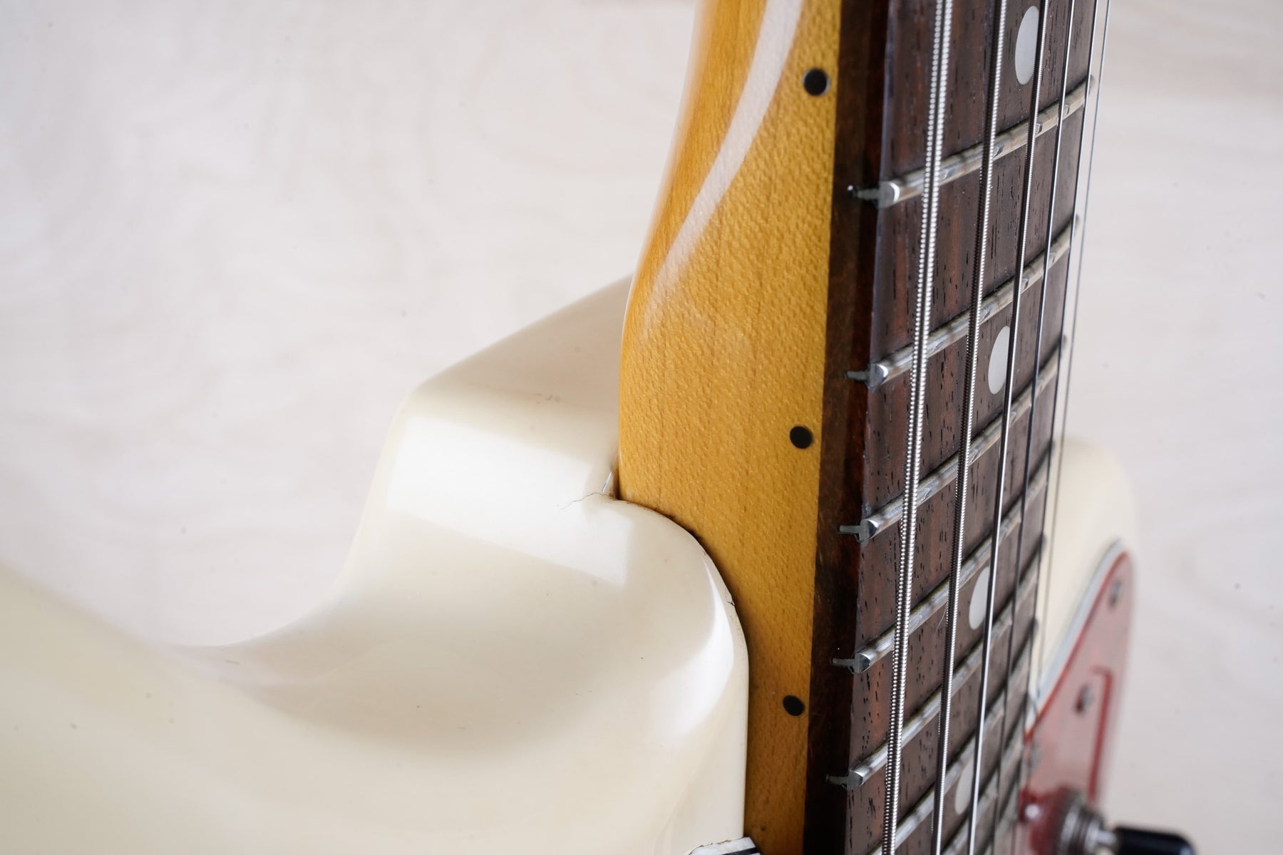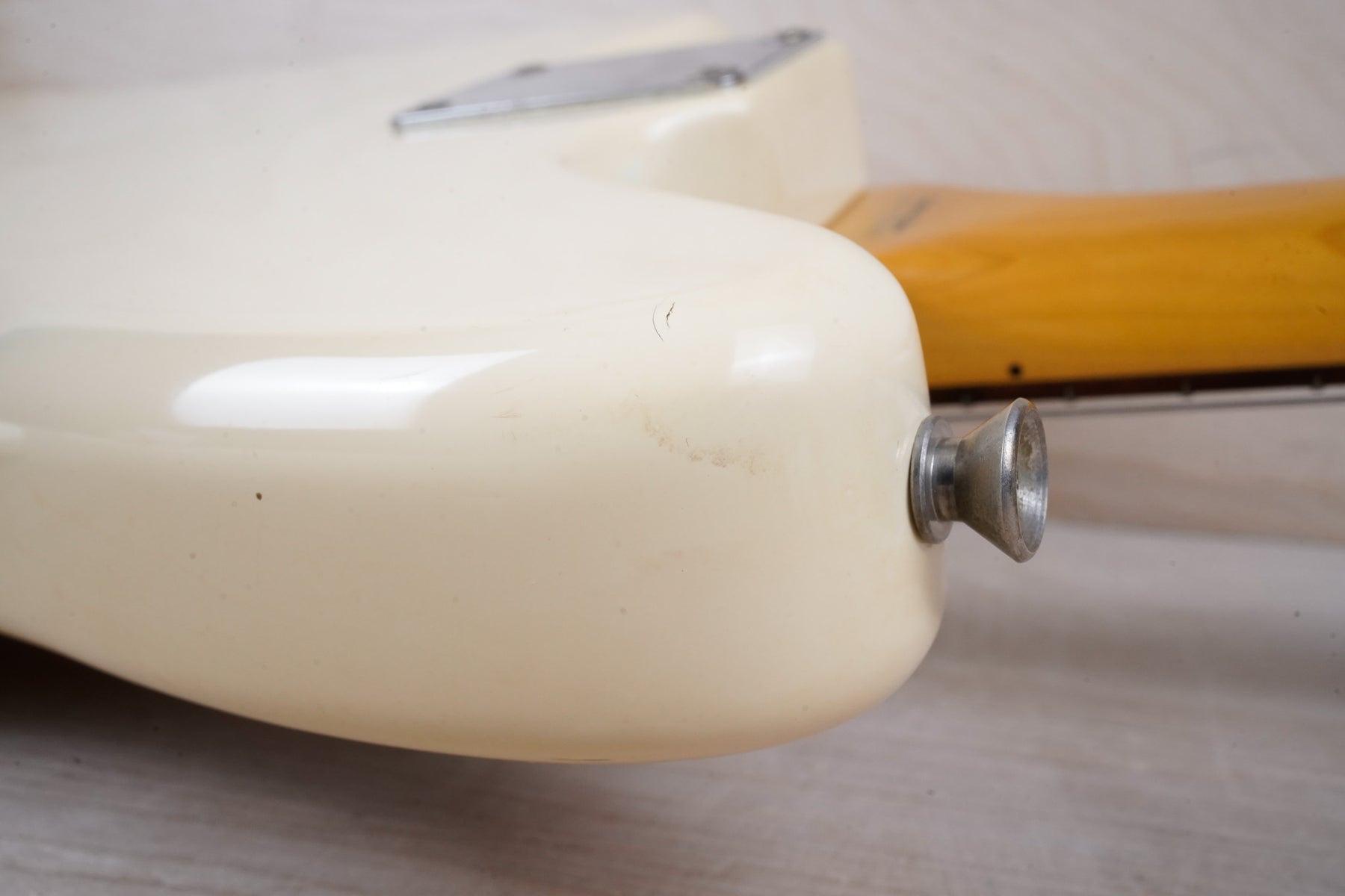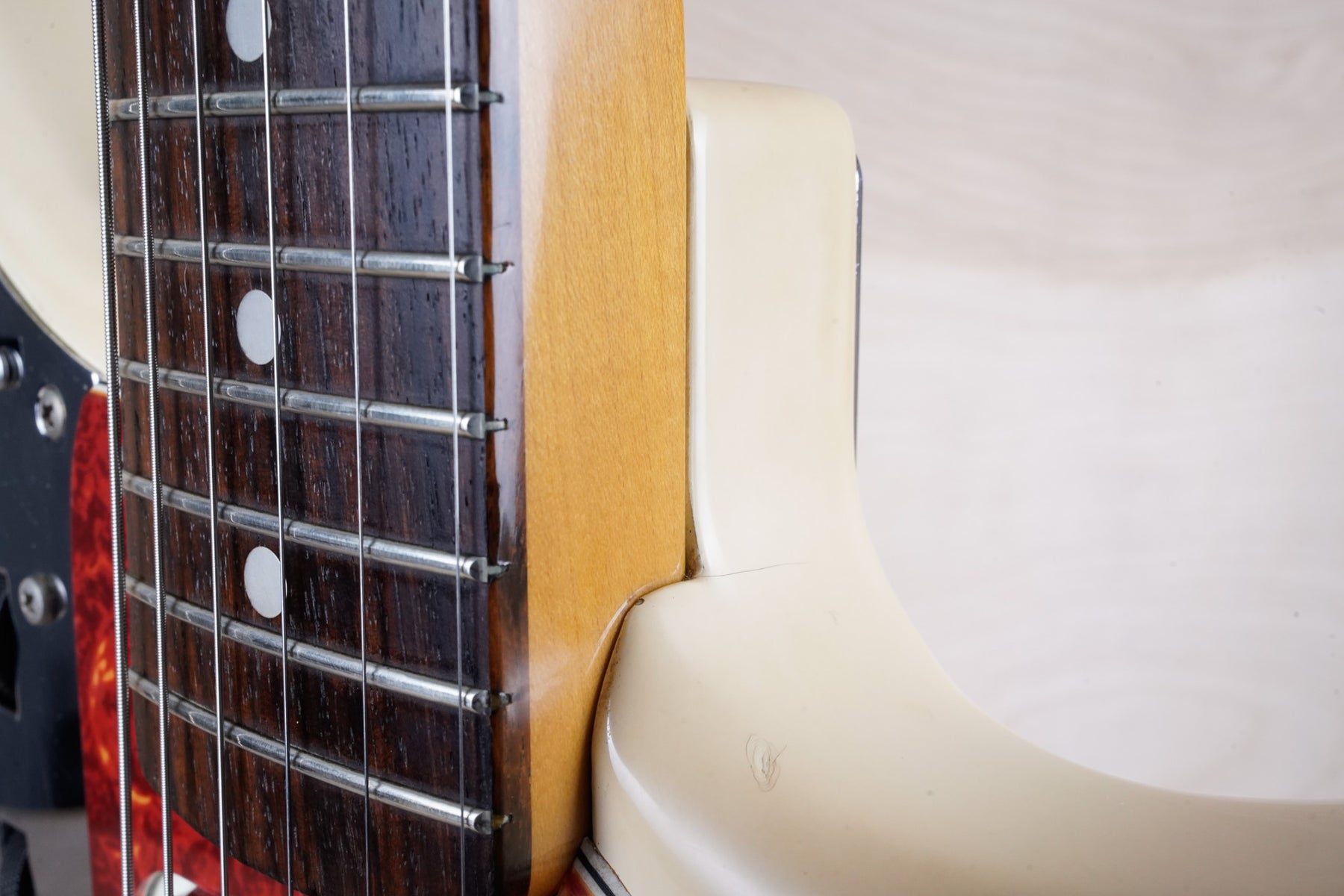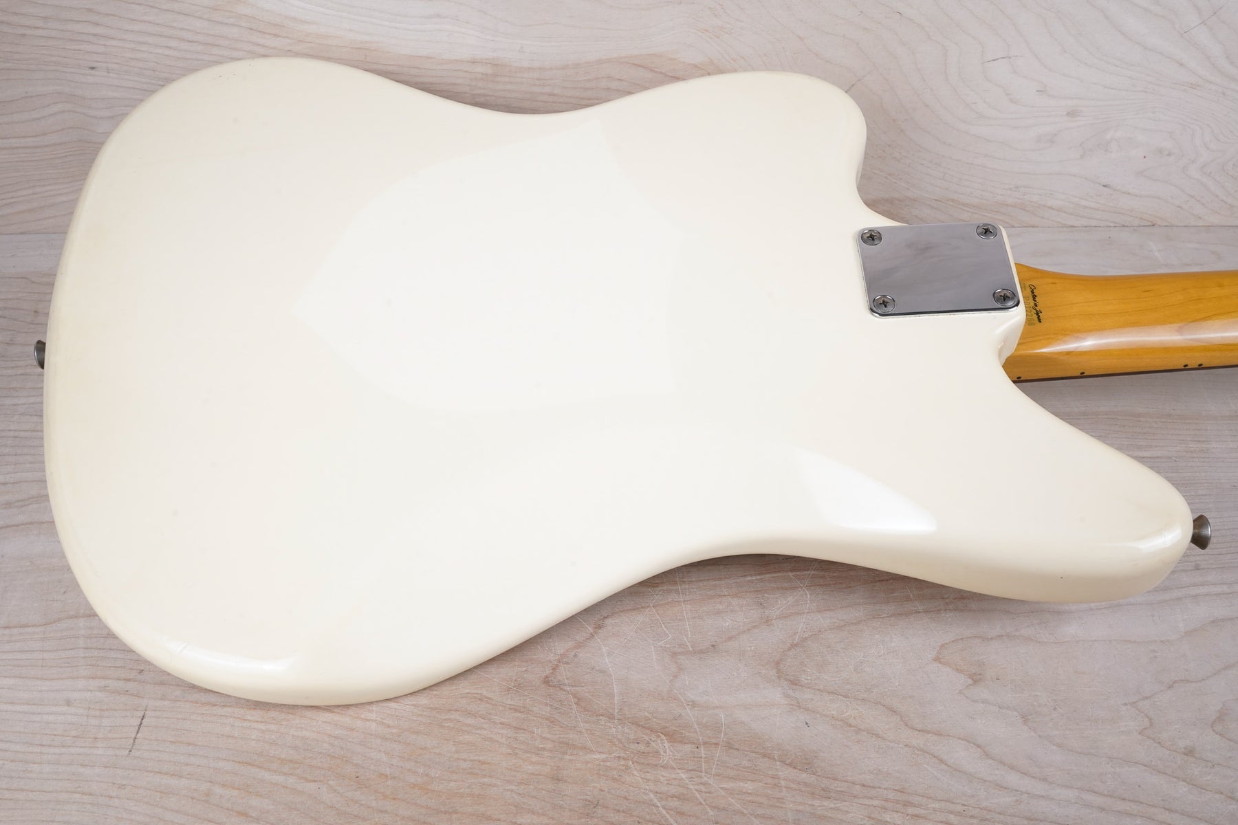 This guitar does show quite a bit of cosmetic wear from over the years that includes various surface scratches, scuffs, and dents throughout the body, particularly along the sides, with additional dings along the back of the neck and headstock. There's also a few finish chips along the sides of the body that appear to have been filled and sealed off. The Olympic White finish has yellowed from over time and there's an imprint on the back of the body from where a large sticker had been placed at one point in time. The hardware also shows normal light tarnishing. The frets are used but otherwise still play great and the electronics work as they should.