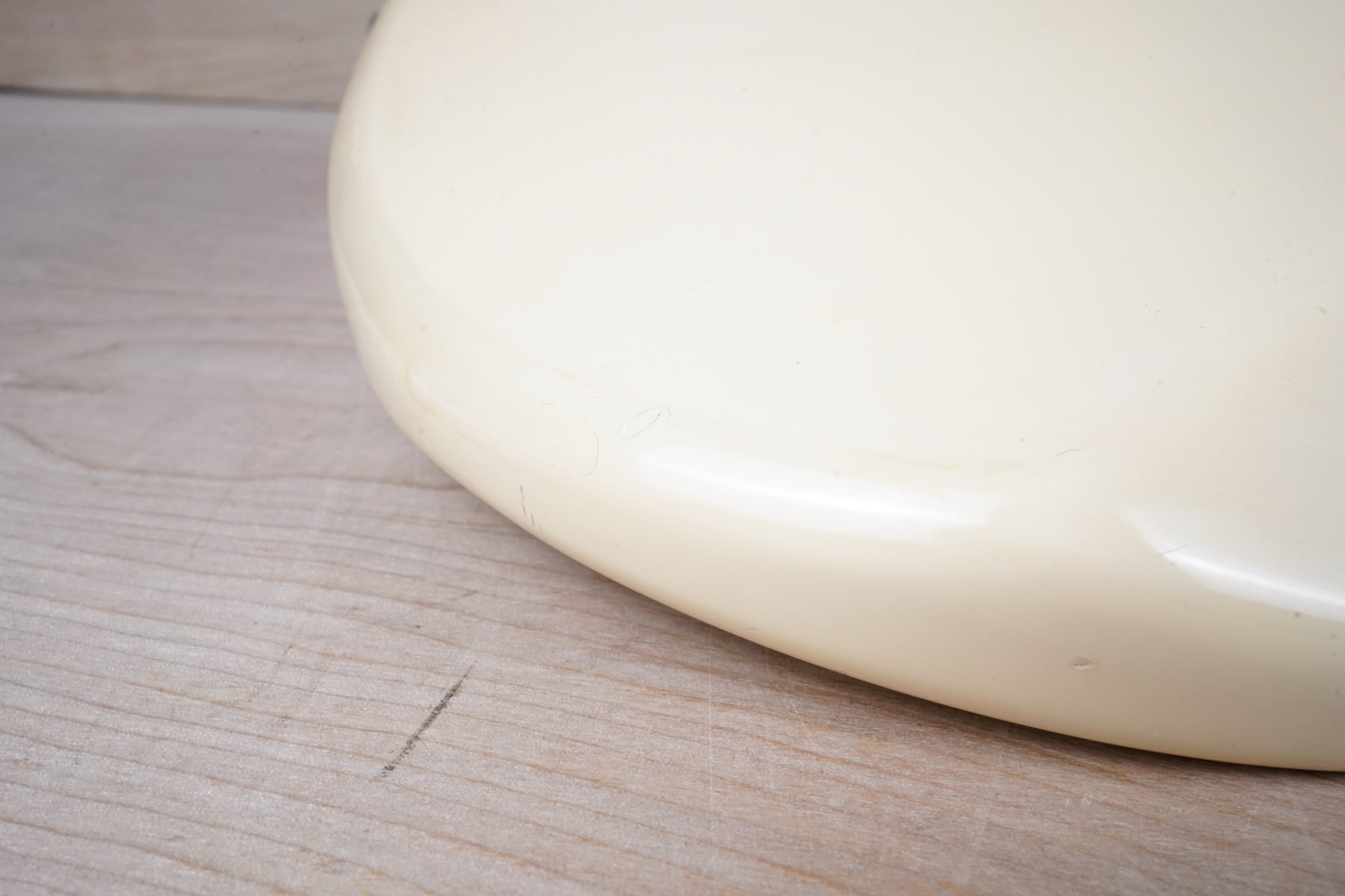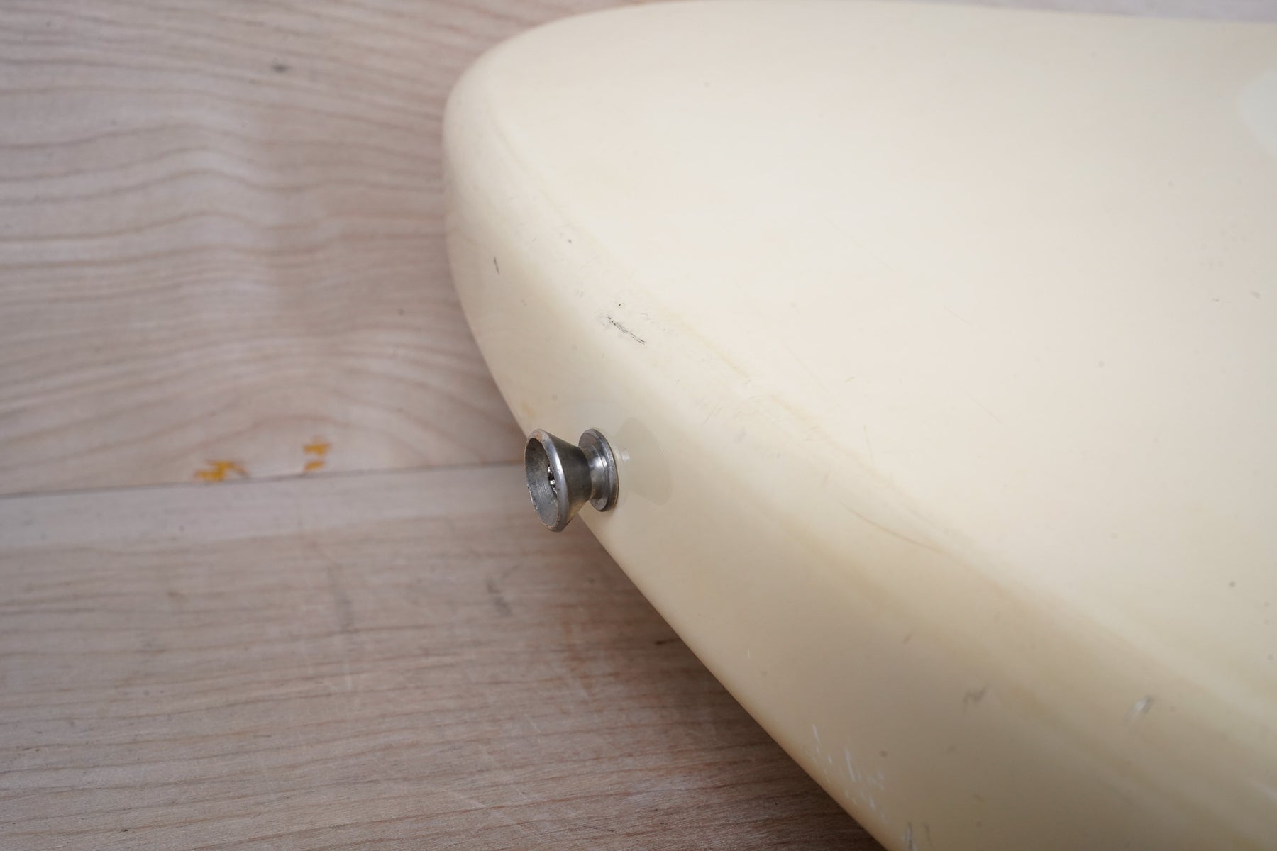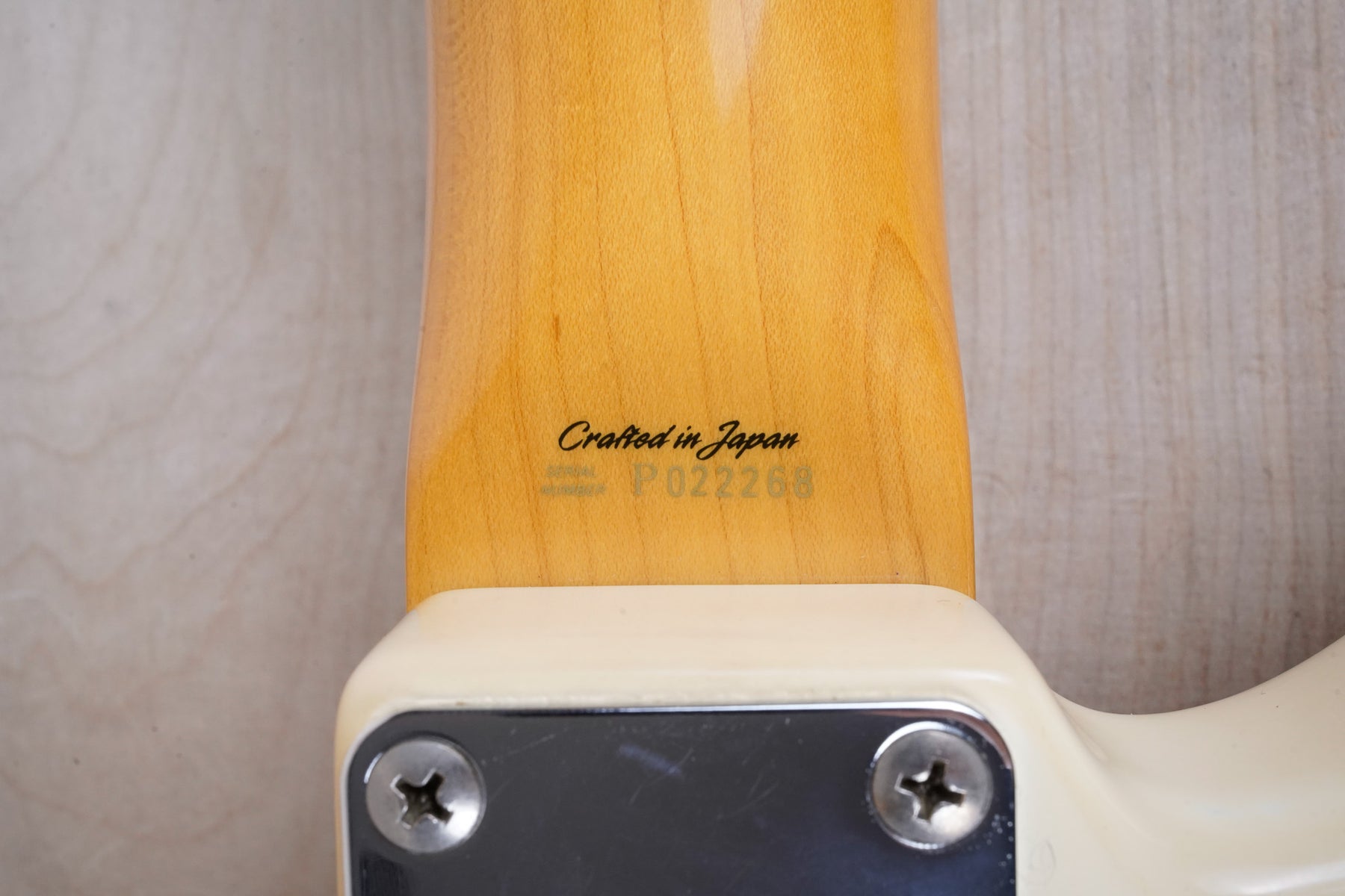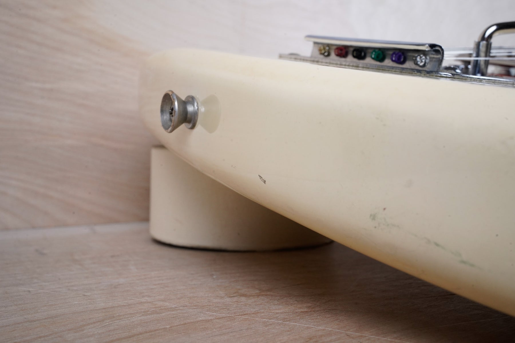 This guitar does show quite a bit of cosmetic wear from over the years that includes various surface scratches, scuffs, and dents throughout the body, particularly along the sides, with additional dings along the back of the neck and headstock. There's also a few finish chips along the sides of the body that appear to have been filled and sealed off. The Olympic White finish has yellowed from over time and there's an imprint on the back of the body from where a large sticker had been placed at one point in time. The hardware also shows normal light tarnishing. The frets are used but otherwise still play great and the electronics work as they should.