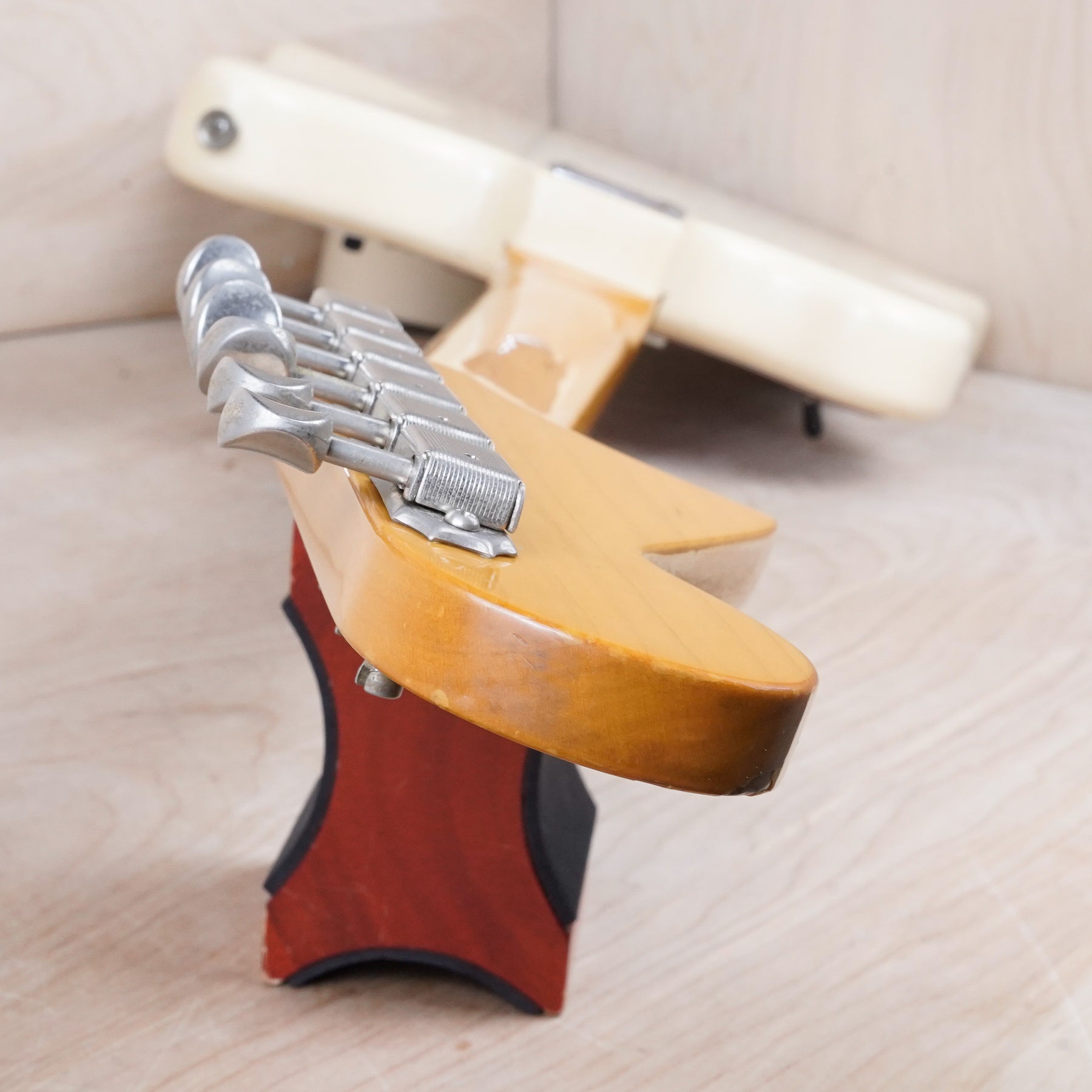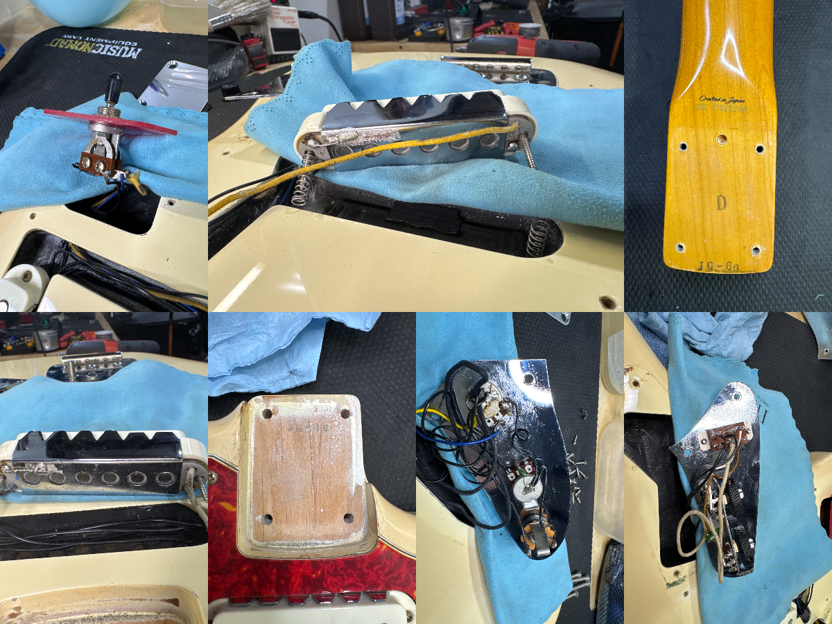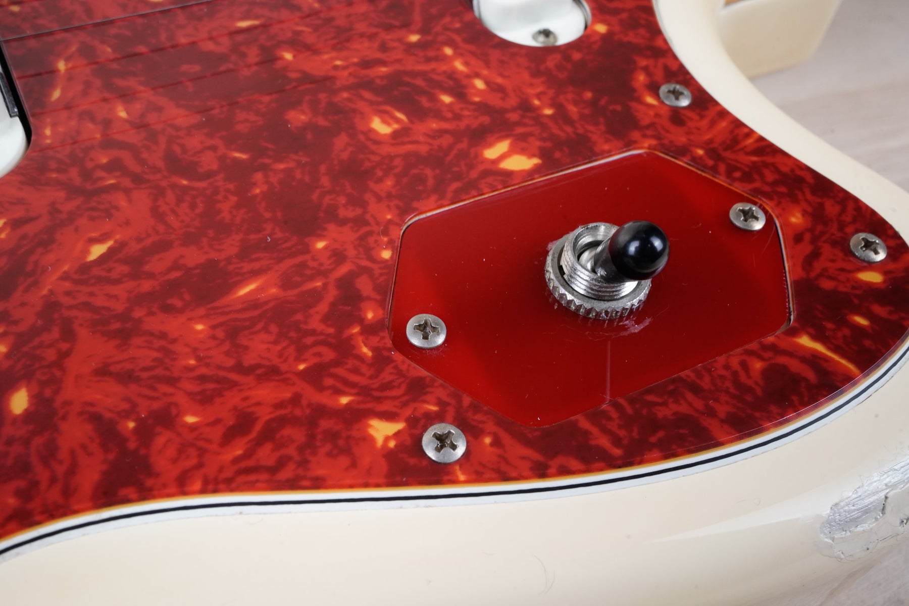 The guitar has been modded for a 3-way pickup selector in the lower bout in place of the circuit switches. This guitar otherwise appears to be original.