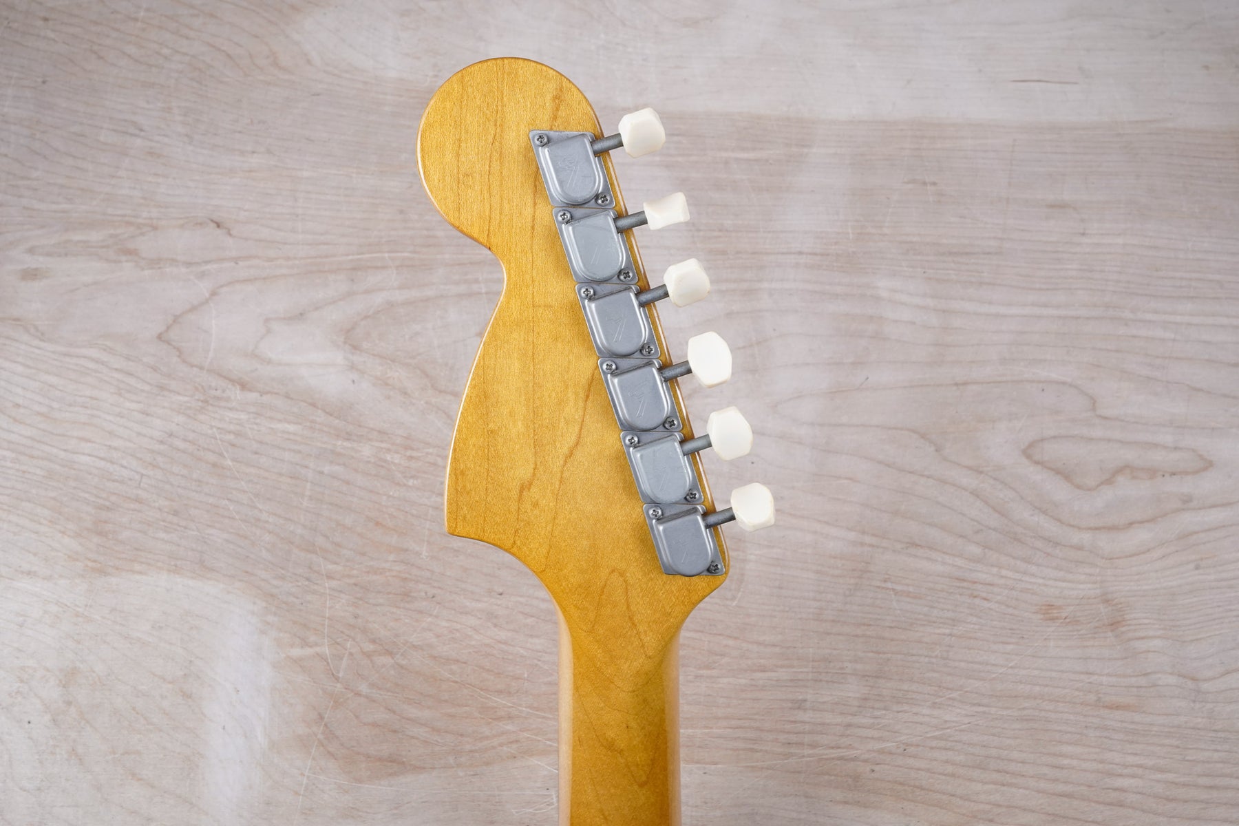 This crafted in Japan Fender MG-65 Mustang Reissue plays and sounds great! The guitar is comprised of a poplar body, "C" shape maple neck, and rosewood fretboard. This later iteration sports factory-equipped Fender USA Vintage grey bobbin Mustang pickups, which sound fantastic!