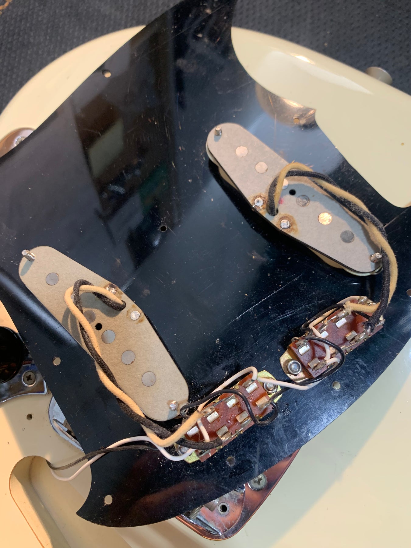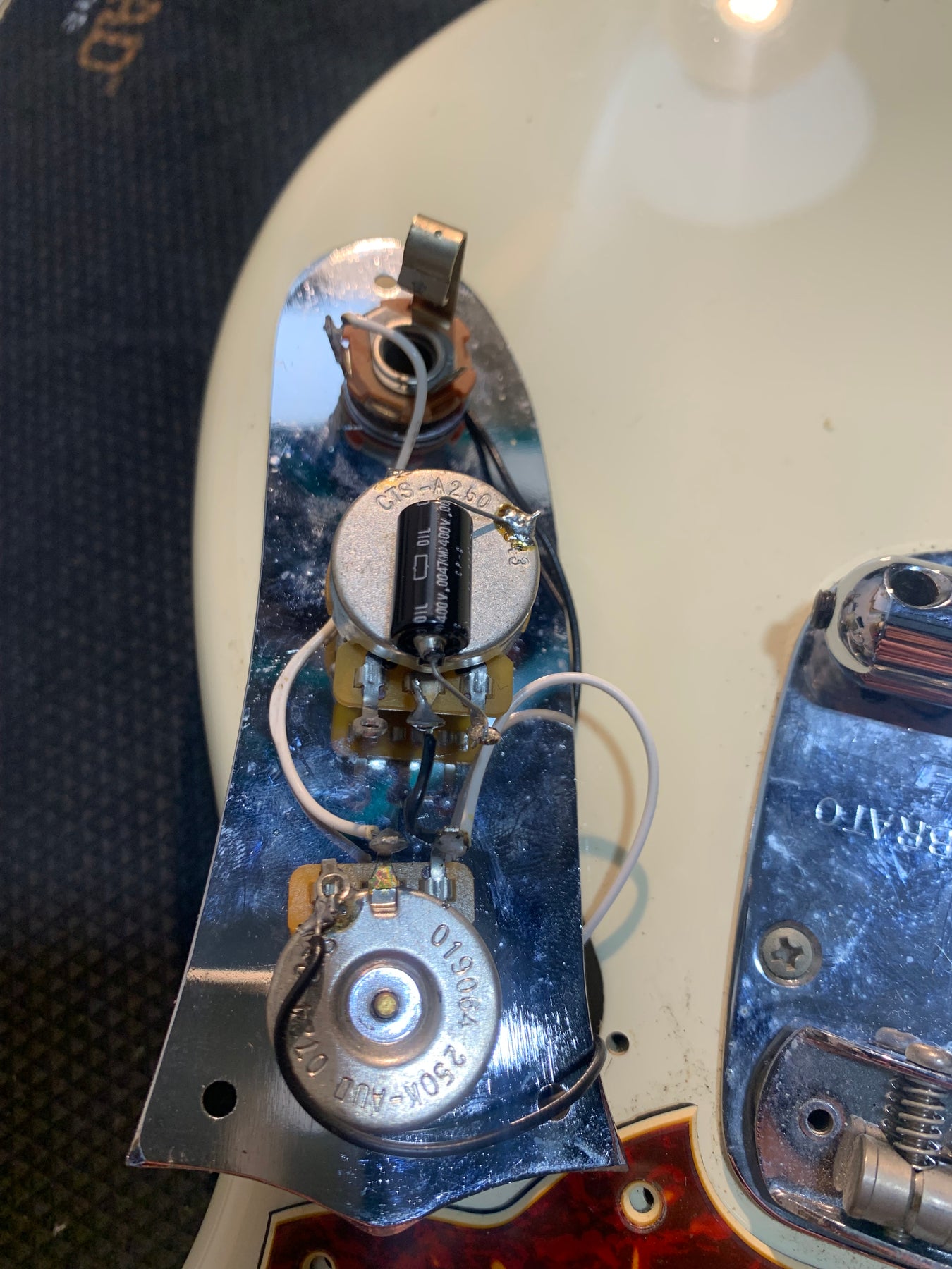 The pots and capacitor are later replacements,, his guitar otherwise appears to be original.