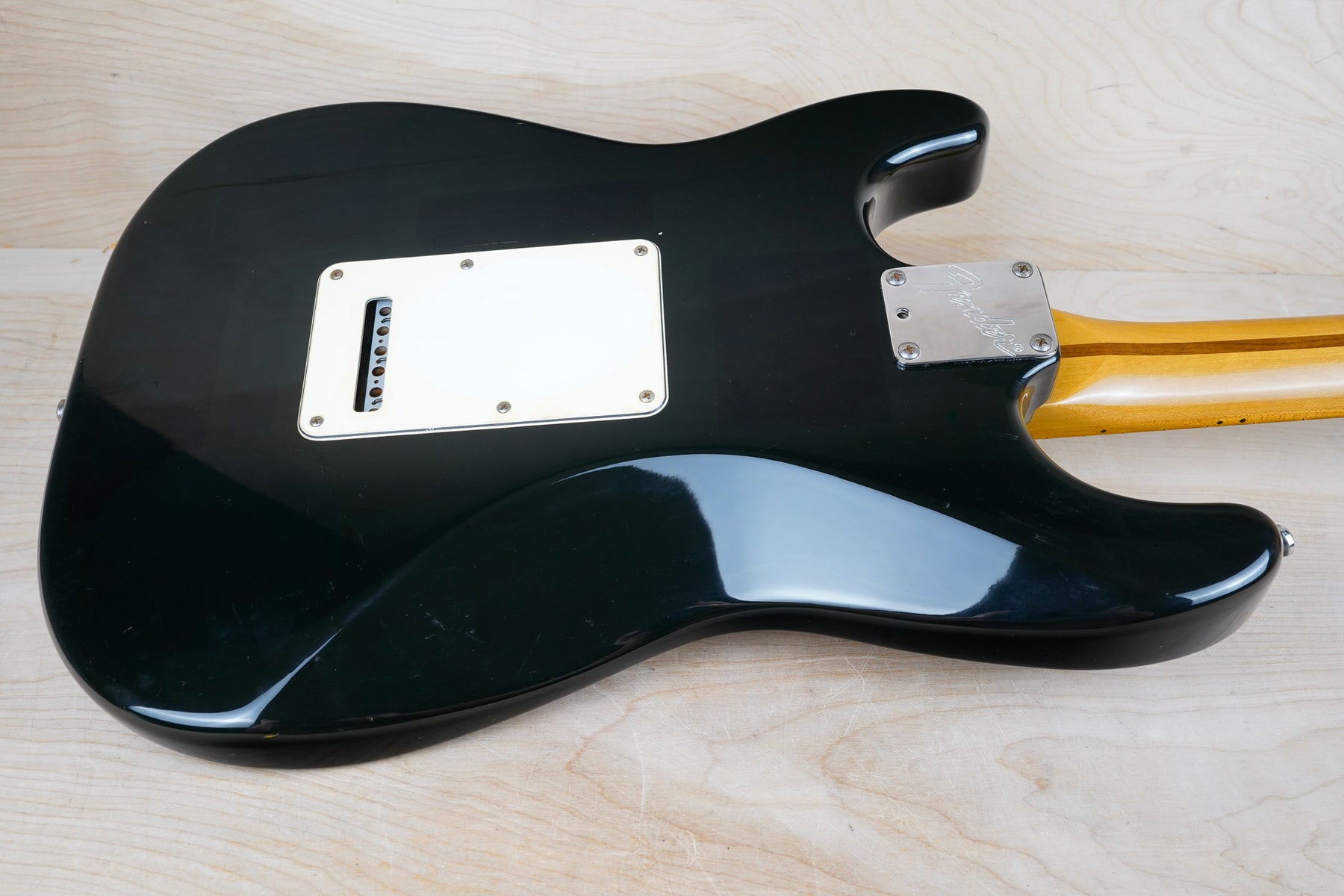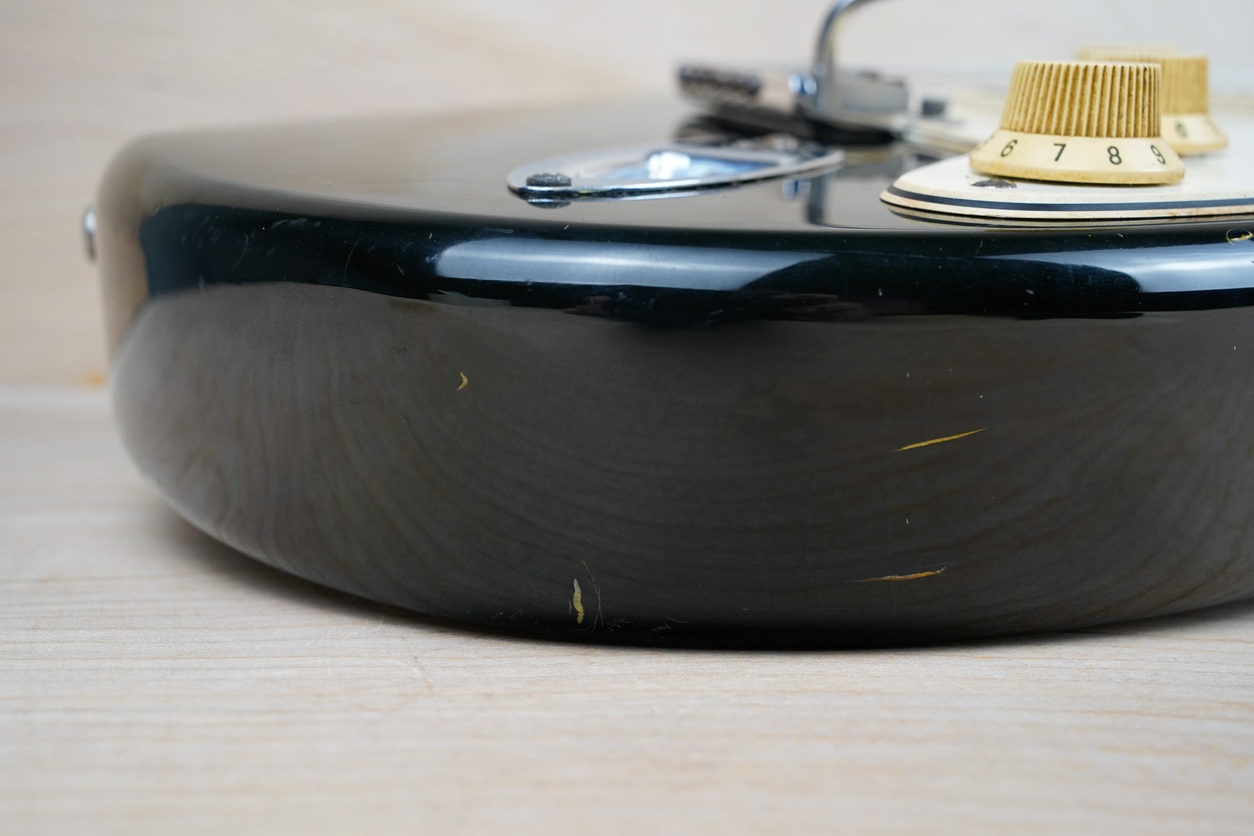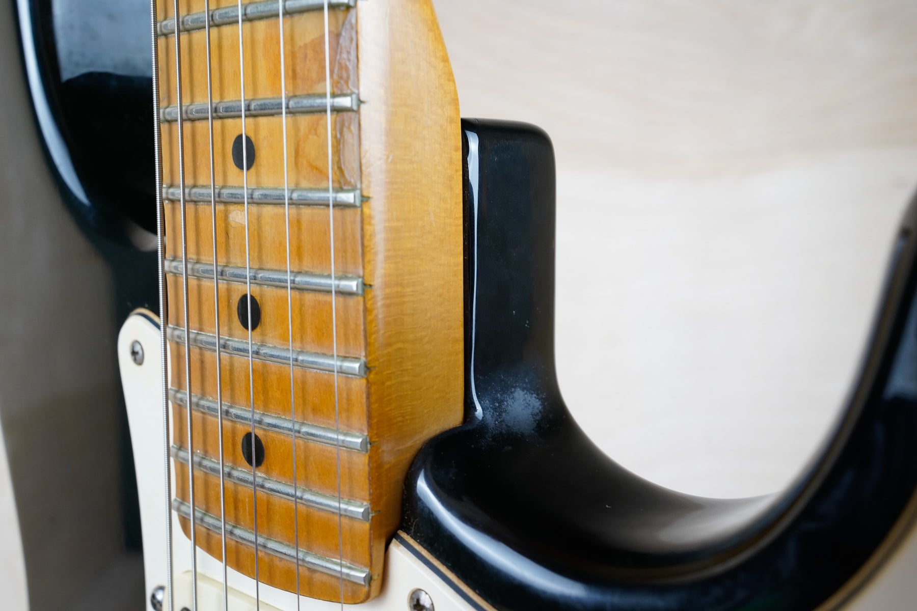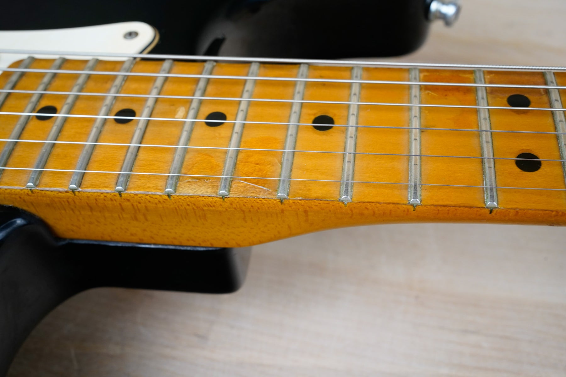 This guitar does show some cosmetic wear from over the years that includes various surface scratches, scuffs, and dents throughout the body with additional dings along the back of the neck and headstock. The maple fretboard particularly shows a lot of wear with various chips and some of the lacquer is starting to lift from over time, especially on the higher frets. There's also some faint imprints throughout the body from where stickers had been placed at one point in time. The plastics have yellowed significantly and the hardware shows normal tarnishing. The frets are used but otherwise still play great and the electronics work as they should.