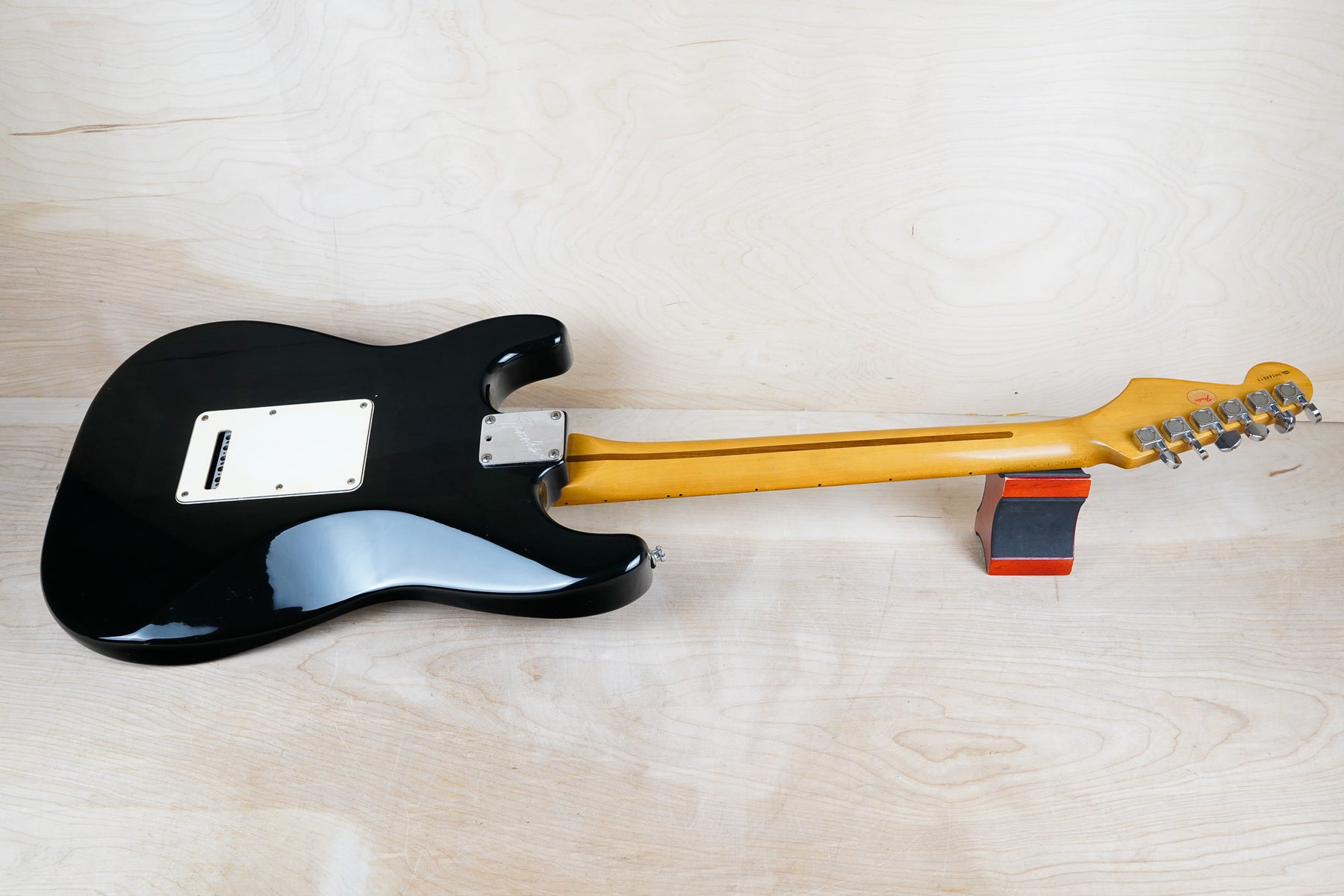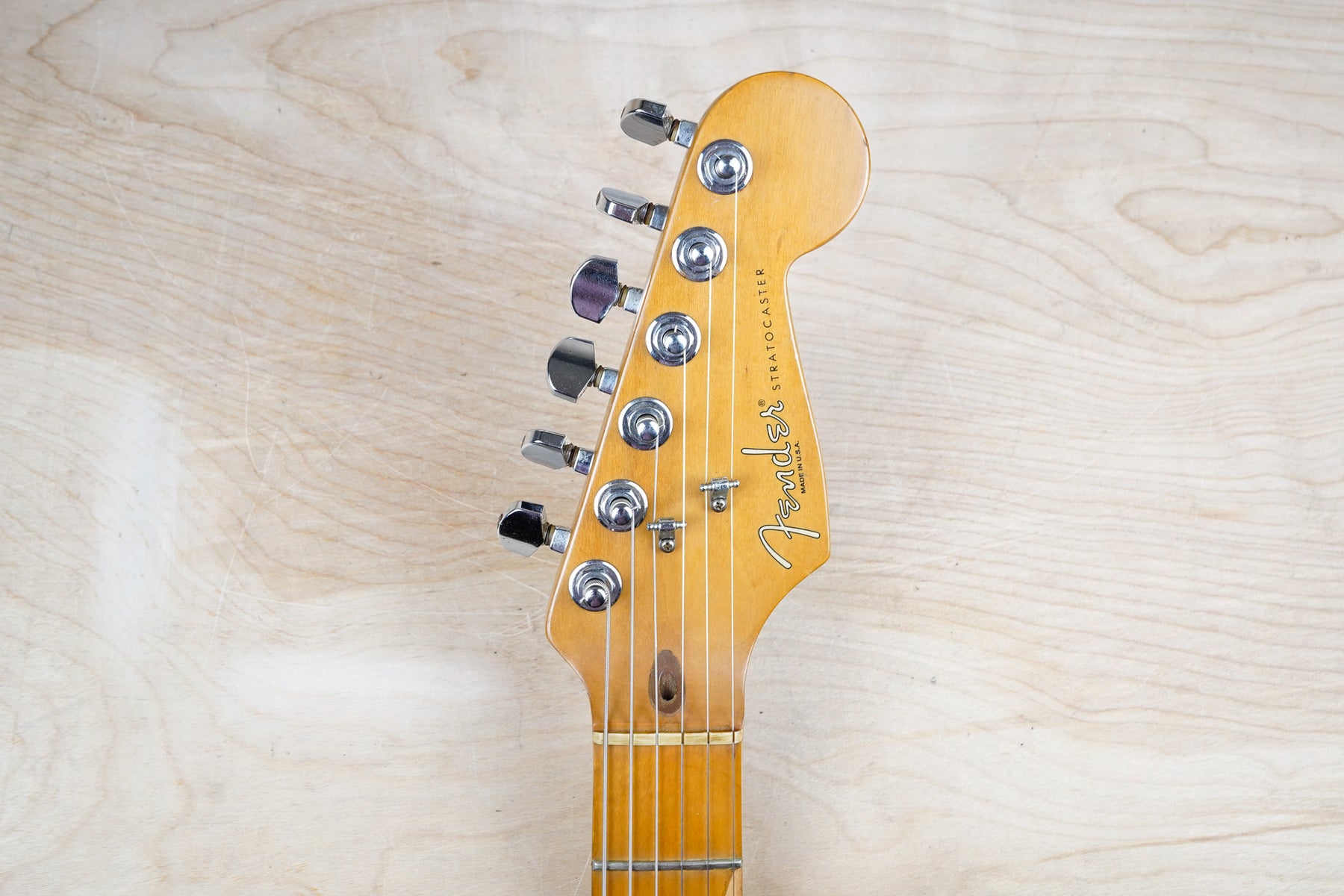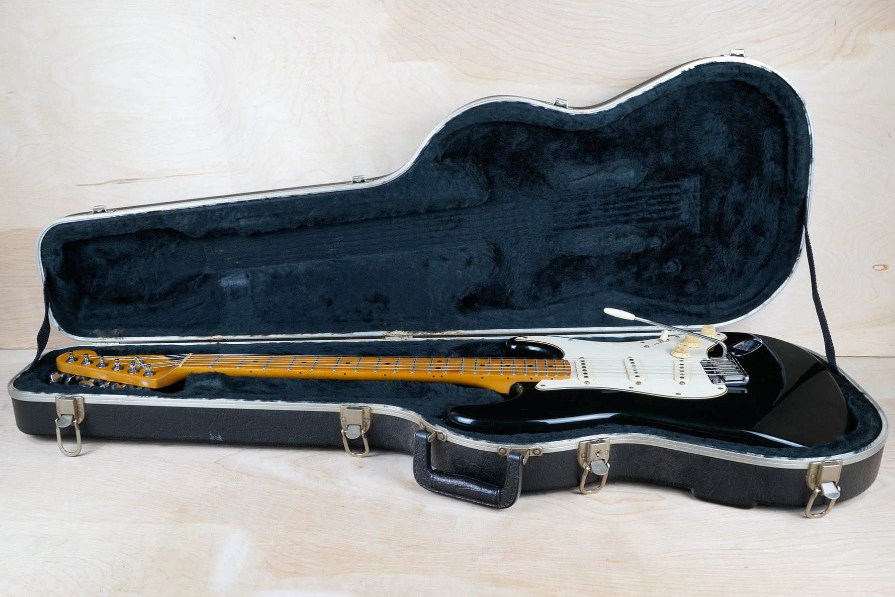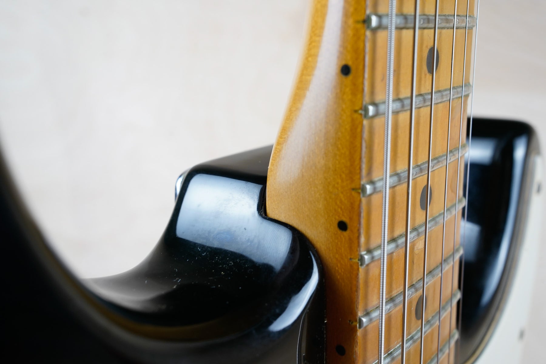 This guitar does show some cosmetic wear from over the years that includes various surface scratches, scuffs, and dents throughout the body with additional dings along the back of the neck and headstock. The maple fretboard particularly shows a lot of wear with various chips and some of the lacquer is starting to lift from over time, especially on the higher frets. There's also some faint imprints throughout the body from where stickers had been placed at one point in time. The plastics have yellowed significantly and the hardware shows normal tarnishing. The frets are used but otherwise still play great and the electronics work as they should.