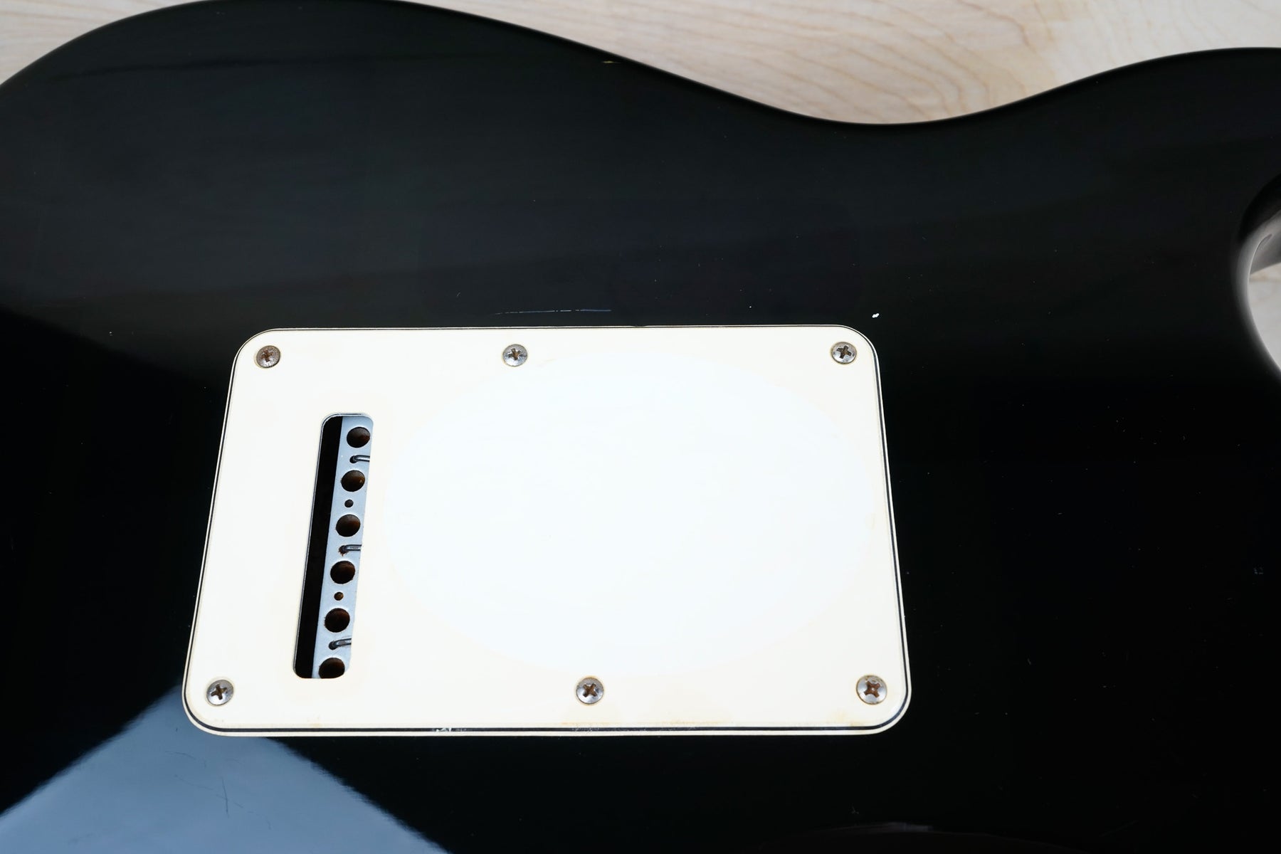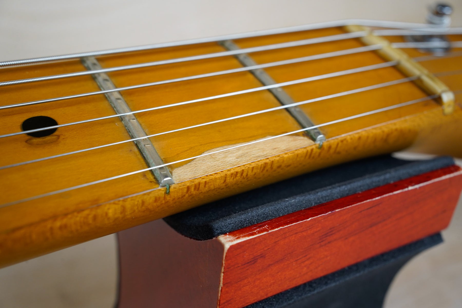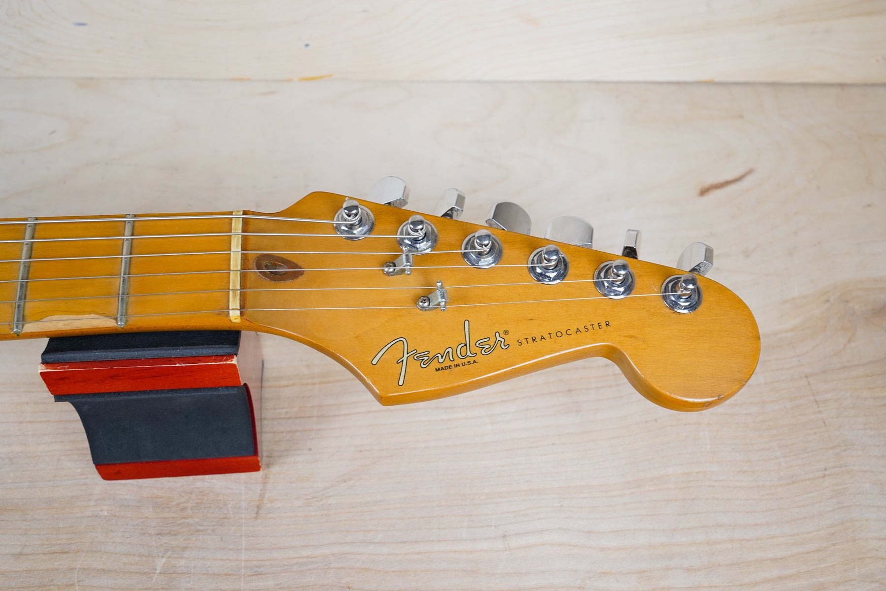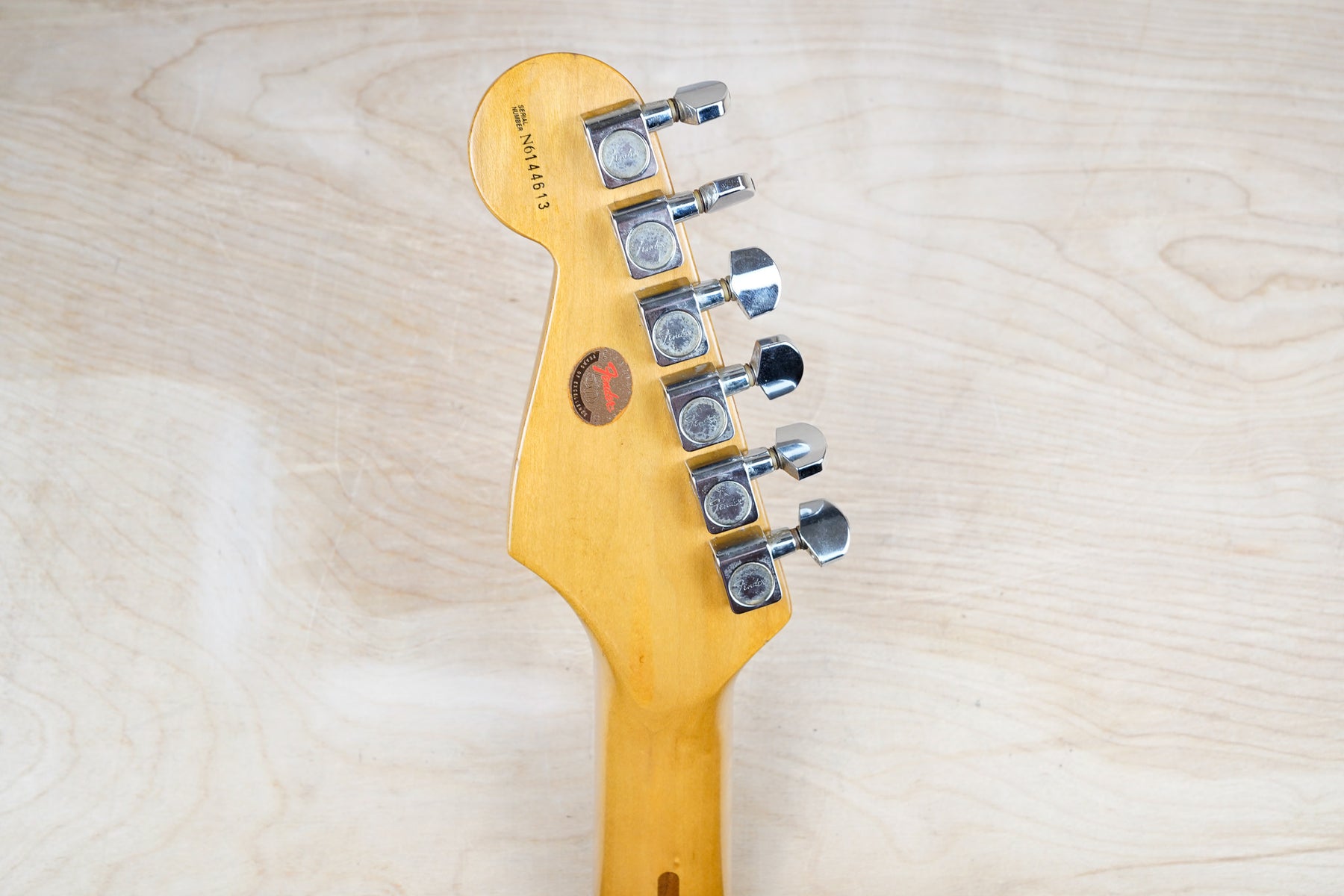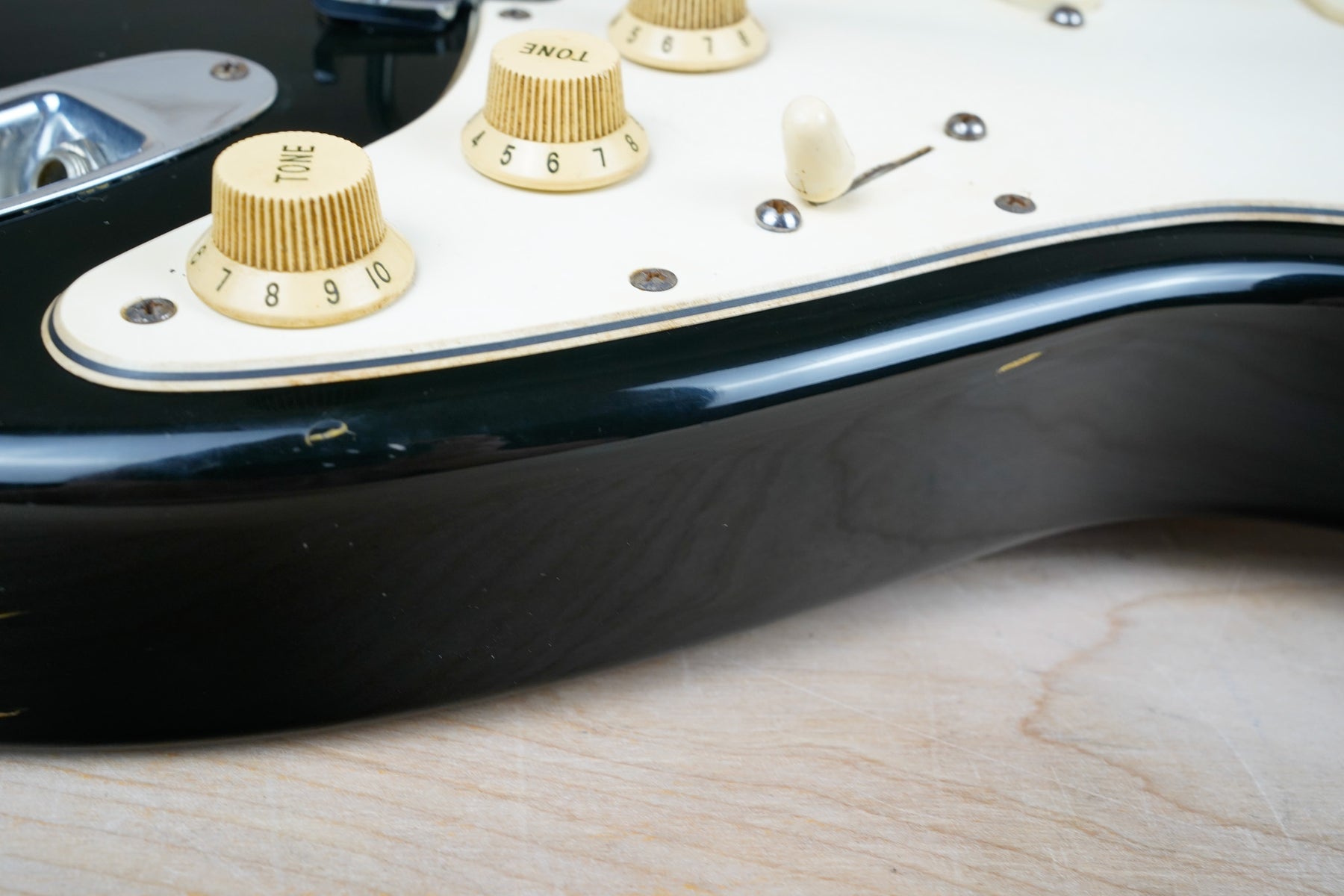 This guitar does show some cosmetic wear from over the years that includes various surface scratches, scuffs, and dents throughout the body with additional dings along the back of the neck and headstock. The maple fretboard particularly shows a lot of wear with various chips and some of the lacquer is starting to lift from over time, especially on the higher frets. There's also some faint imprints throughout the body from where stickers had been placed at one point in time. The plastics have yellowed significantly and the hardware shows normal tarnishing. The frets are used but otherwise still play great and the electronics work as they should.