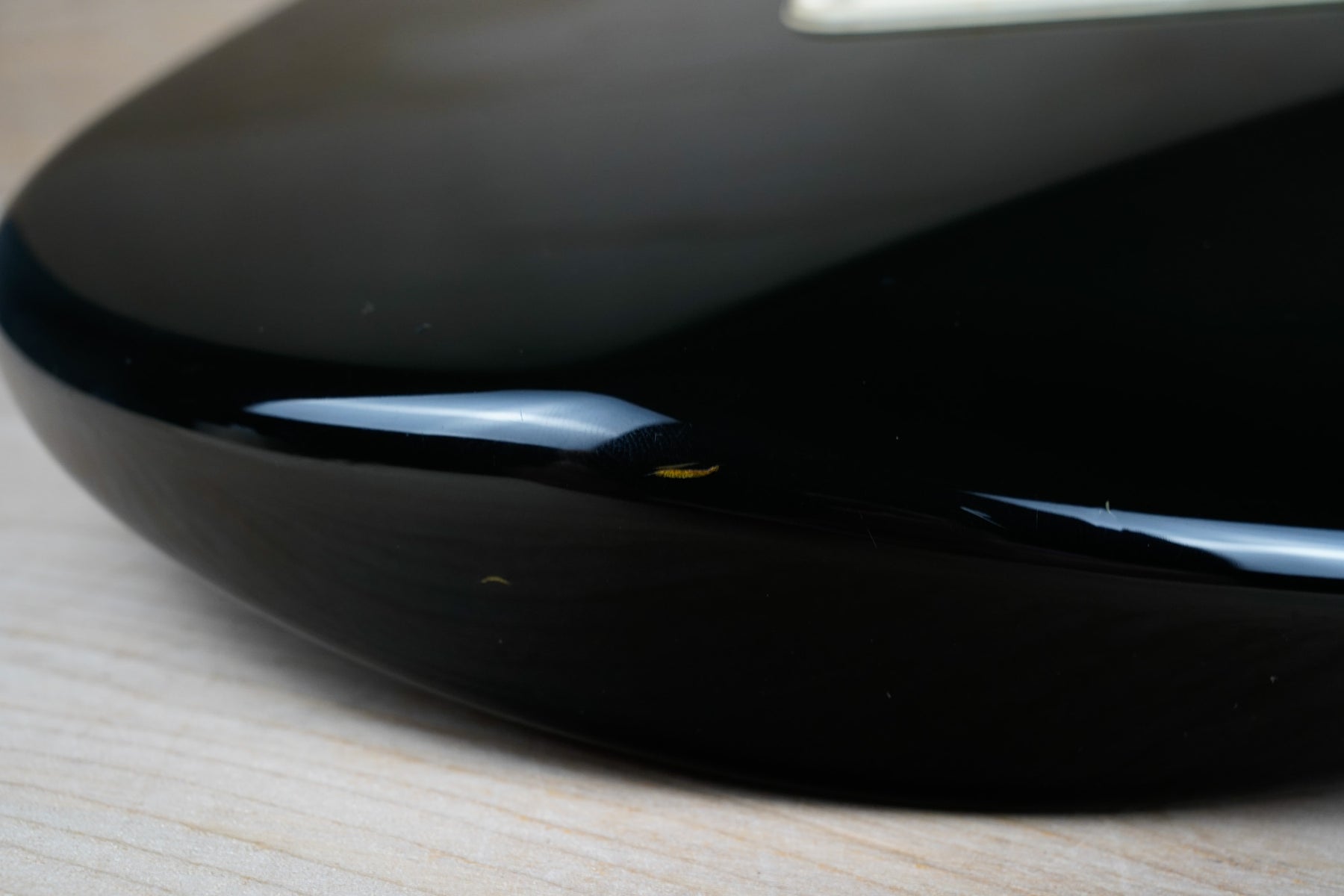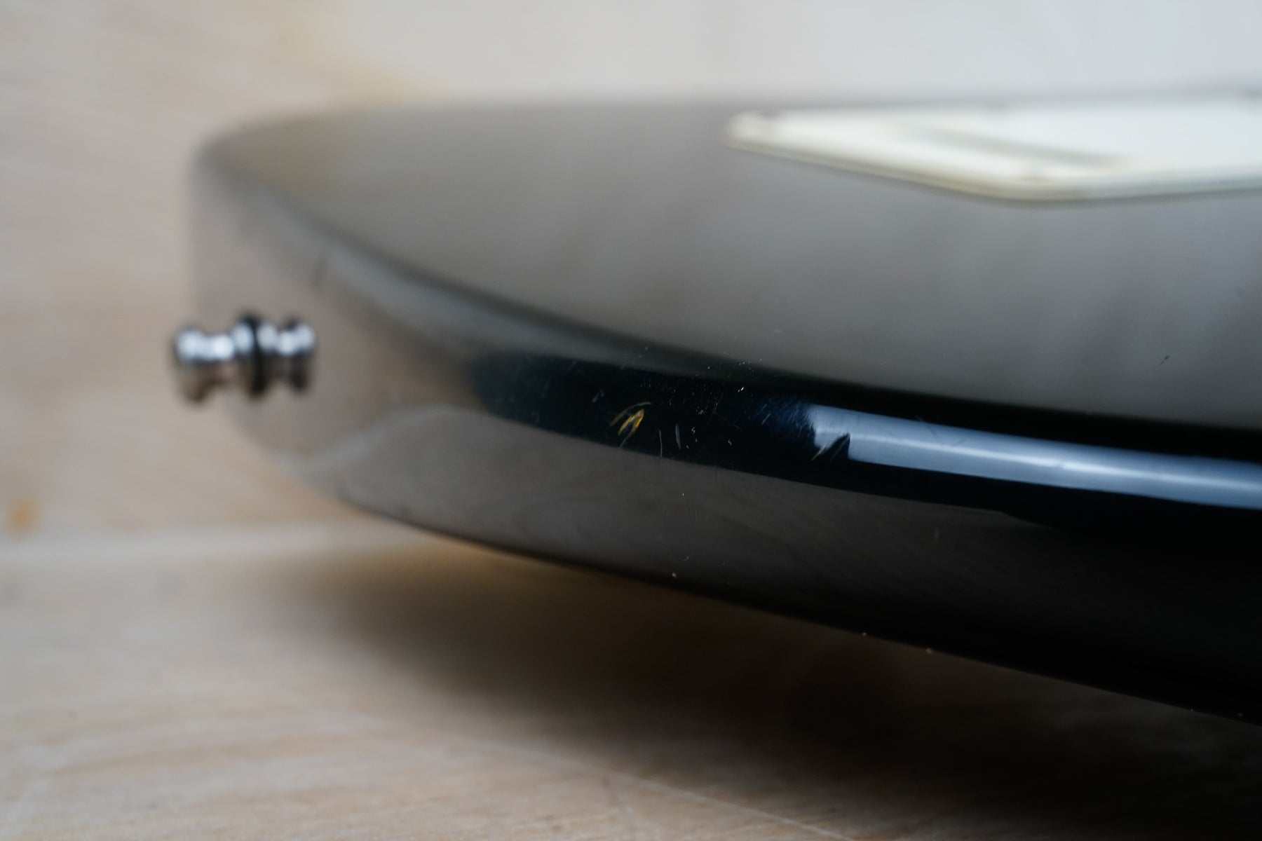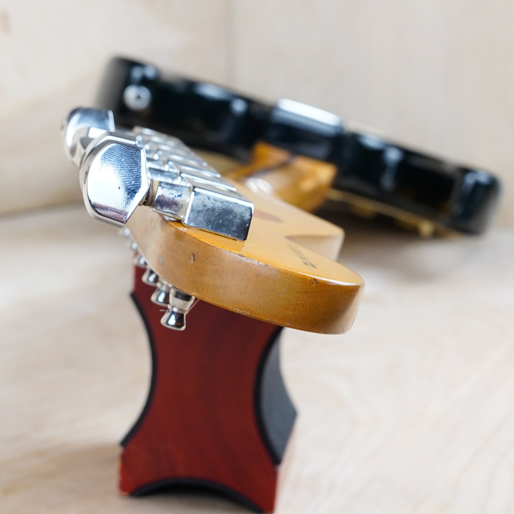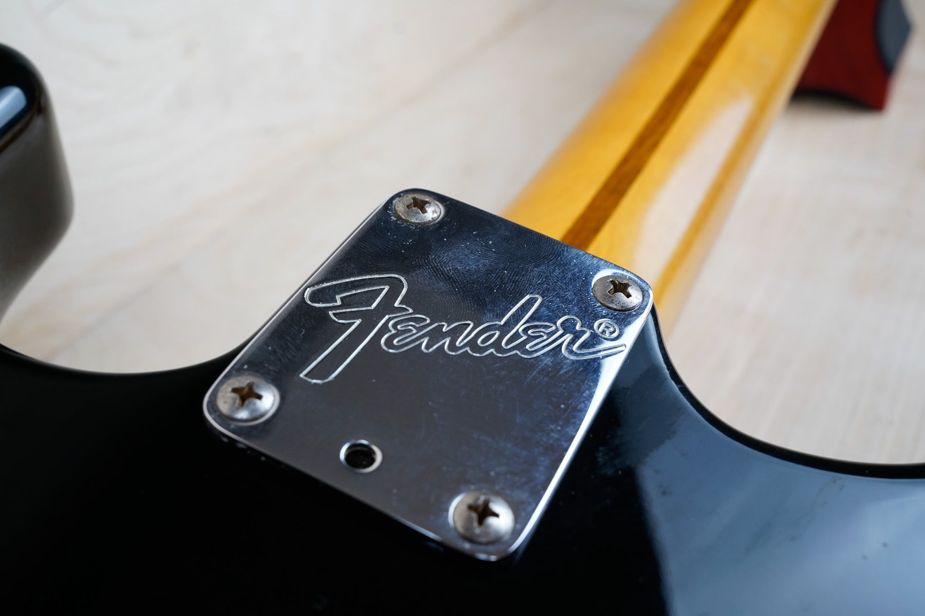 This guitar does show some cosmetic wear from over the years that includes various surface scratches, scuffs, and dents throughout the body with additional dings along the back of the neck and headstock. The maple fretboard particularly shows a lot of wear with various chips and some of the lacquer is starting to lift from over time, especially on the higher frets. There's also some faint imprints throughout the body from where stickers had been placed at one point in time. The plastics have yellowed significantly and the hardware shows normal tarnishing. The frets are used but otherwise still play great and the electronics work as they should.