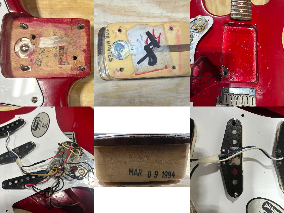 This middle pickup has been swapped to a Fender Custom Shop Fat 50s. The guitar is currently wired for the lower tone pot to control the bridge and middle, and the upper tone pot controlling the neck pickup. The lower tone pot is a replacement, as well as much of the wiring. There is evidence the electronics have been modified a number of times on this guitar.