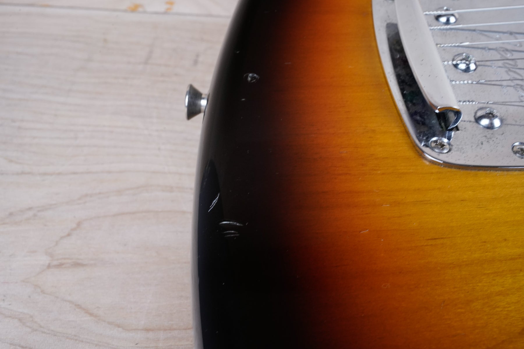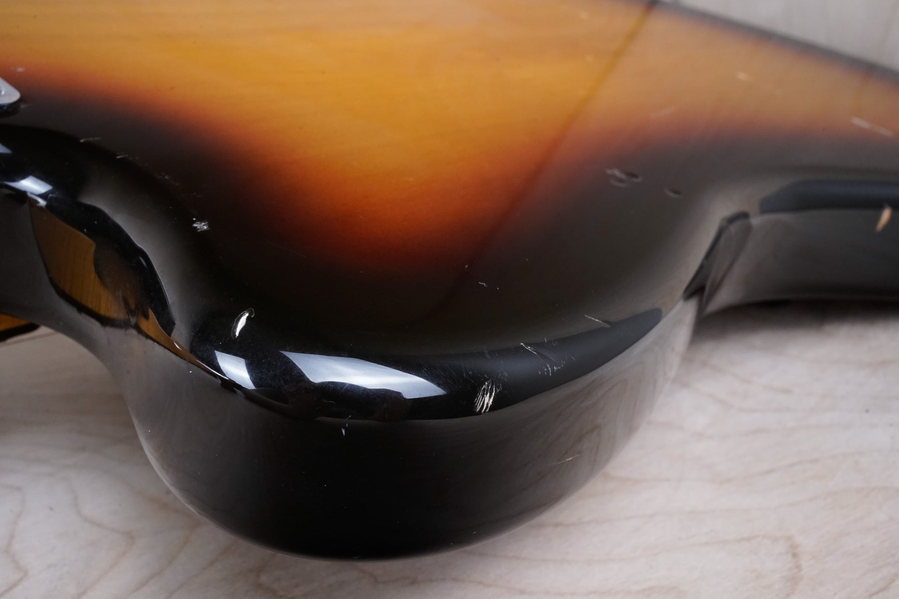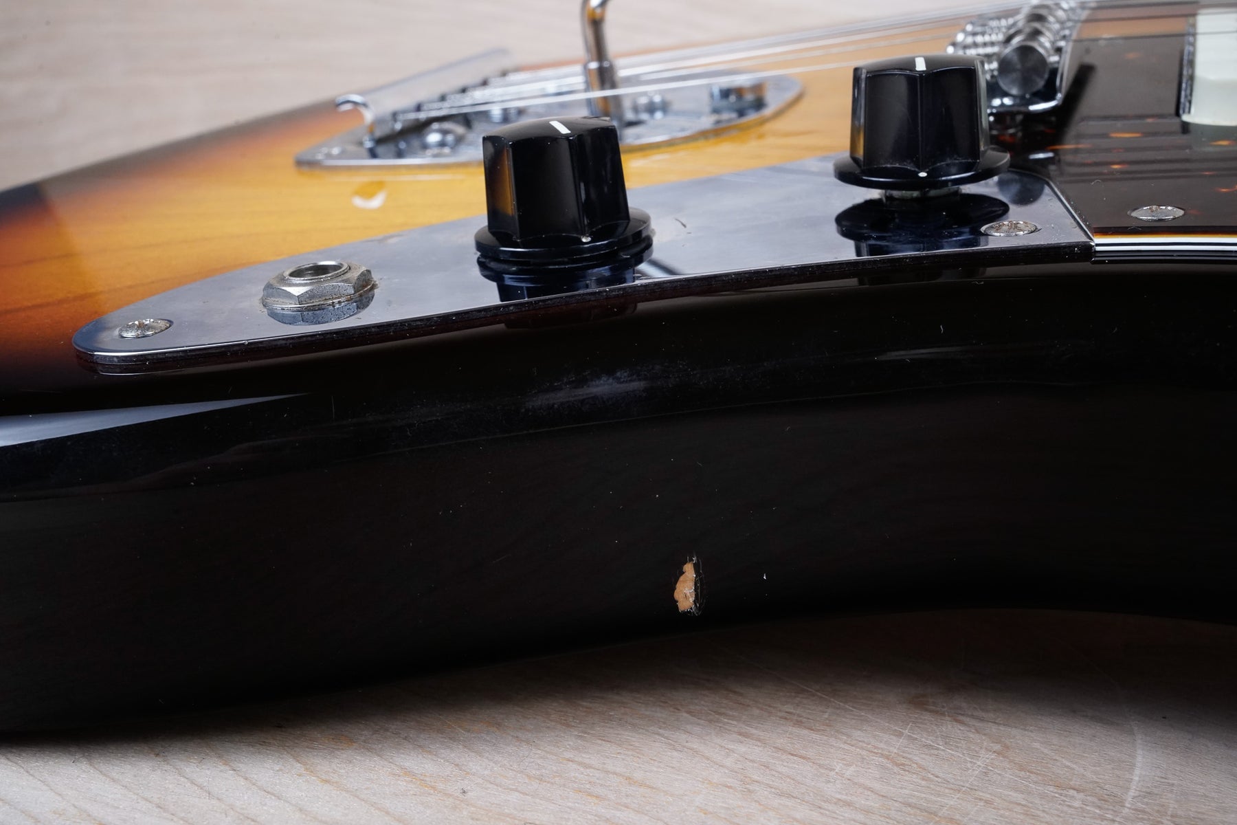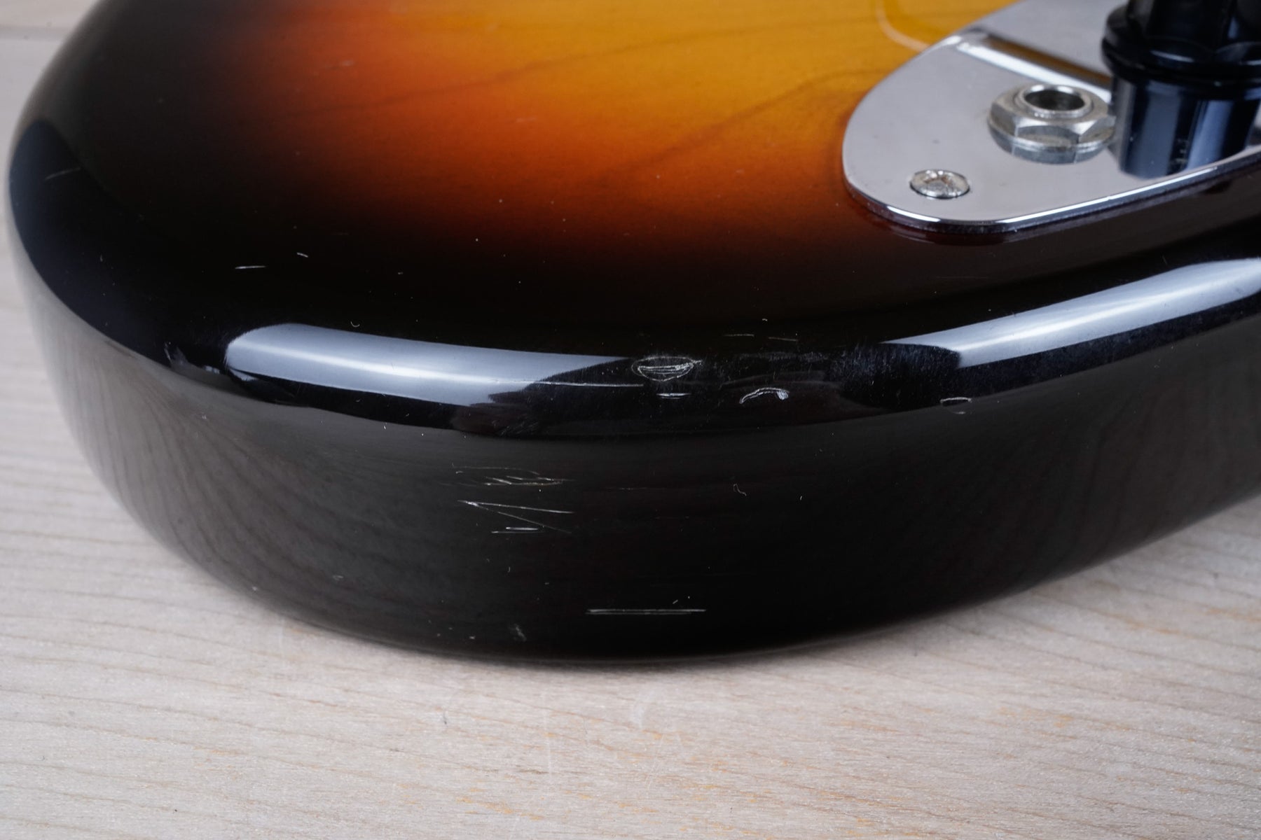 This guitar does show some cosmetic wear that includes various surface scratches, scuffs, and dents throughout the body with additional small dings along the back of the neck and headstock. Part of the Fender logo on the headstock is scuffed and the hardware shows some tarnish from over time. The frets are used but still play great and the electronics work as they should.