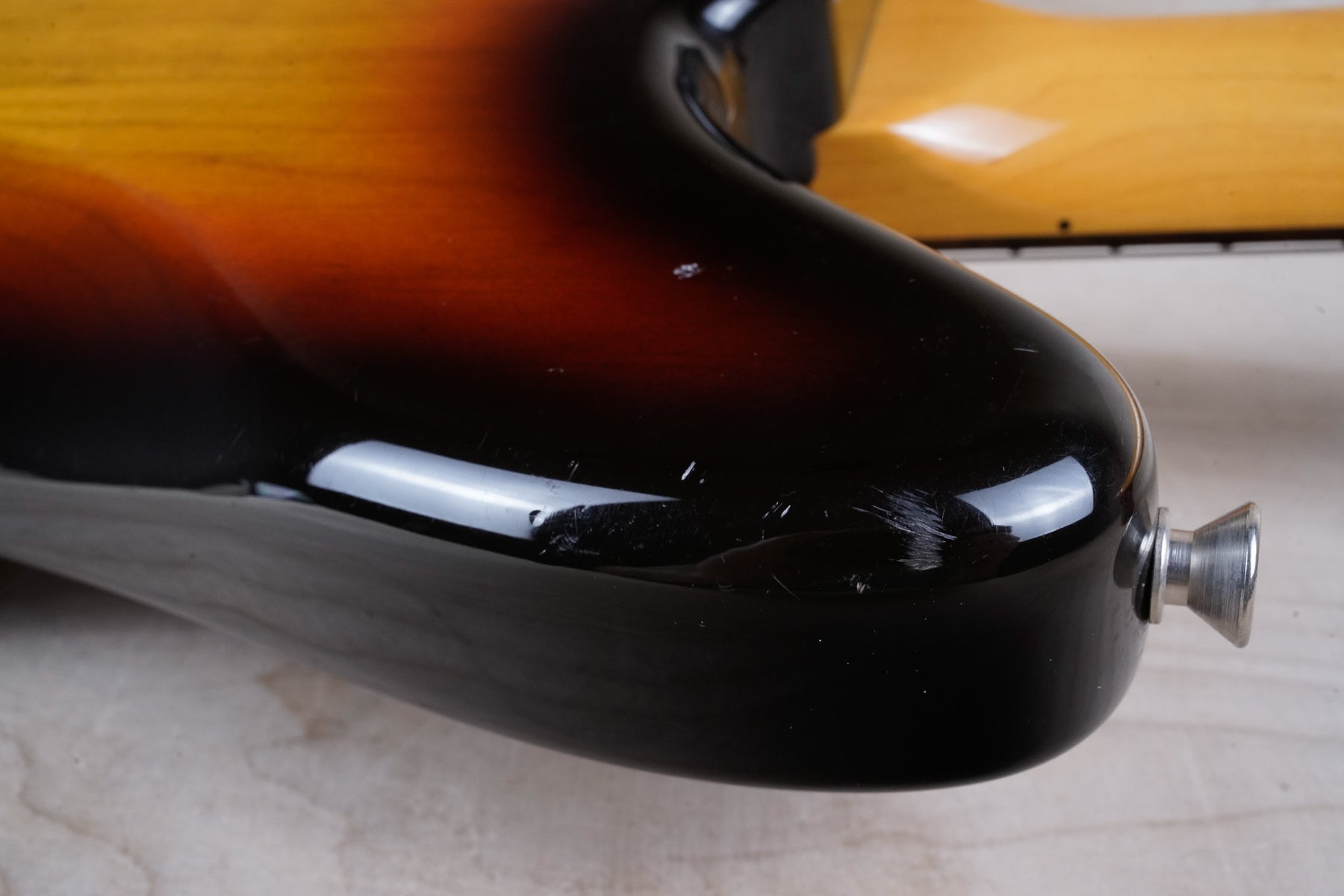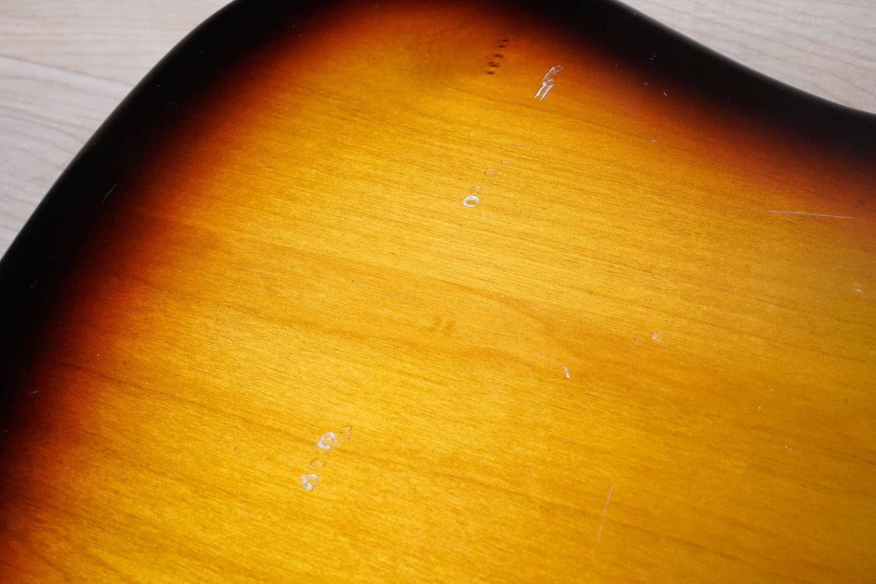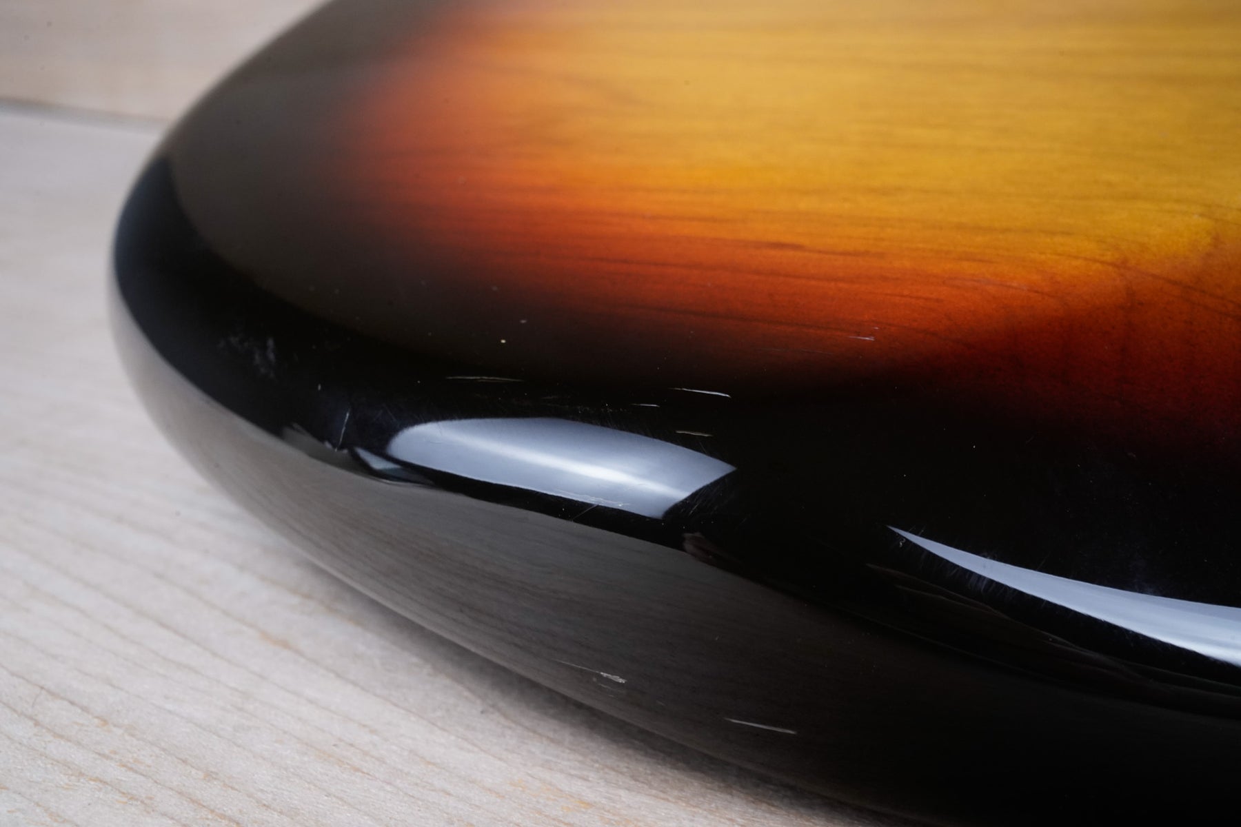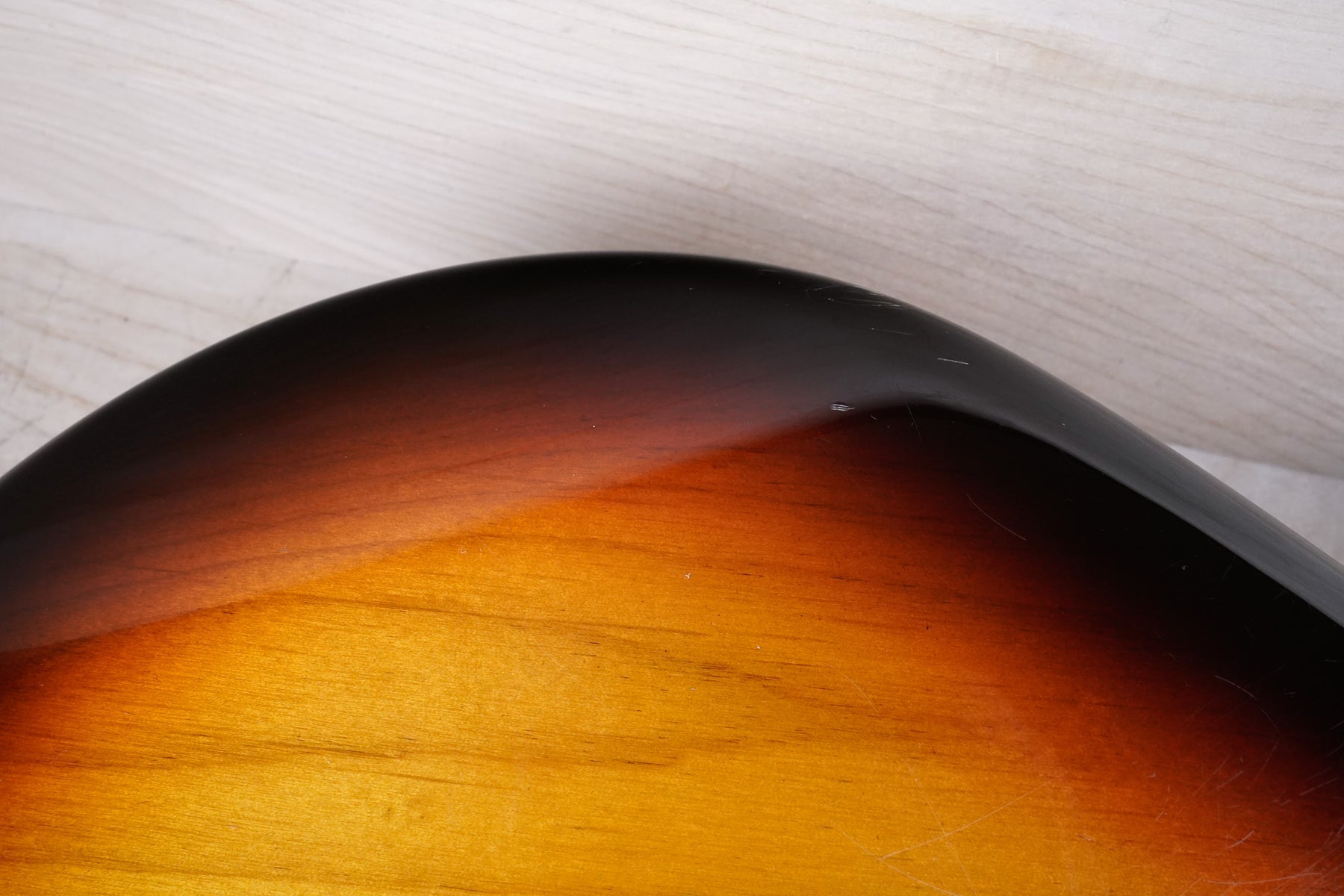 This guitar does show some cosmetic wear that includes various surface scratches, scuffs, and dents throughout the body with additional small dings along the back of the neck and headstock. Part of the Fender logo on the headstock is scuffed and the hardware shows some tarnish from over time. The frets are used but still play great and the electronics work as they should.