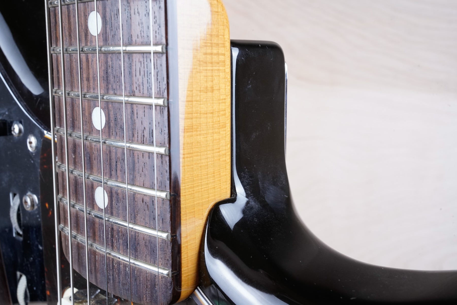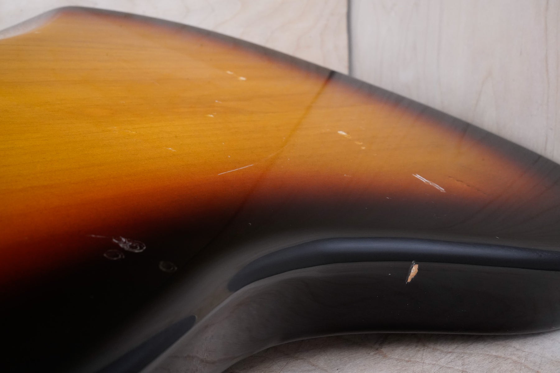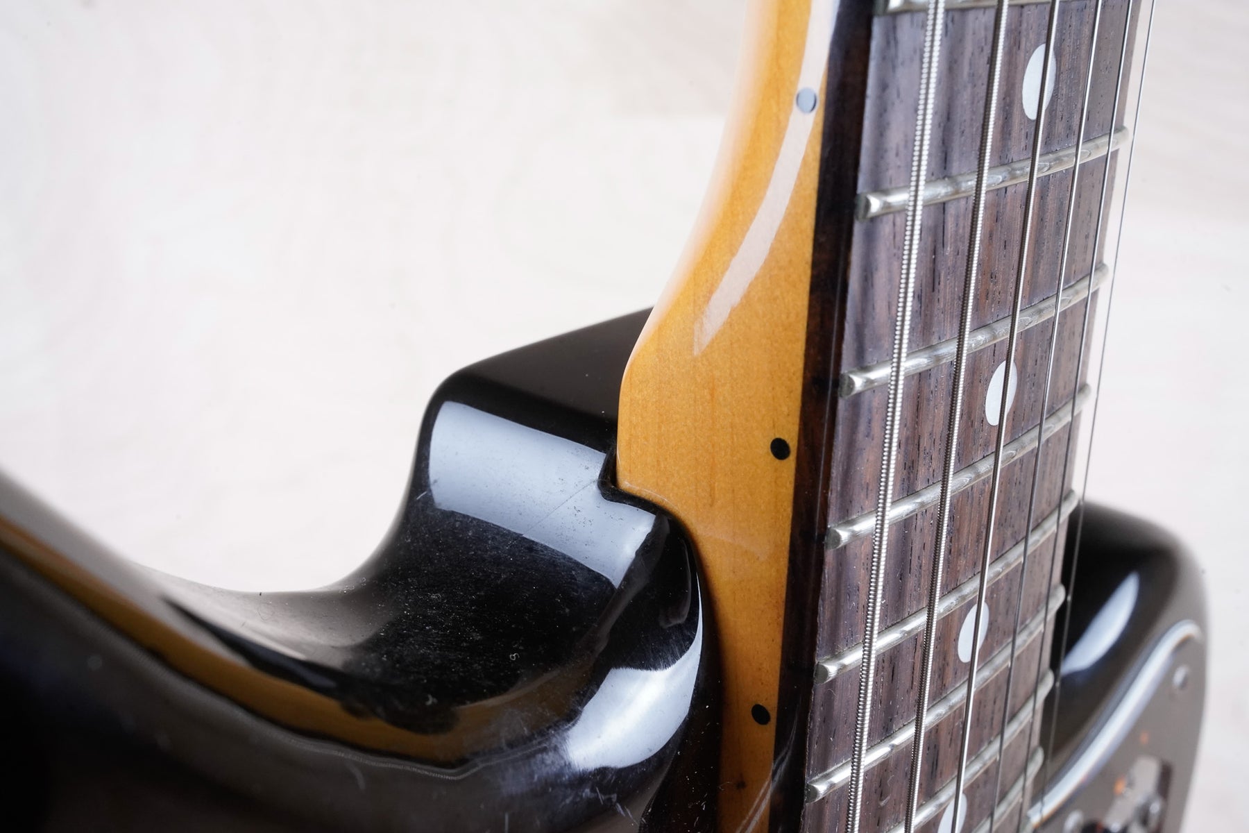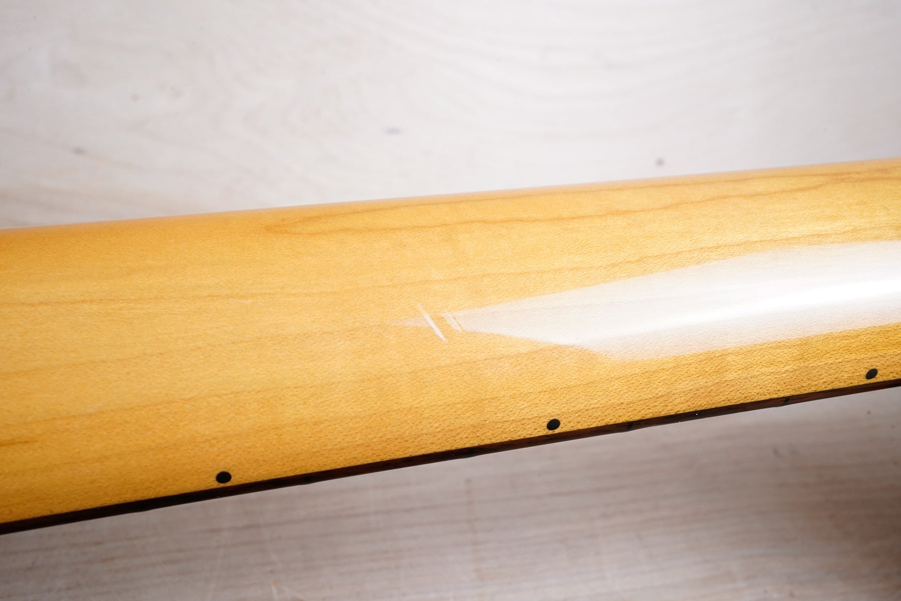 This guitar does show some cosmetic wear that includes various surface scratches, scuffs, and dents throughout the body with additional small dings along the back of the neck and headstock. Part of the Fender logo on the headstock is scuffed and the hardware shows some tarnish from over time. The frets are used but still play great and the electronics work as they should.