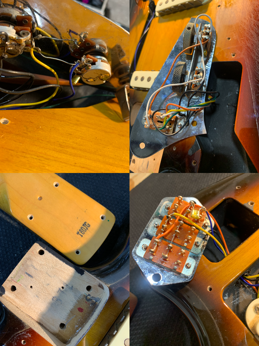 The bridge, rhythm circuit switch, and tremolo arm have been replaced. This guitar is otherwise original.