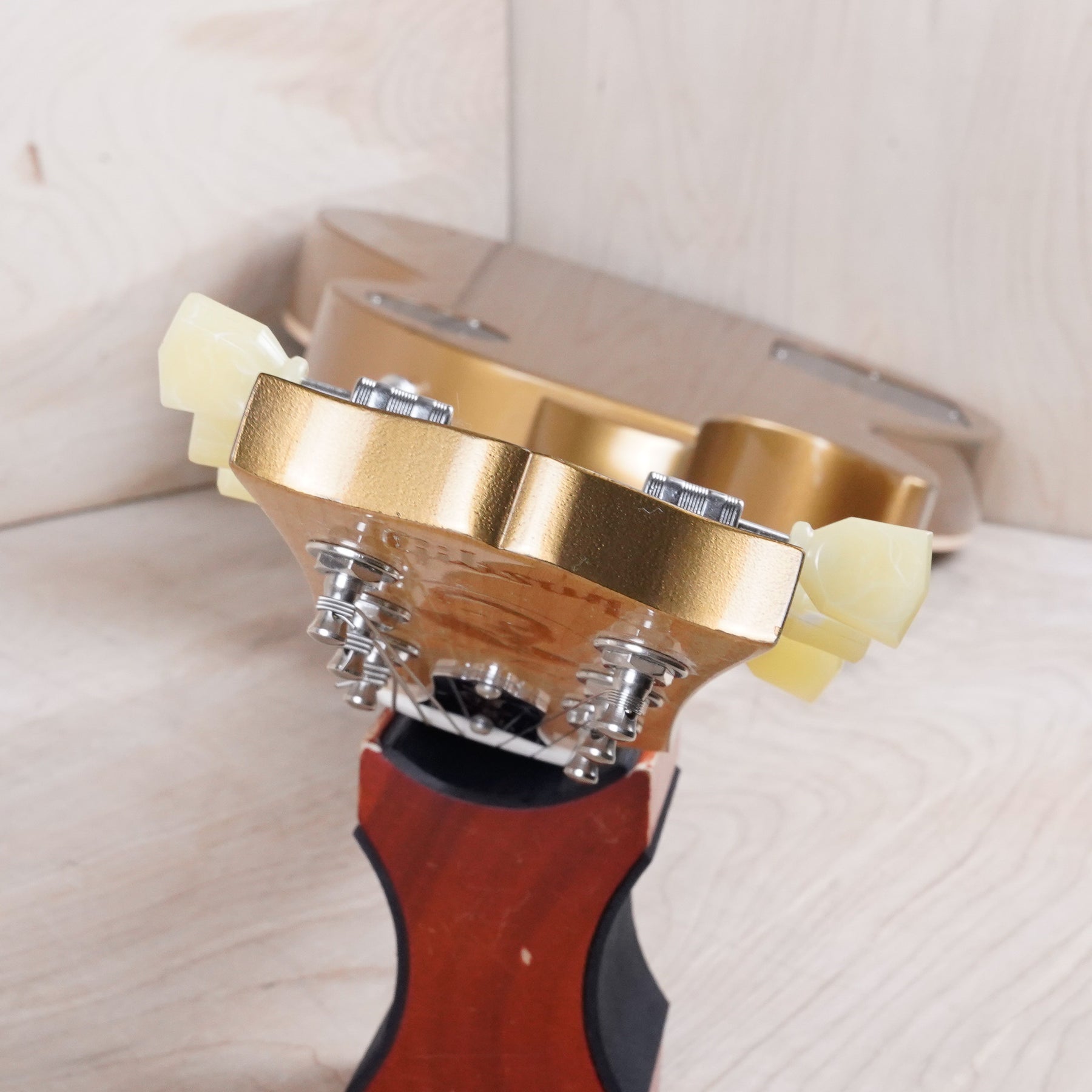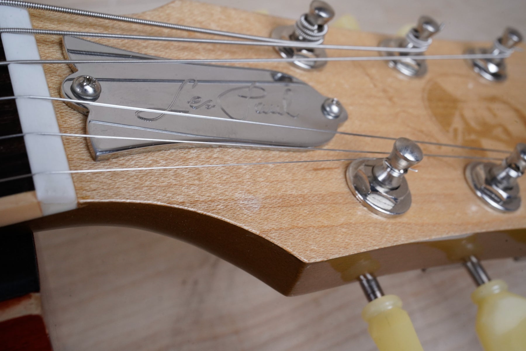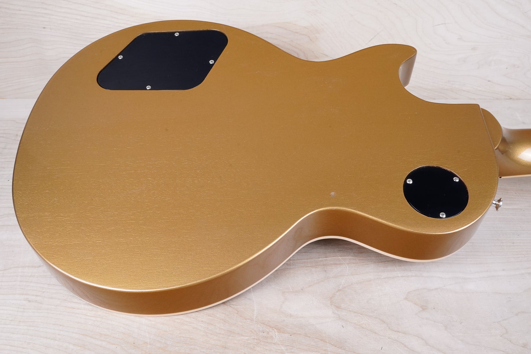 This guitar does show some minor cosmetic wear that includes some light surface scratches and a small finish dent located on the back of the body. There's also a small lacquer chip on the front of the headstock and the output jack cover has a few tiny cracks in the corners. The frets are still in nice shape and the electronics work as they should.