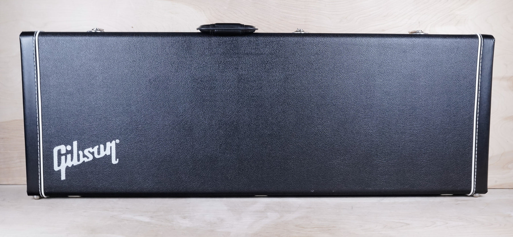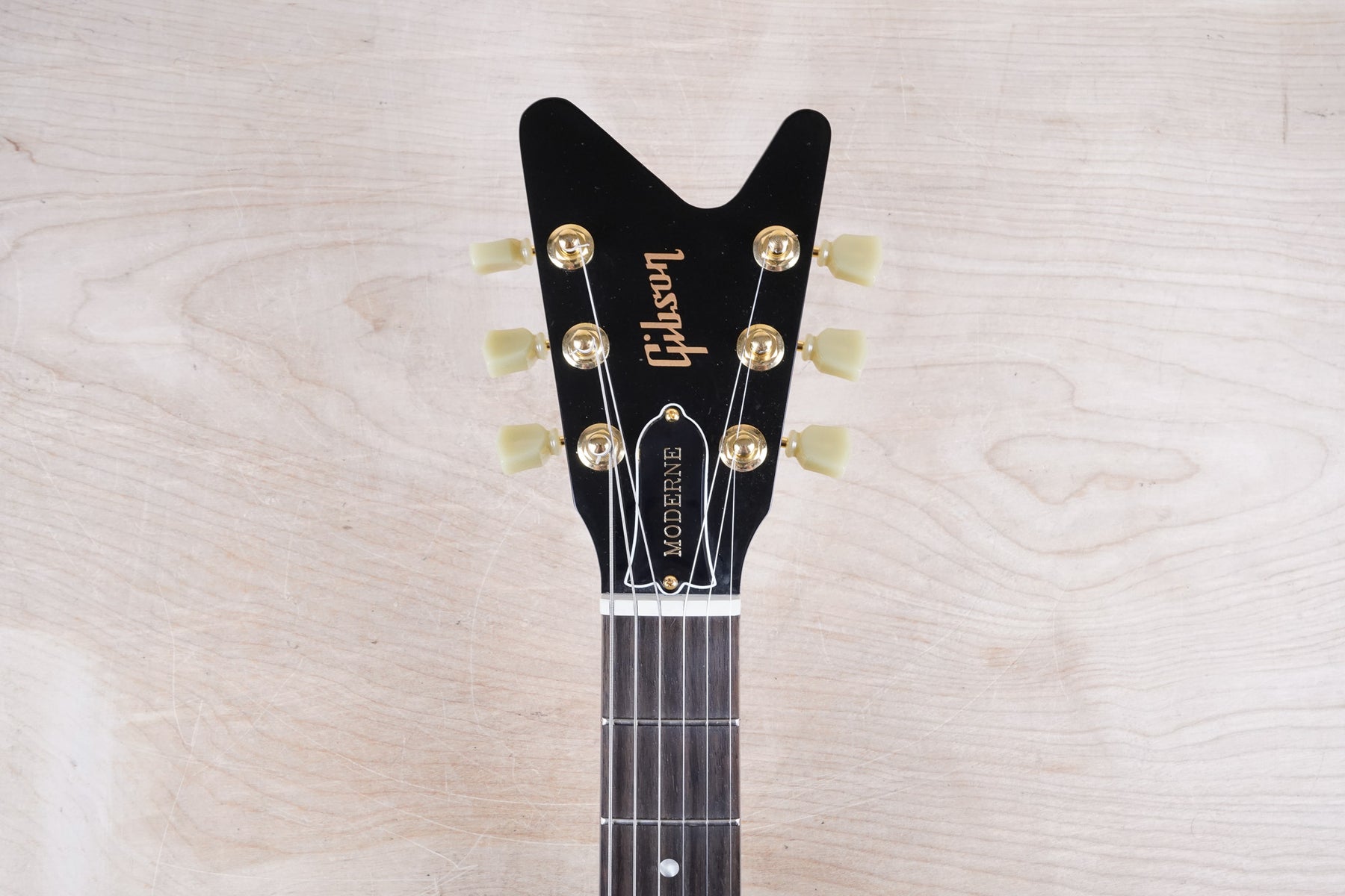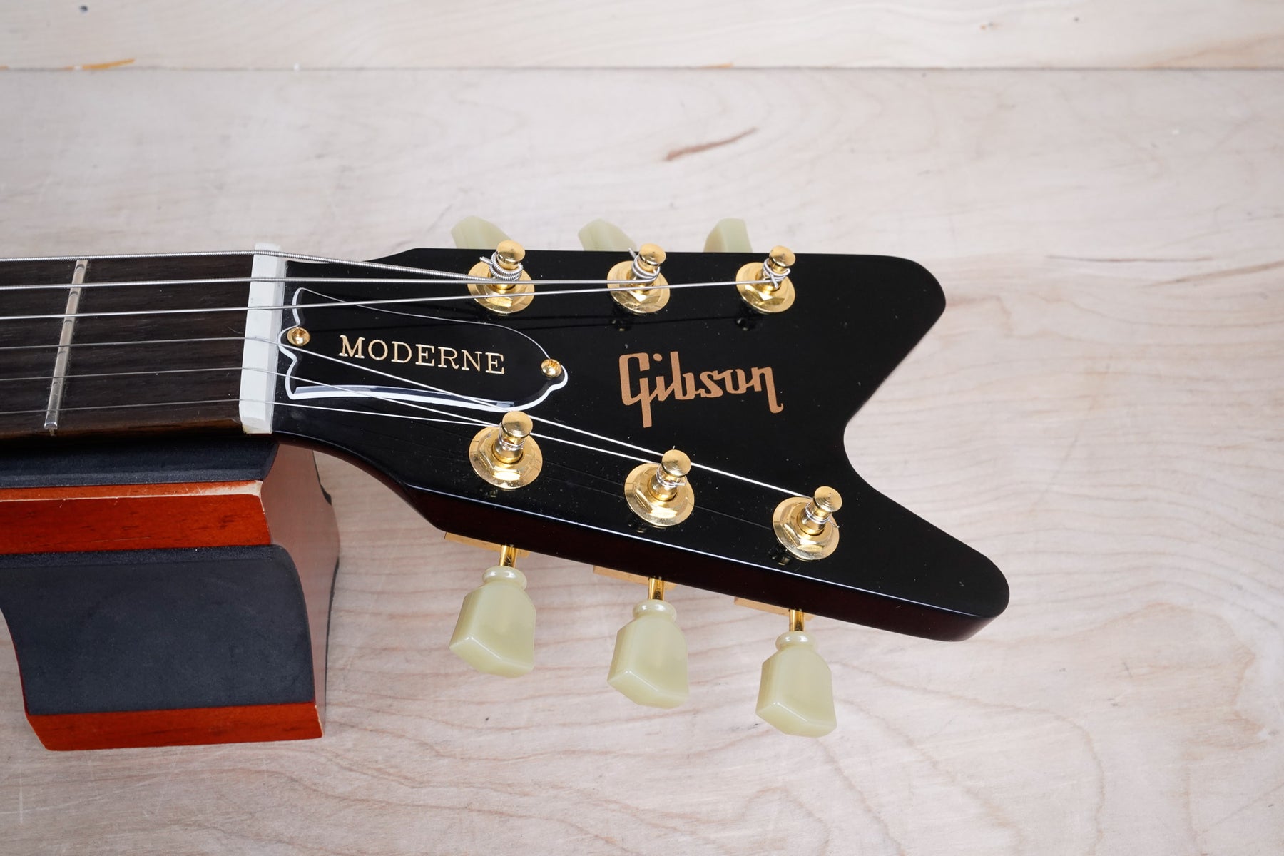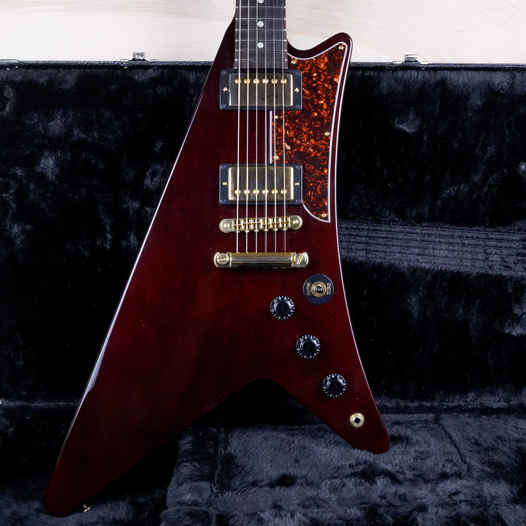 This Gibson Moderne plays and sounds great! The neck has a slim taper and the guitar is factory-equipped with '57 Classic Humbuckers. These guitars are quite hard to find, and those in this classy "Aged Cherry" finish rarely come up for sale!