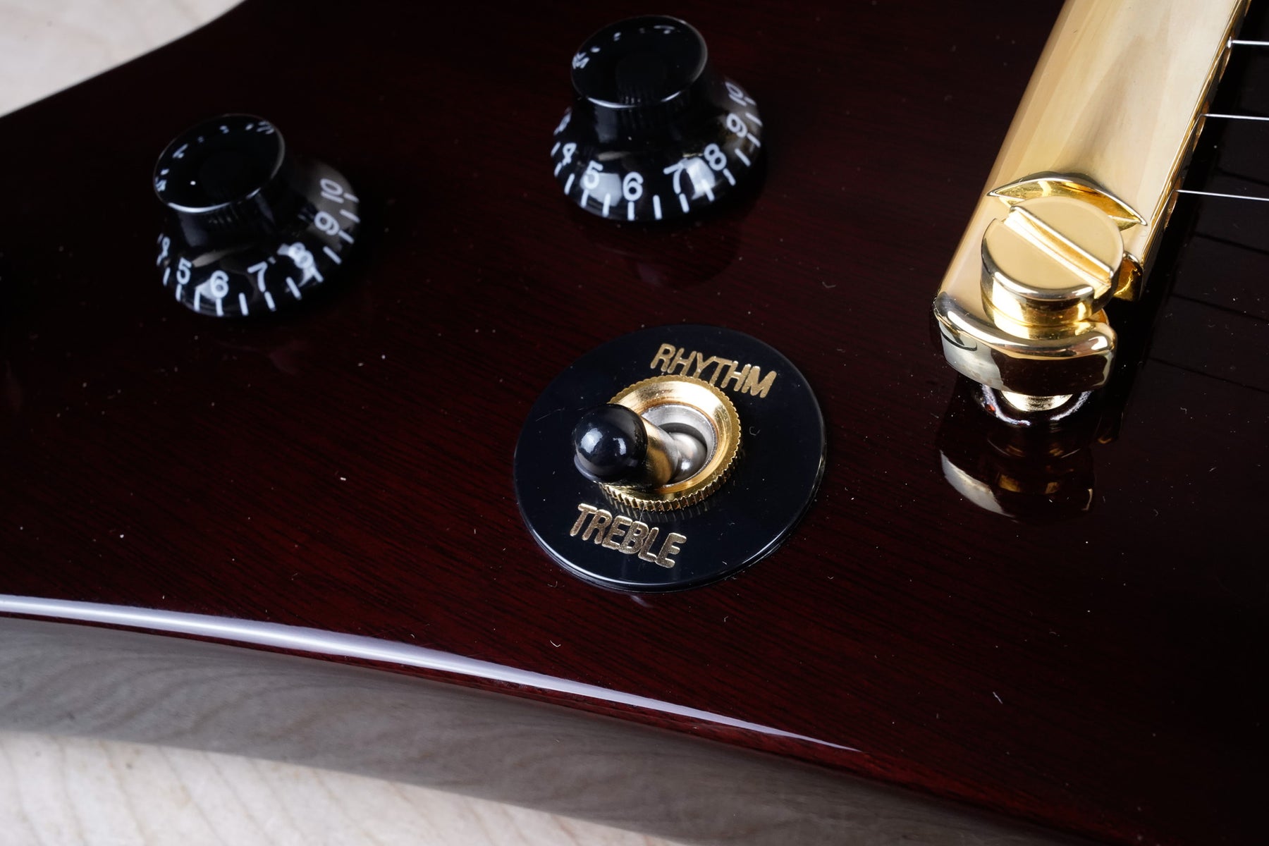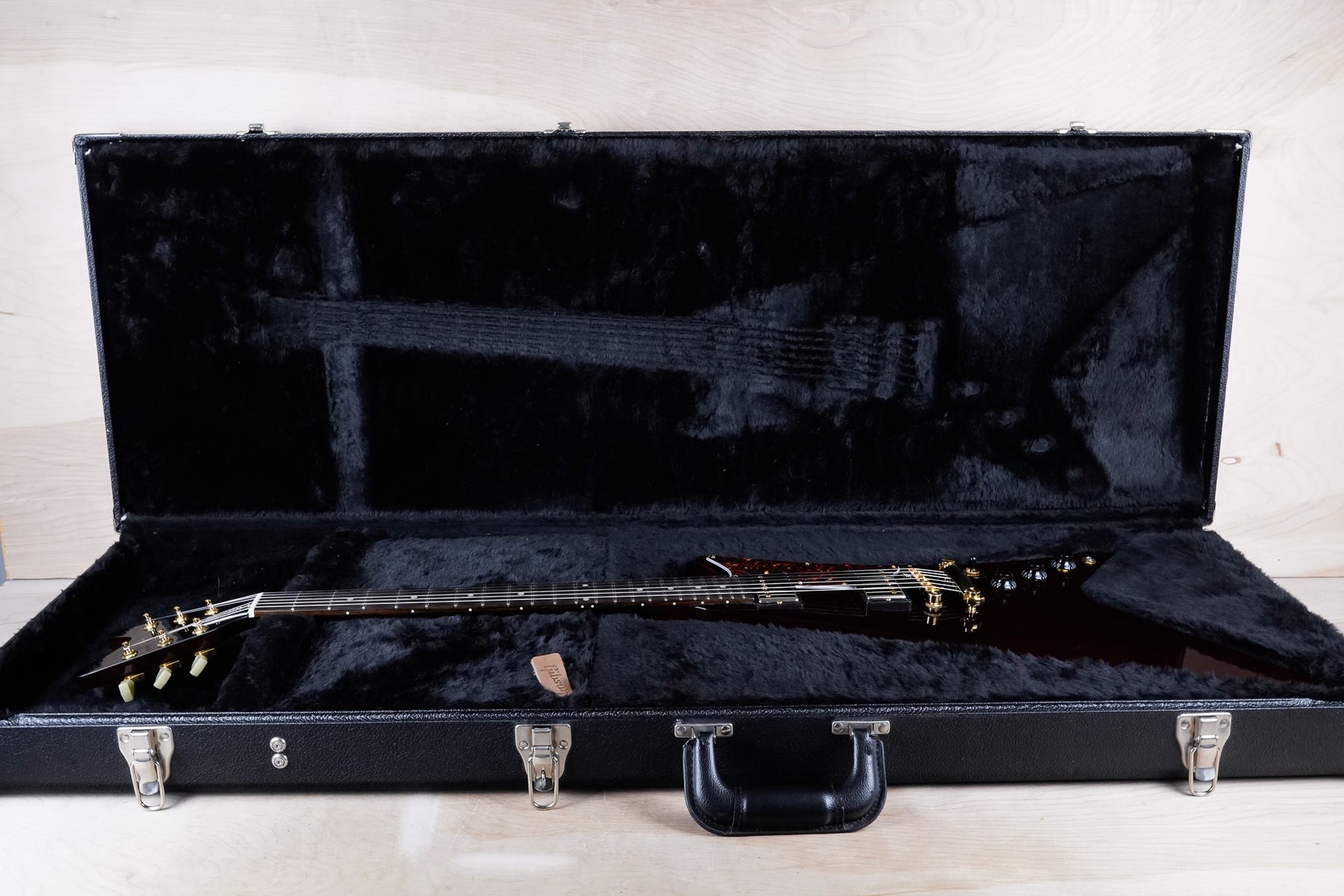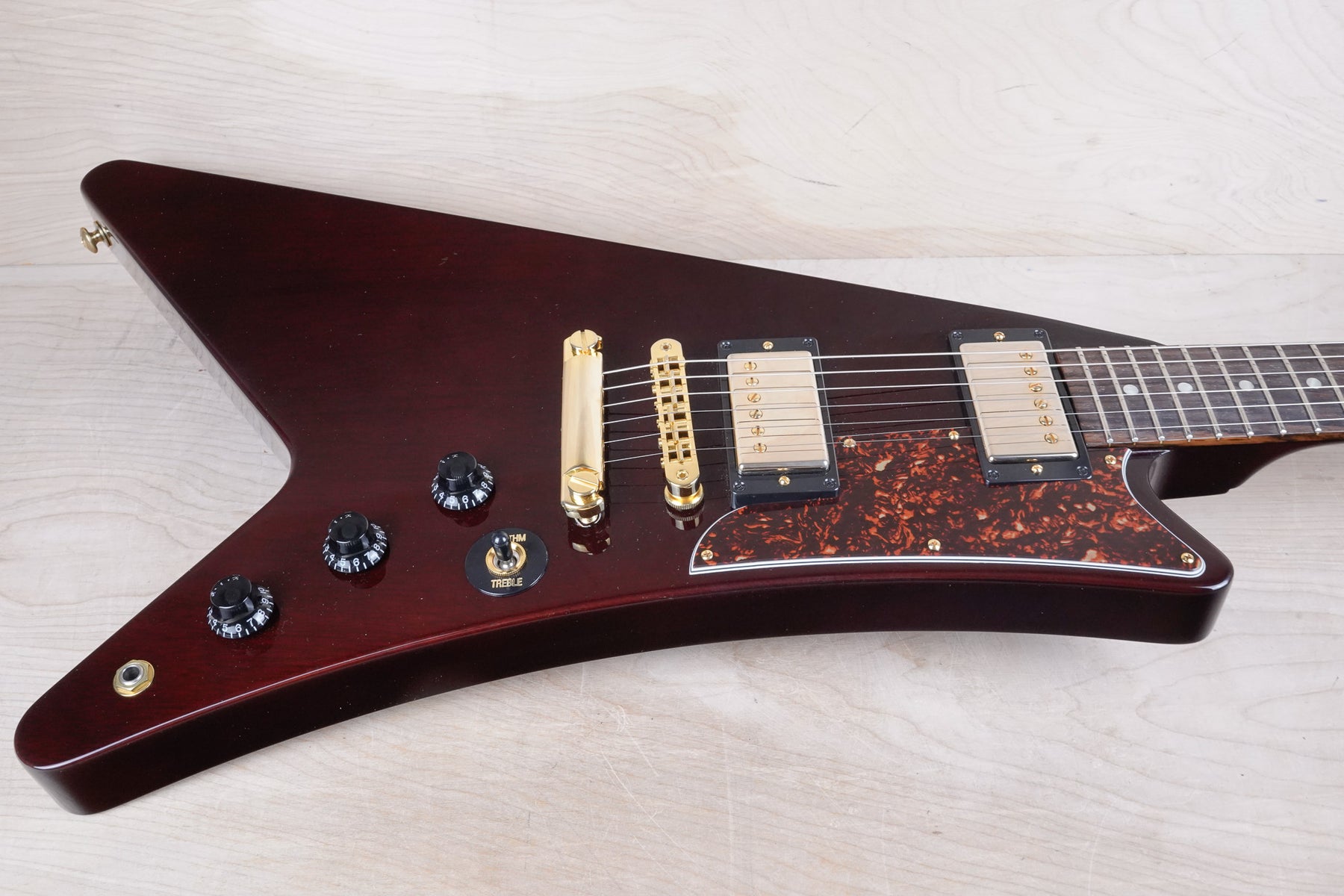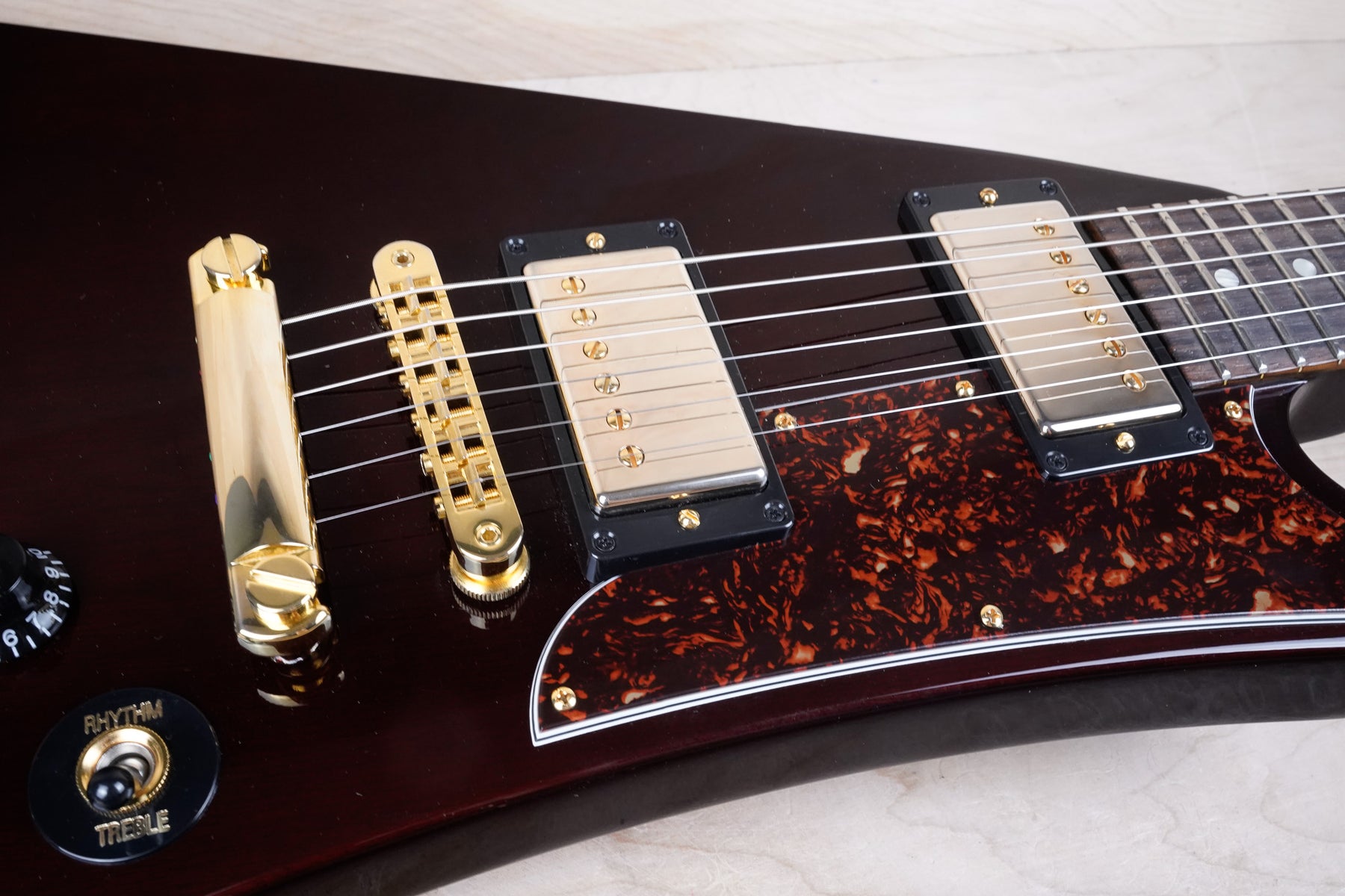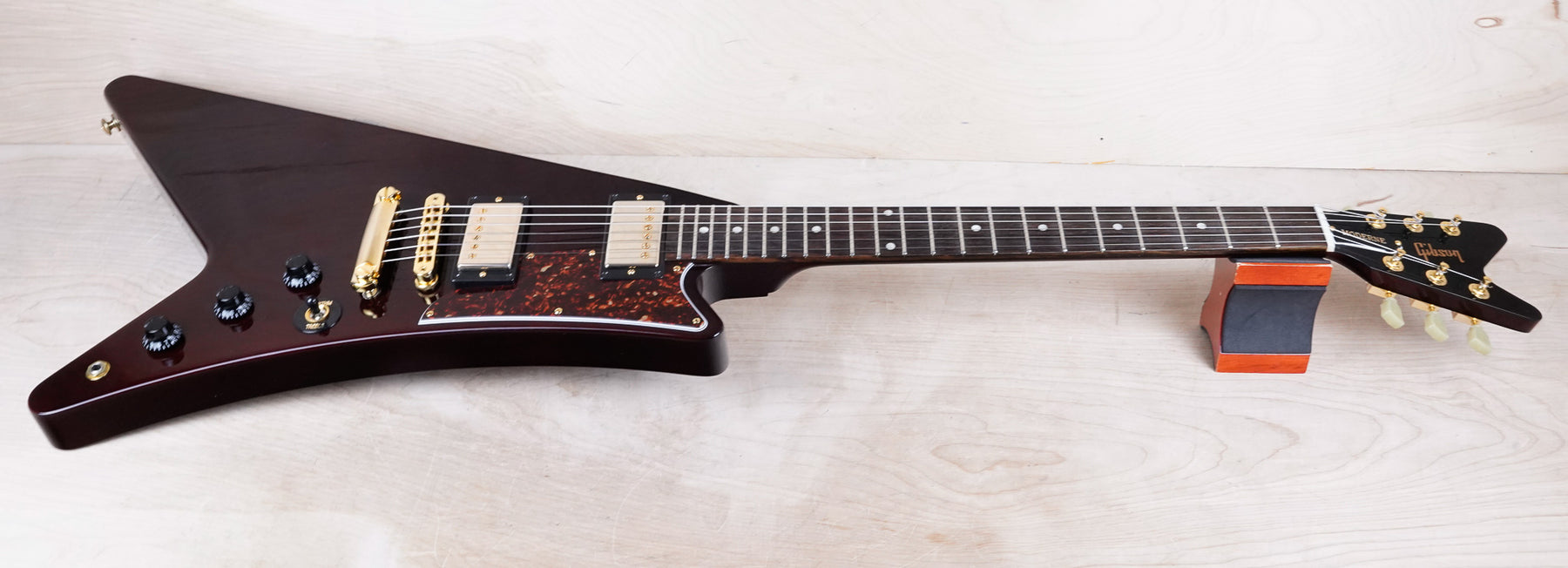 This Gibson Moderne plays and sounds great! The neck has a slim taper and the guitar is factory-equipped with '57 Classic Humbuckers. These guitars are quite hard to find, and those in this classy "Aged Cherry" finish rarely come up for sale!