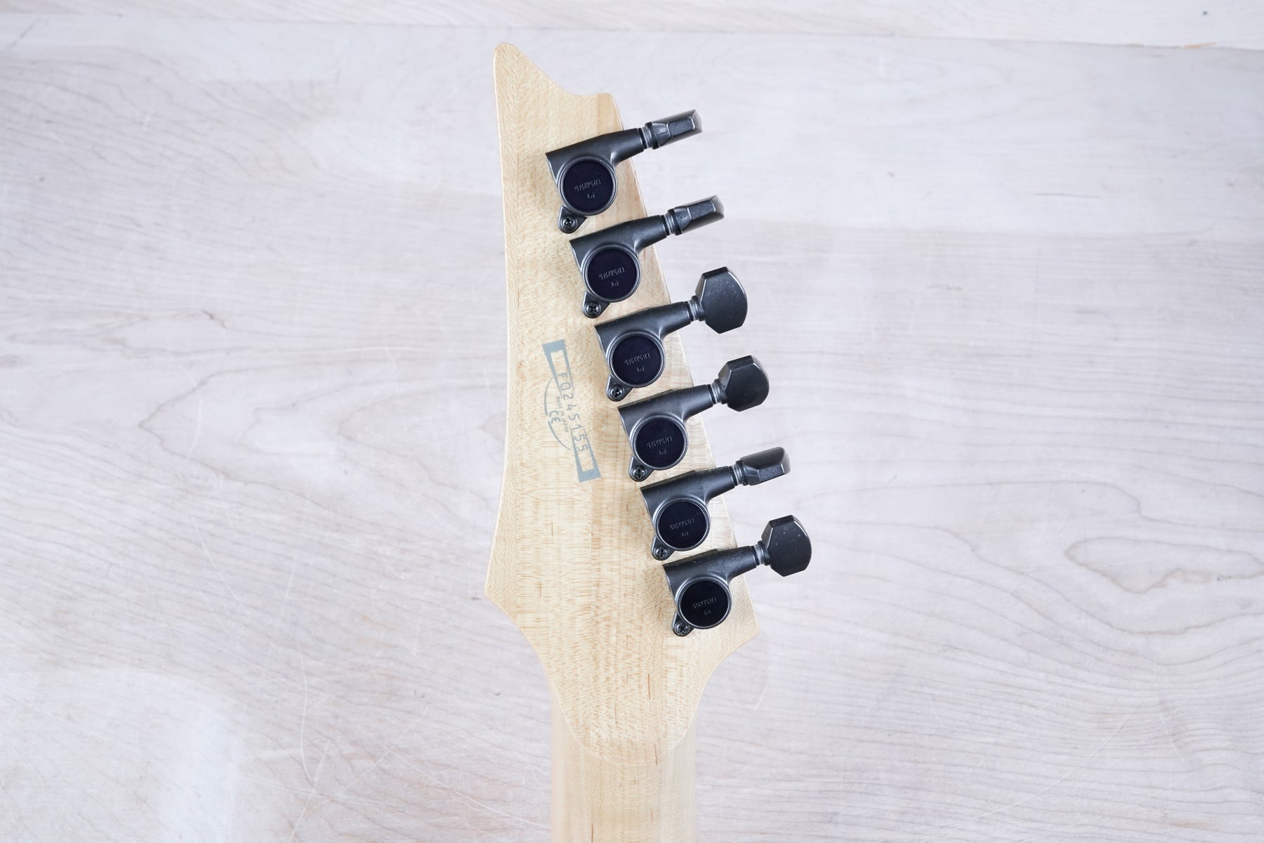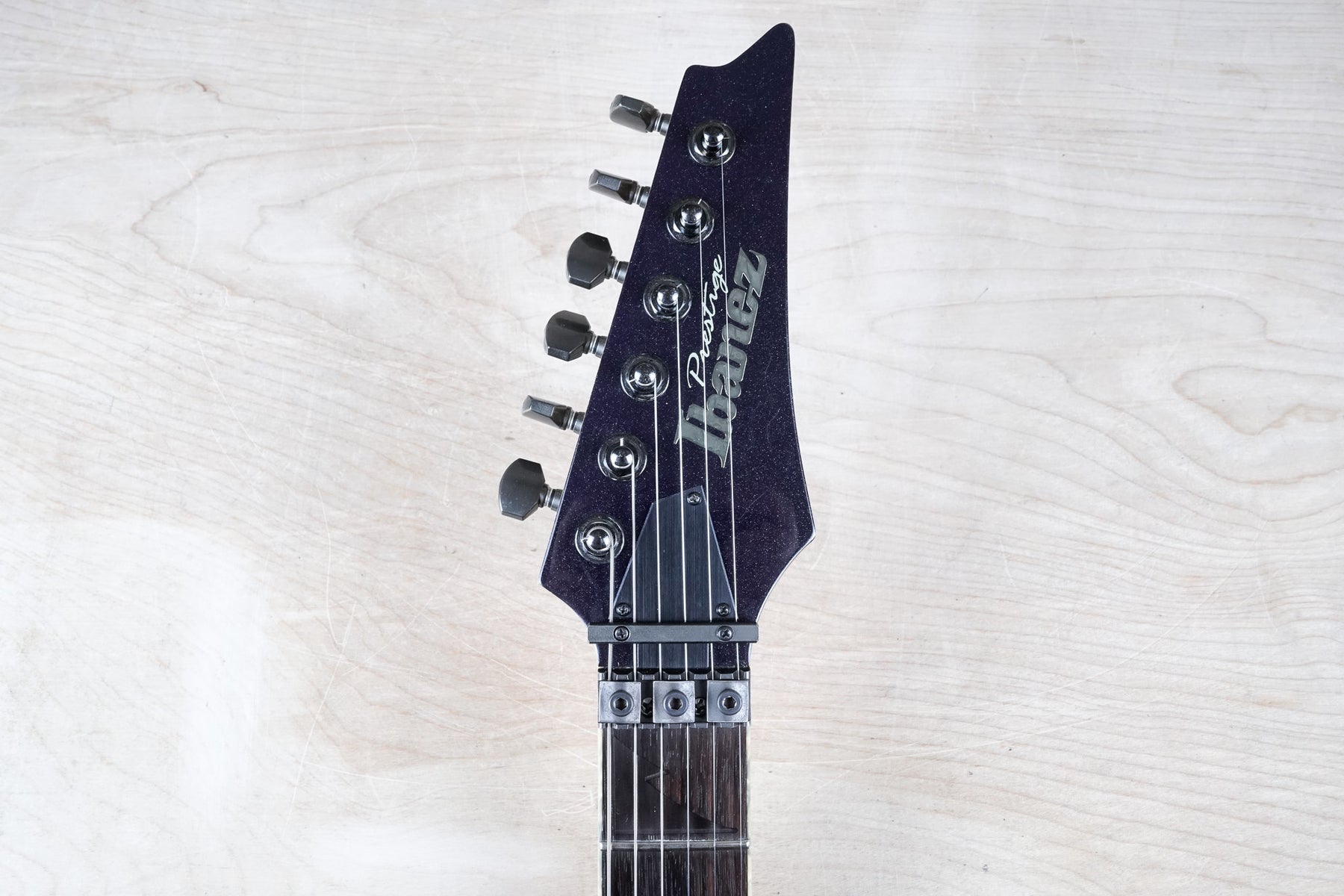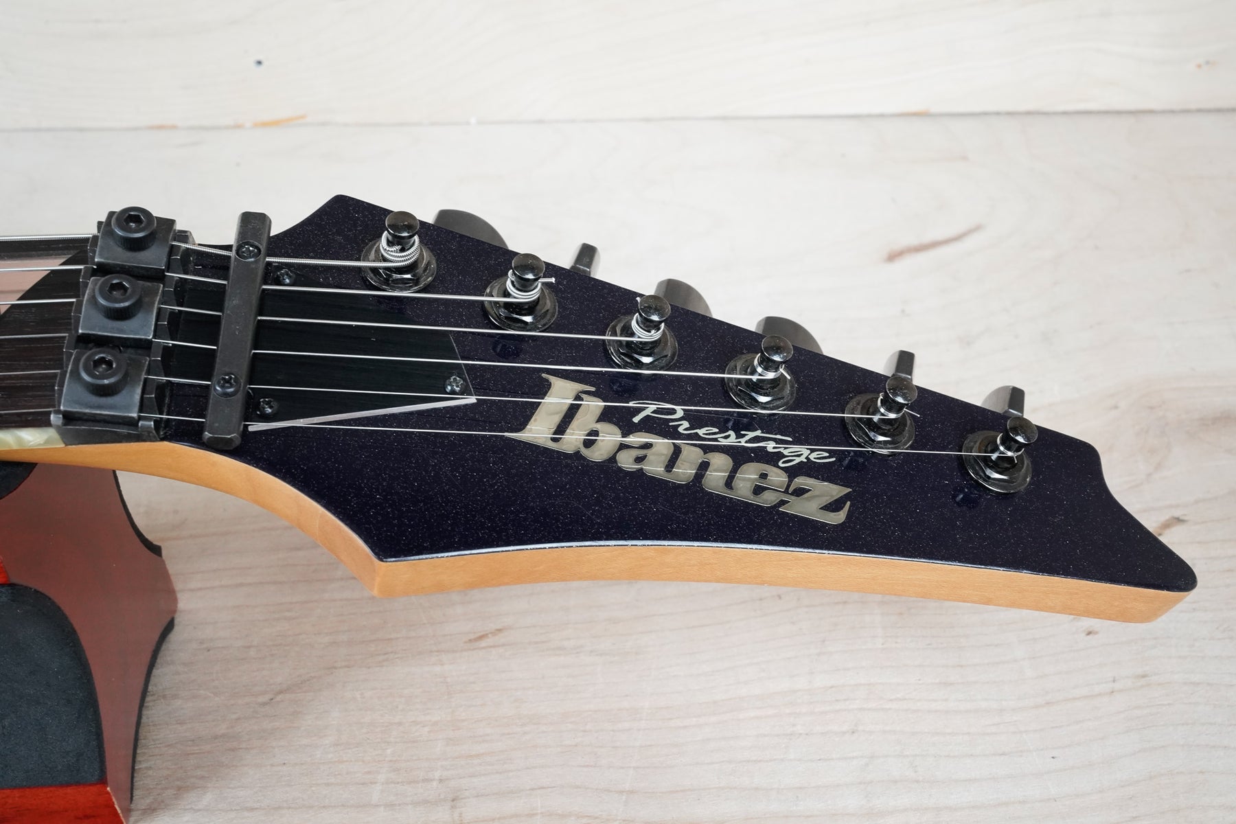This made in Japan Prestige RG2570EX plays and sounds great! This guitar is equipped with an Edge Pro double locking tremolo and the pickups are a set of HSH DiMarzio IBZ. The cosmic blue finish and shark tooth inlays on the fretboard look great!