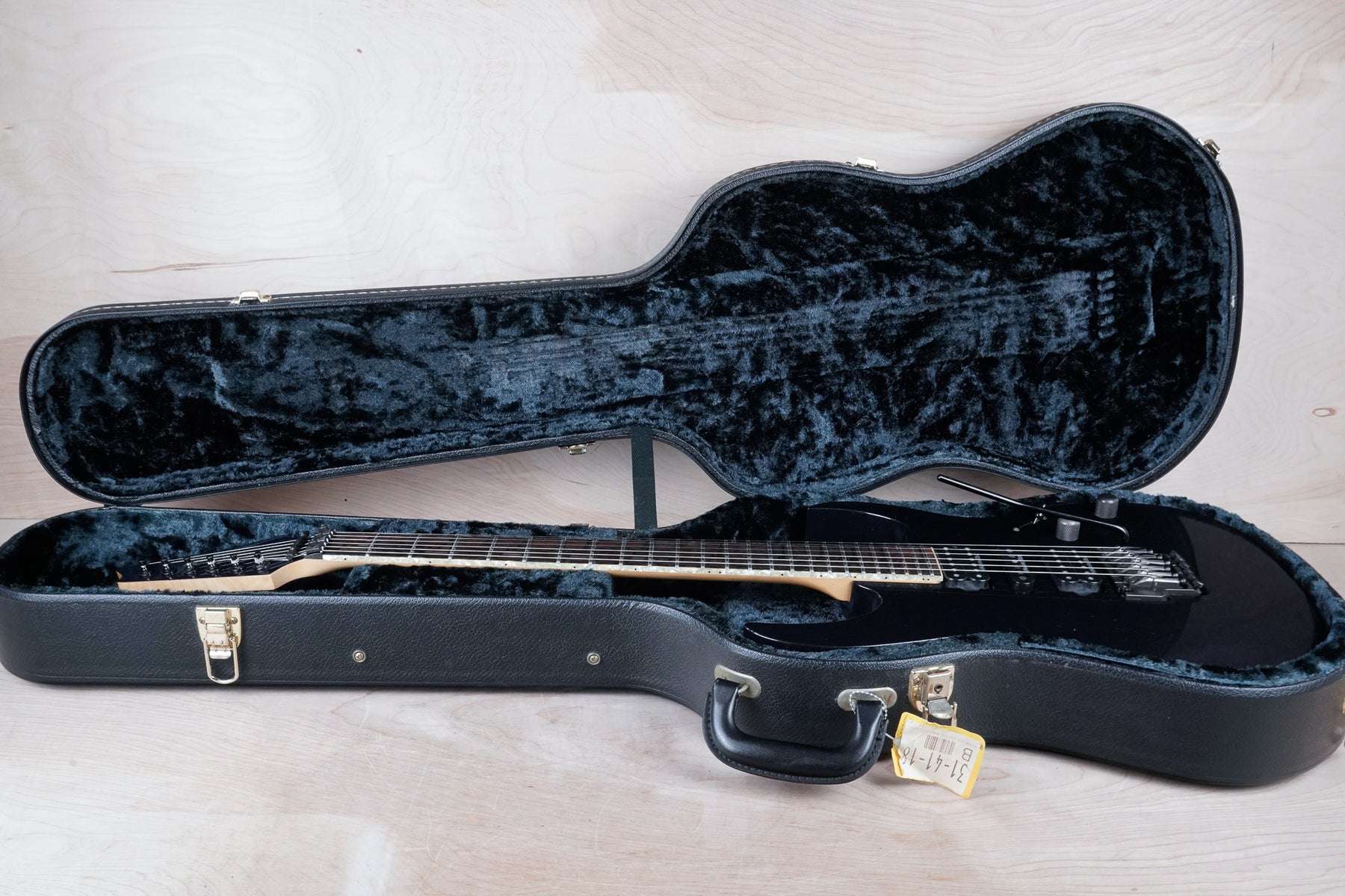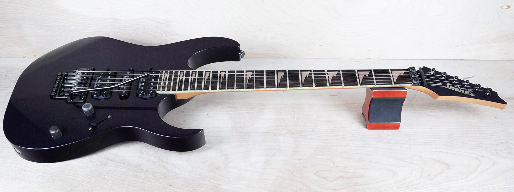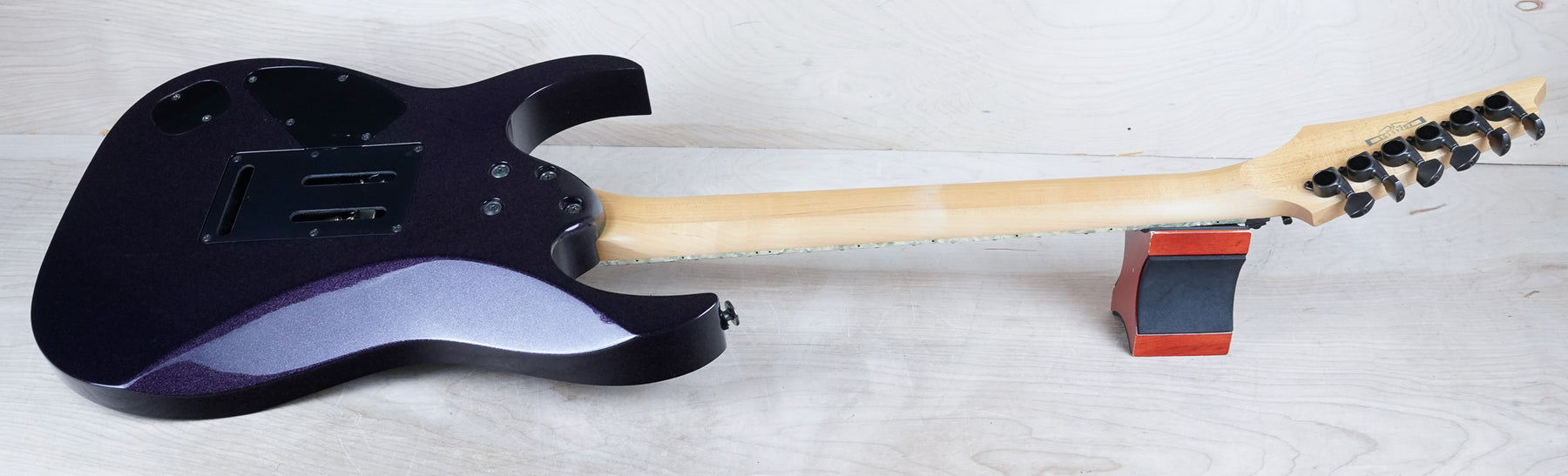 This made in Japan Prestige RG2570EX plays and sounds great! This guitar is equipped with an Edge Pro double locking tremolo and the pickups are a set of HSH DiMarzio IBZ. The cosmic blue finish and shark tooth inlays on the fretboard look great!