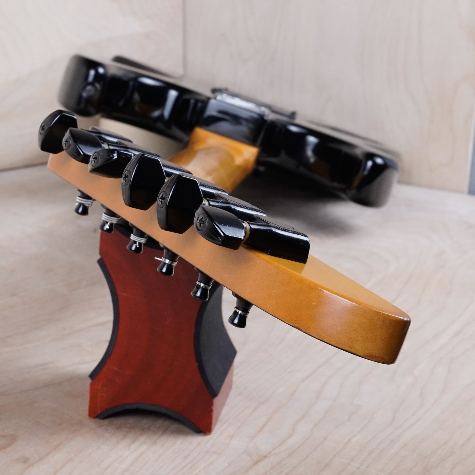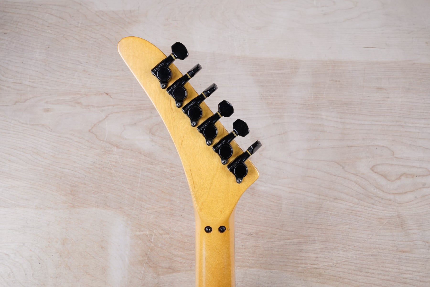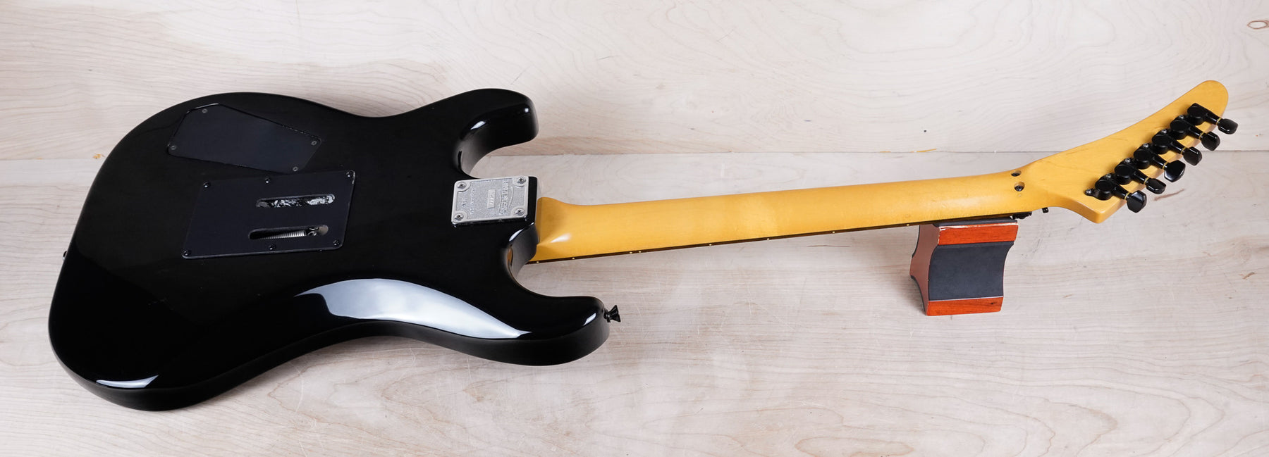 While it's hard to determine the exact year of manufacture but this one is estimated to be from the 1980s based on the headstock shape and Kramer logo. The guitar features an SH pickup configuration, single volume knob, and a 3-way mini switch. The DC Resistance on each pickup currently read 8.4k in the bridge and 5.8k in the neck position.