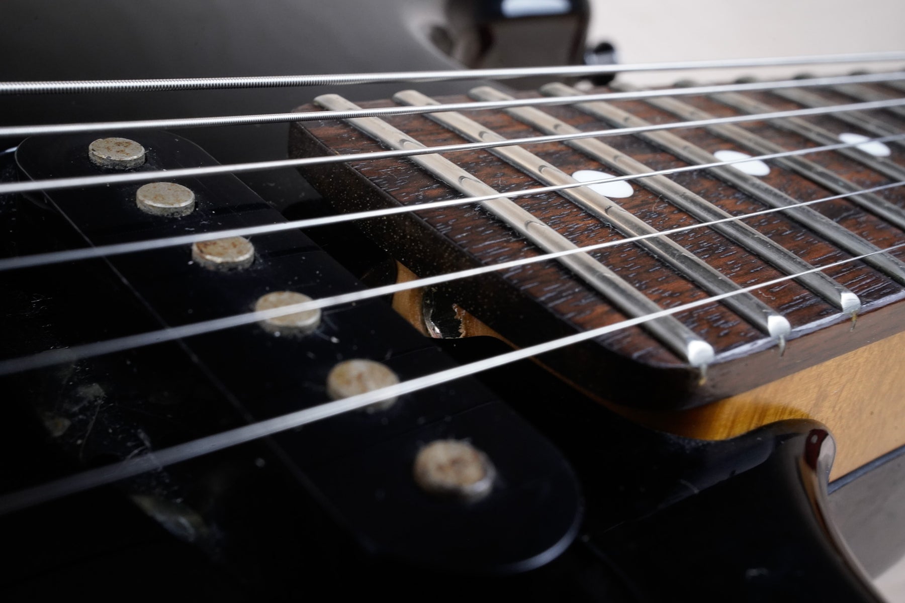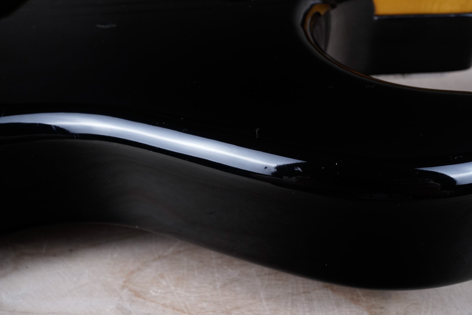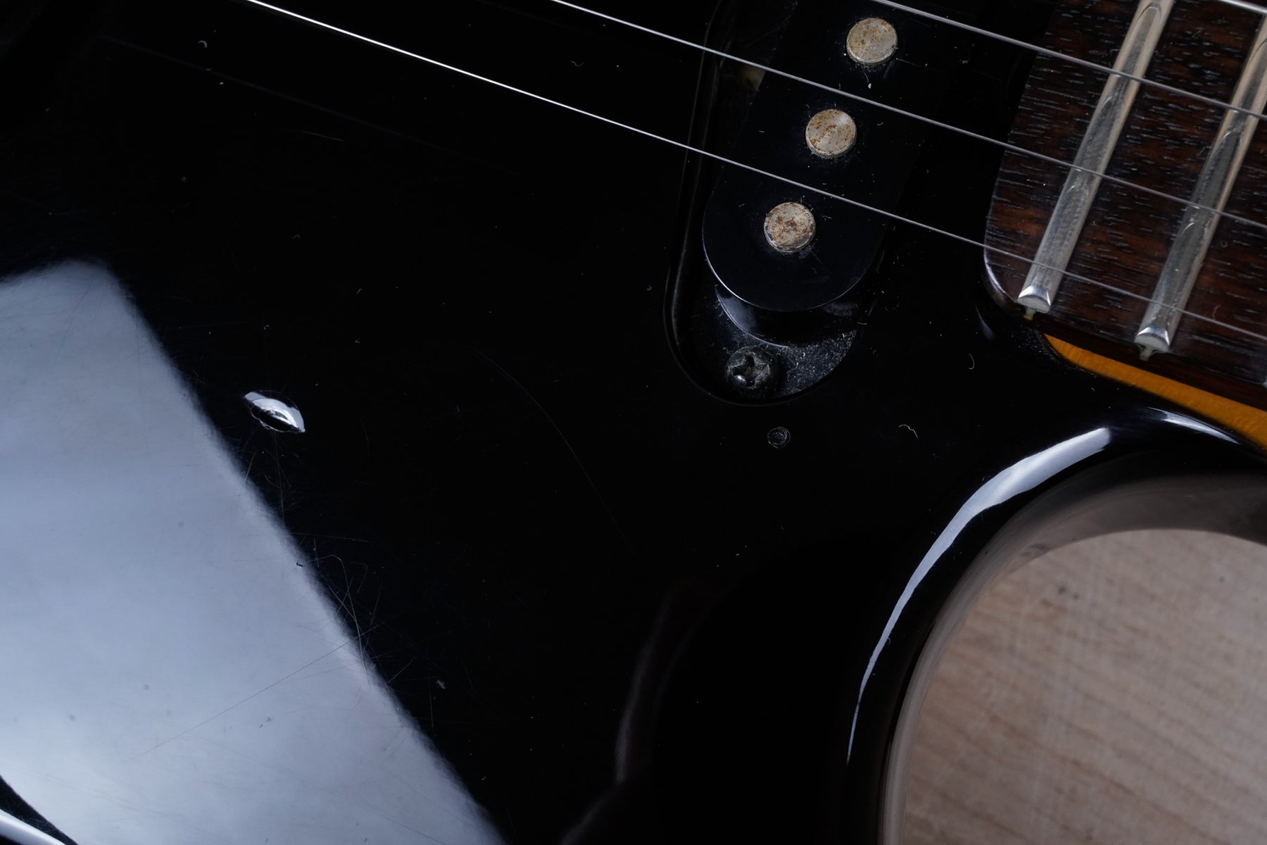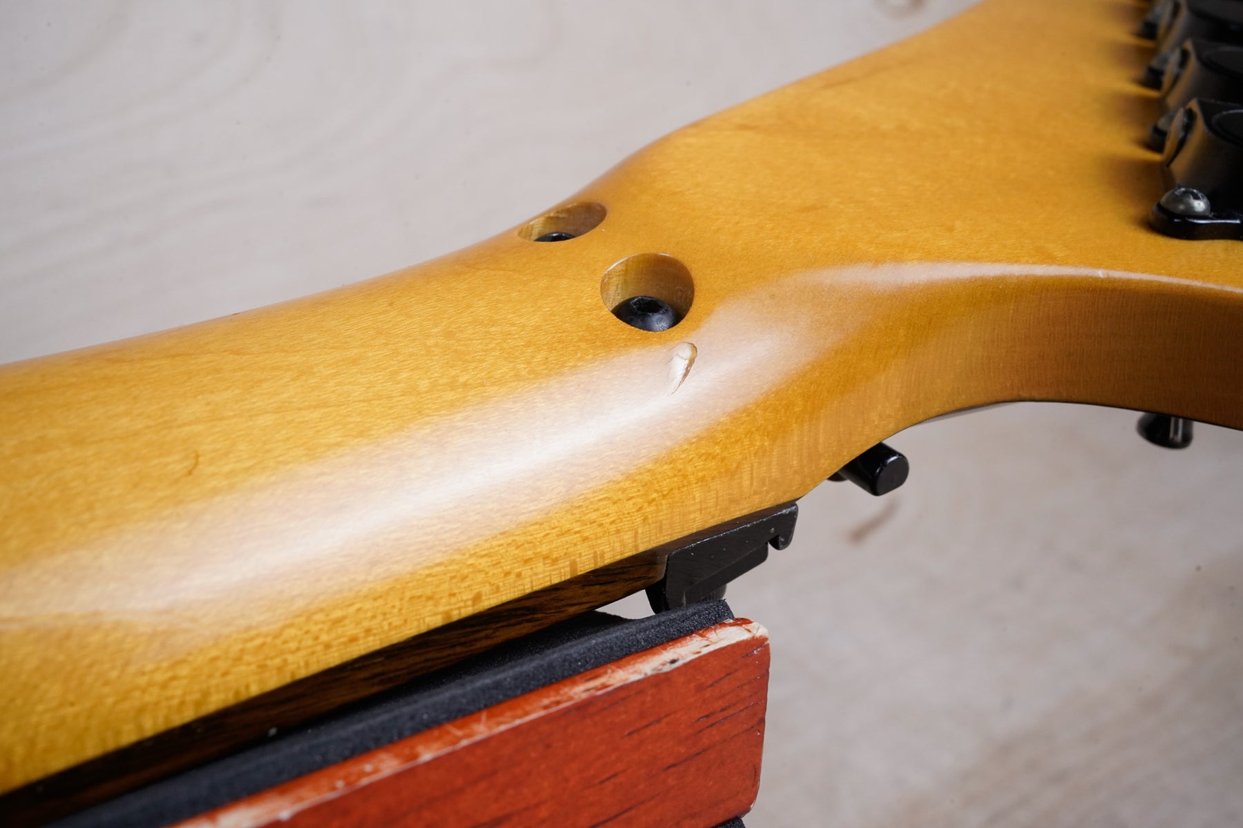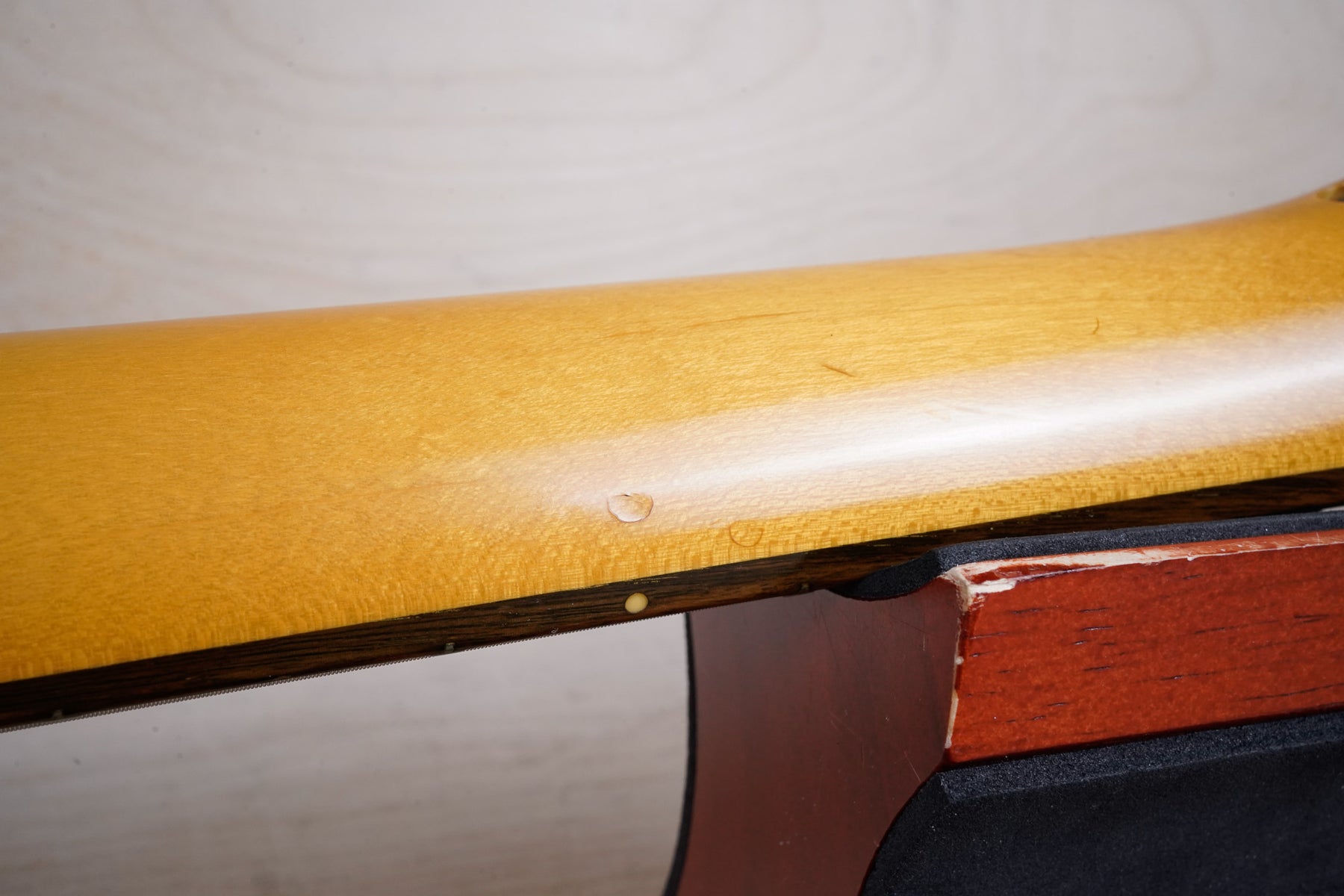 This guitar does show some cosmetic wear from over the years that includes various surface scratches, scuffs, and dents throughout the body with additional light scratches and small dings along the back of the neck and headstock. The hardware shows normal tarnishing and the maple neck has darkened from over time. The frets are still in nice shape and play great along the neck and the electronics work as they should.