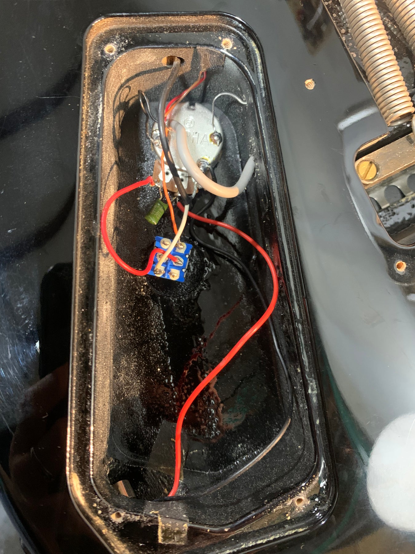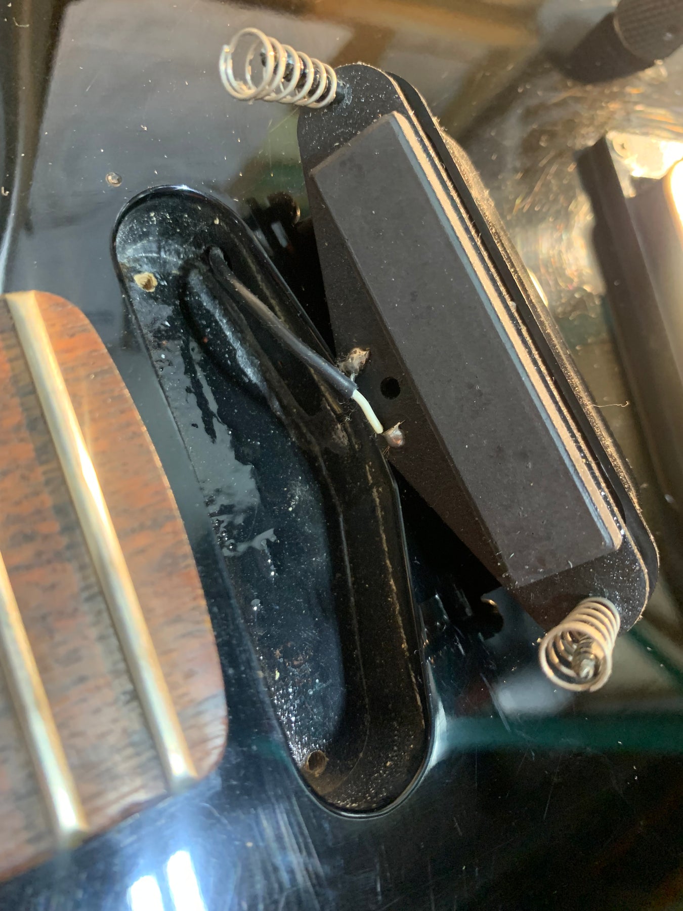 The tremolo arm and spring cover have been replaced, otherwise this guitar appears to be original.