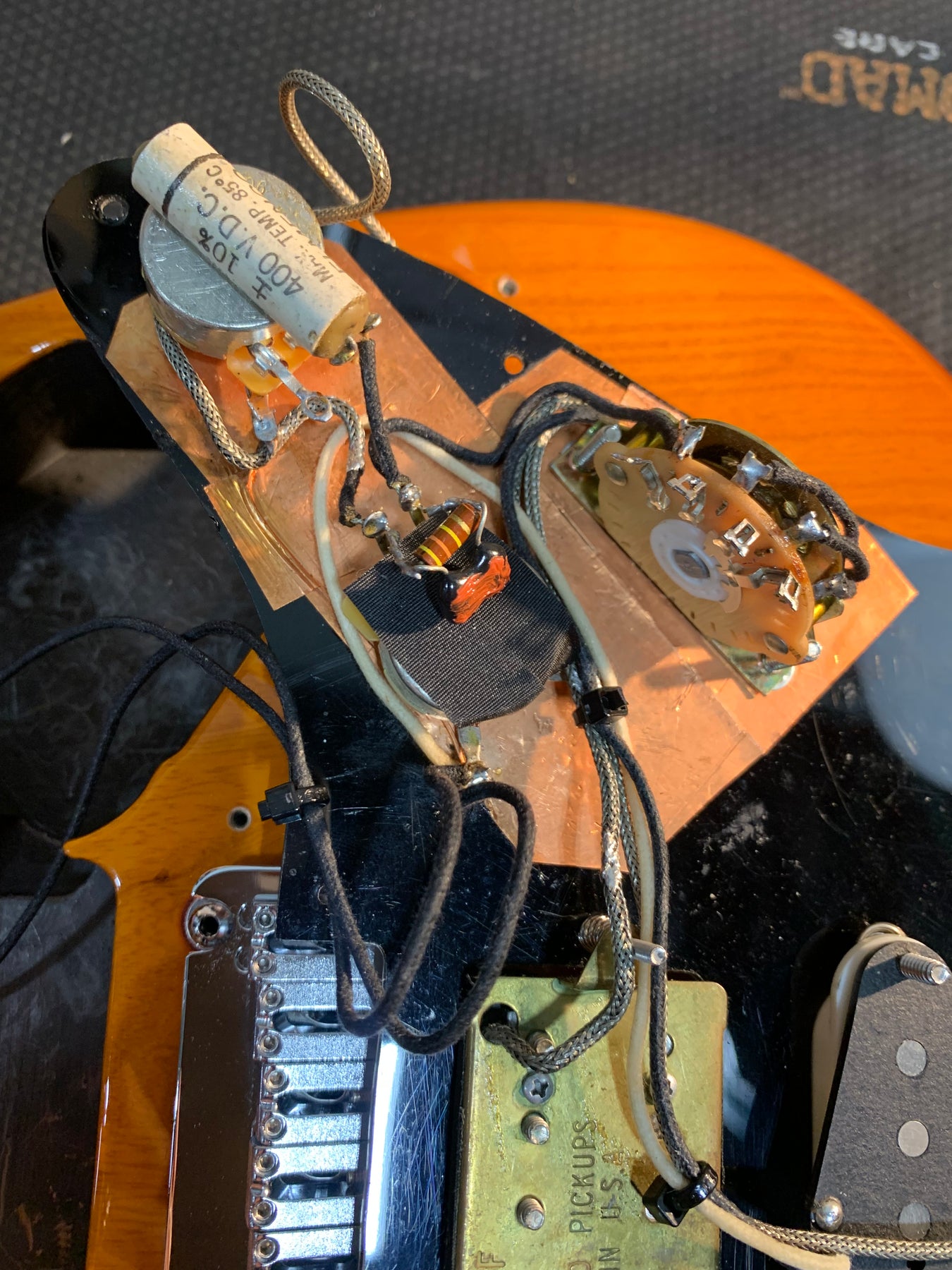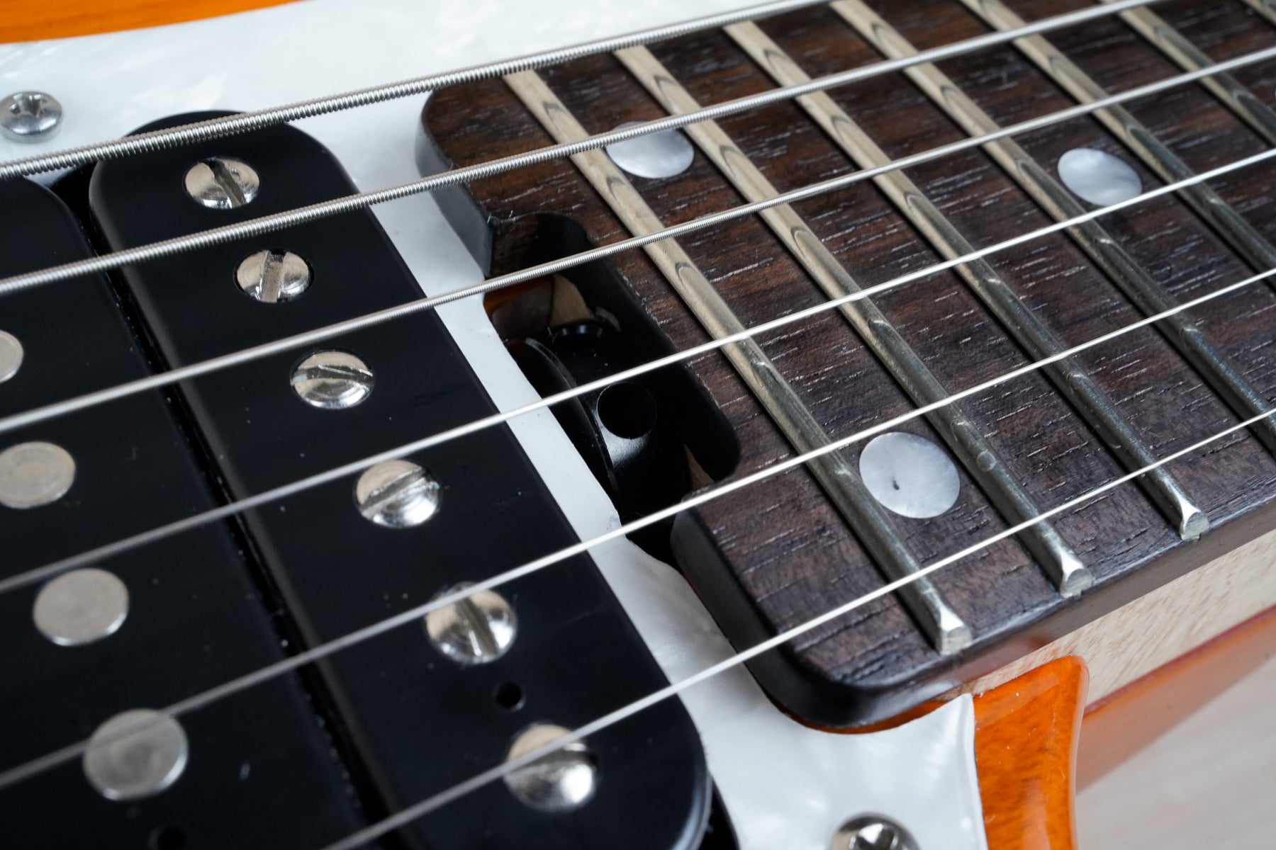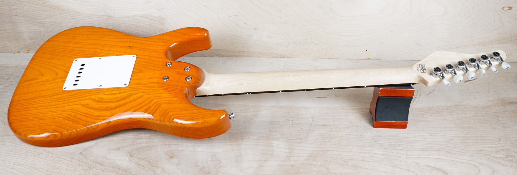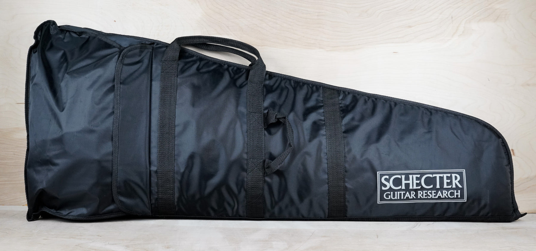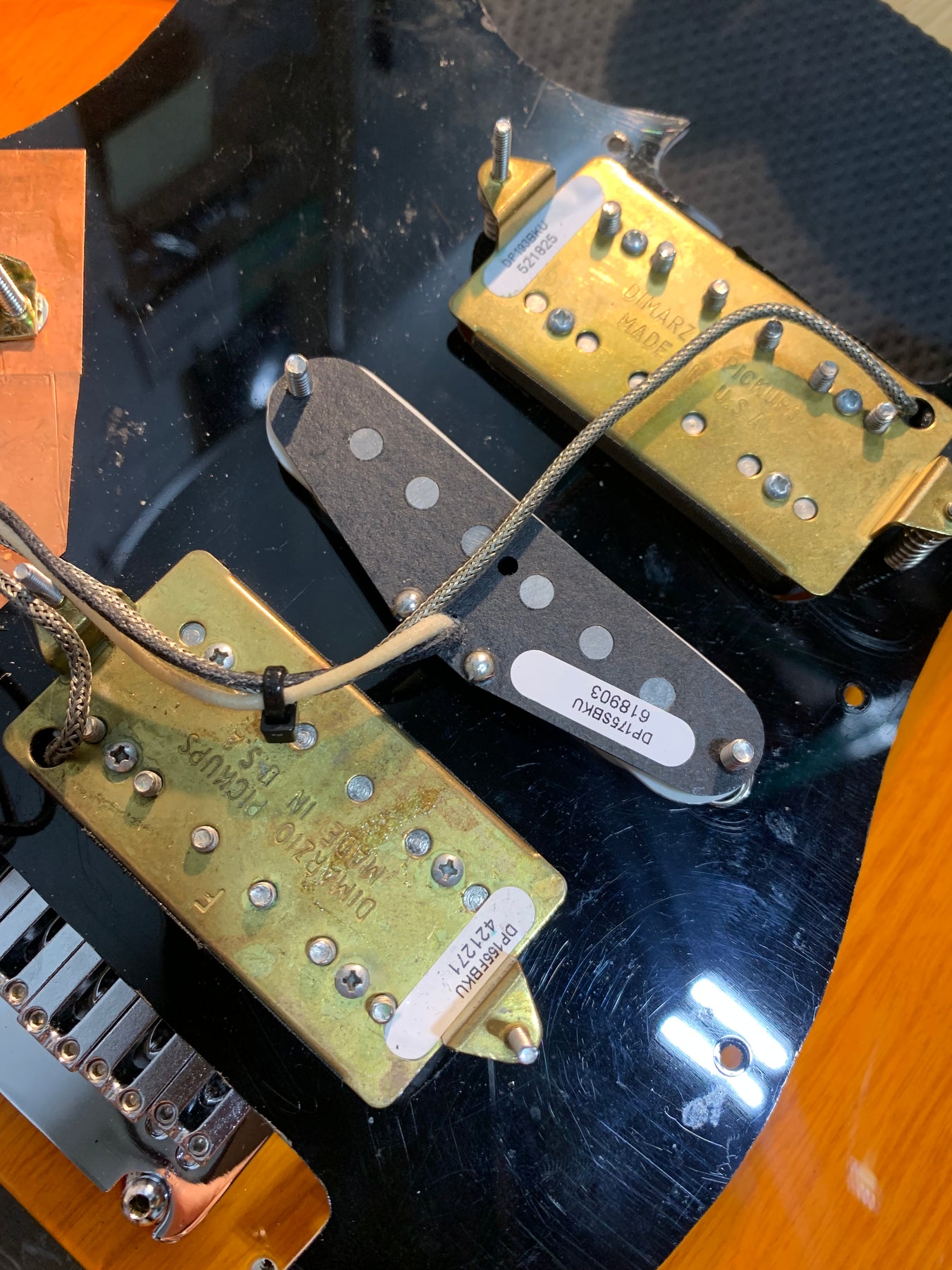 The pickups have been swapped for a DiMarzio HSH configuration and all of the electronics and guard have also been replaced. The tops of the tuners have also been replaced. The original pickups and electronics/pickguard are included inside the gig bag.