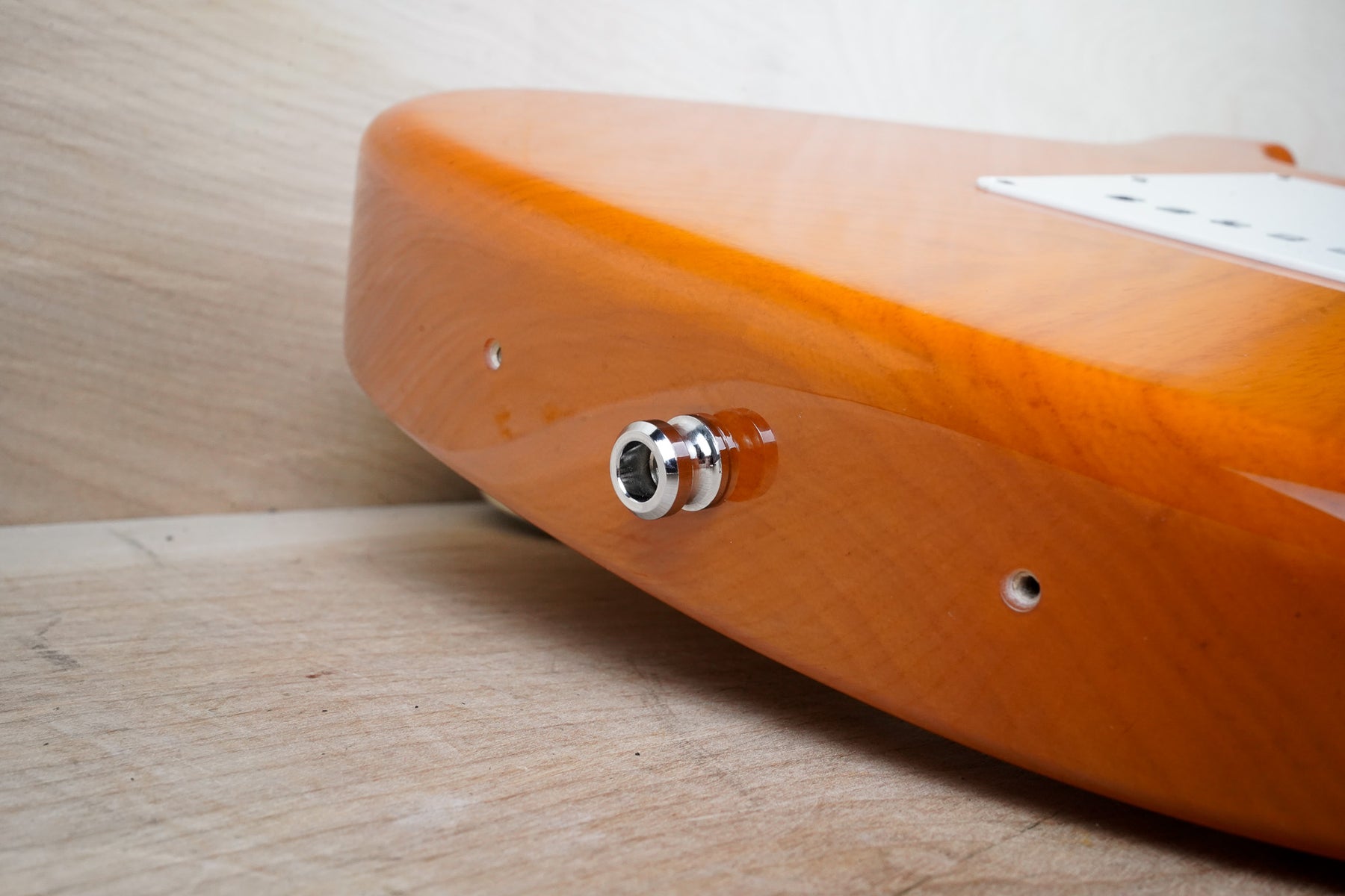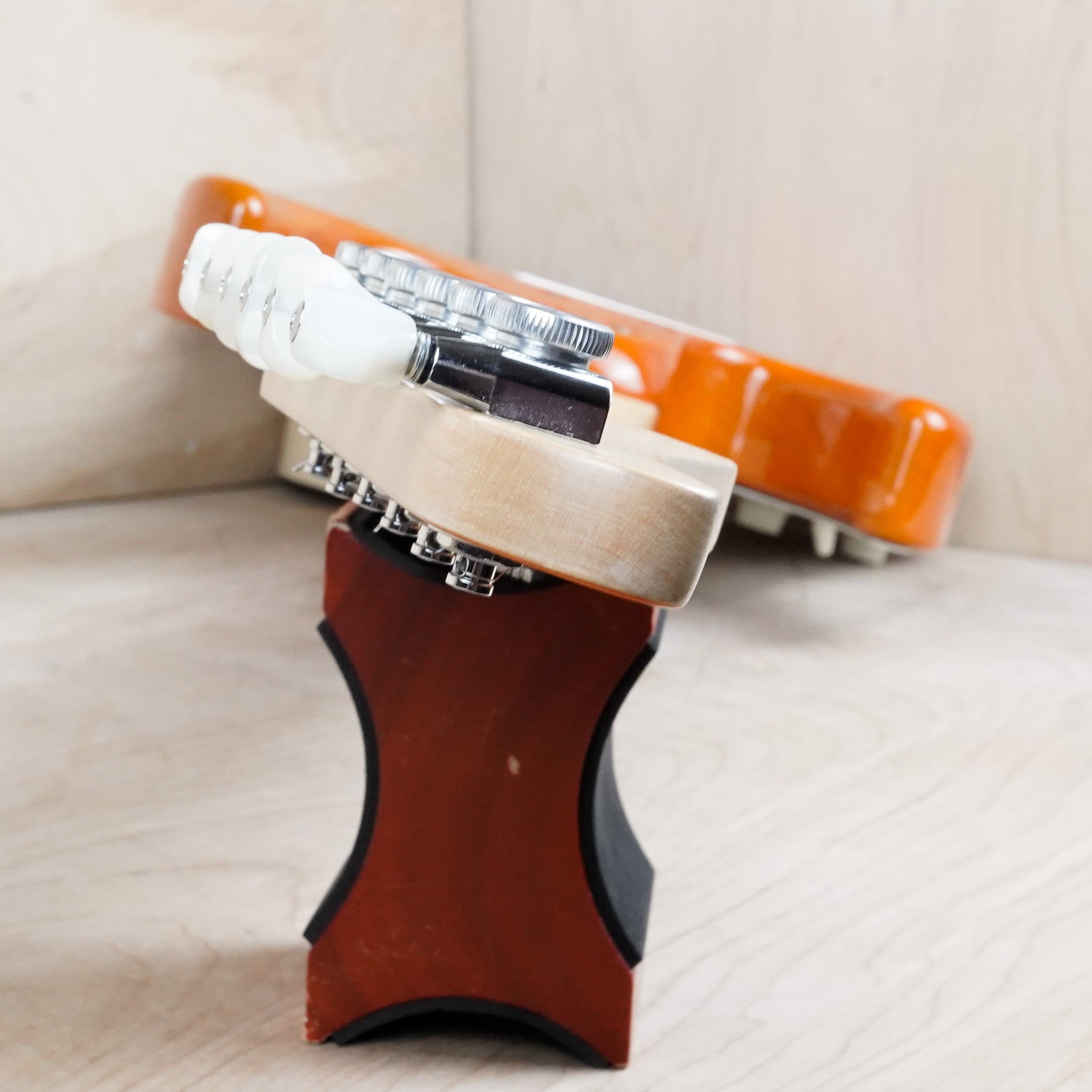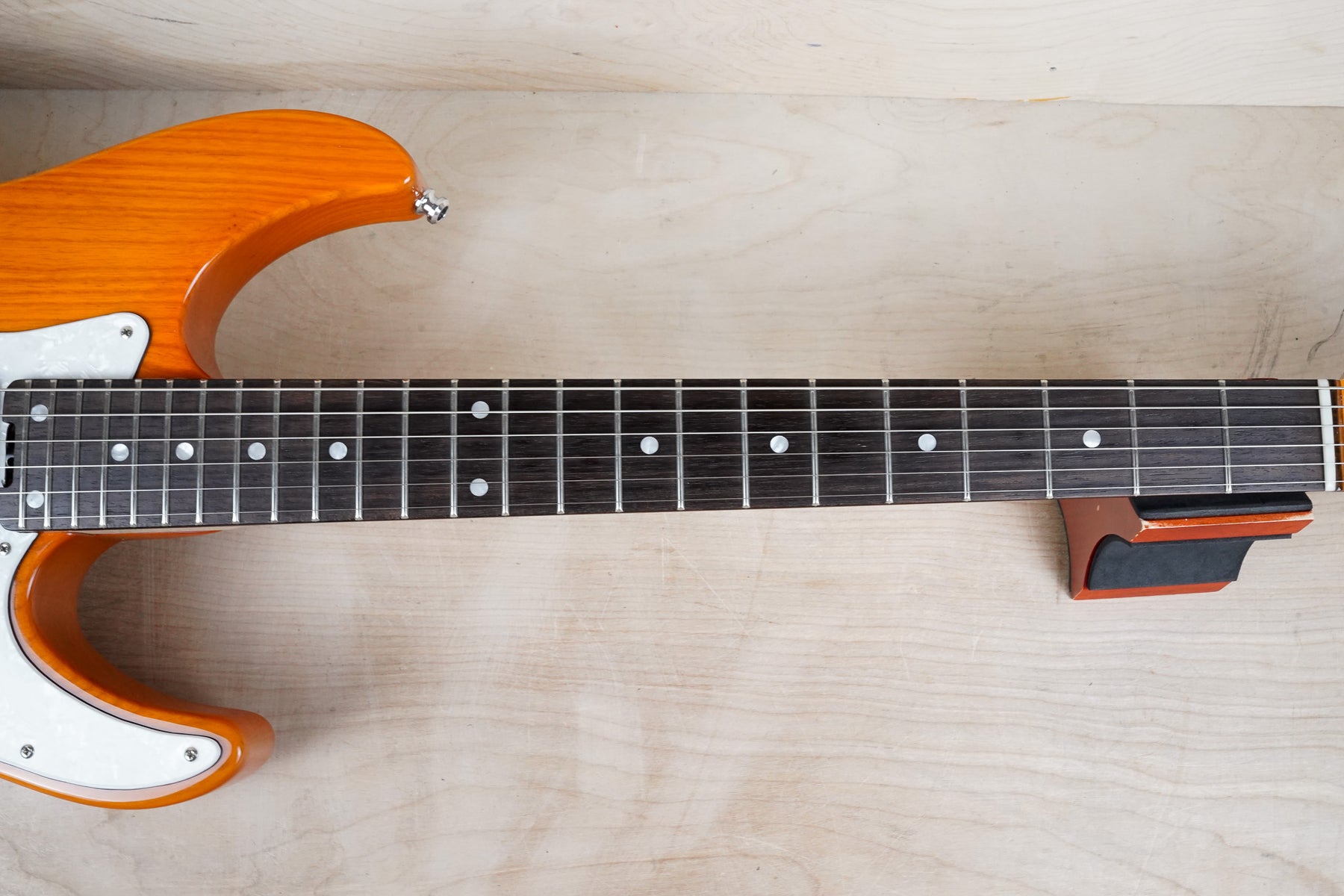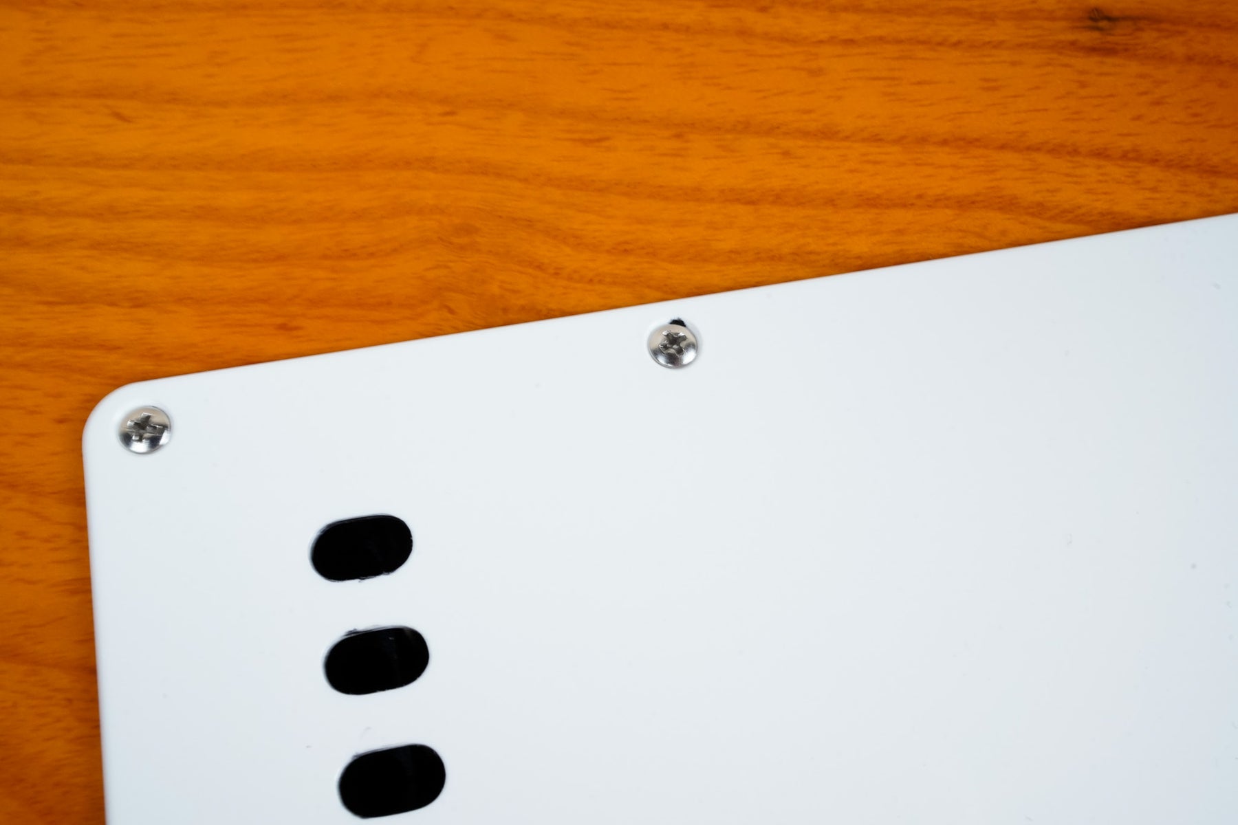 The pickups have been swapped for a DiMarzio HSH configuration and all of the electronics and guard have also been replaced. The tops of the tuners have also been replaced. The original pickups and electronics/pickguard are included inside the gig bag.