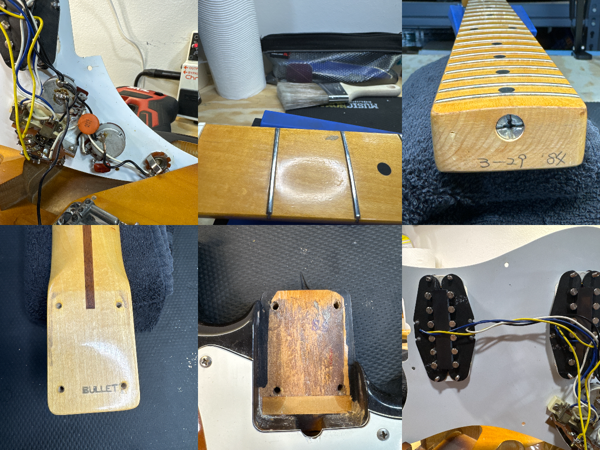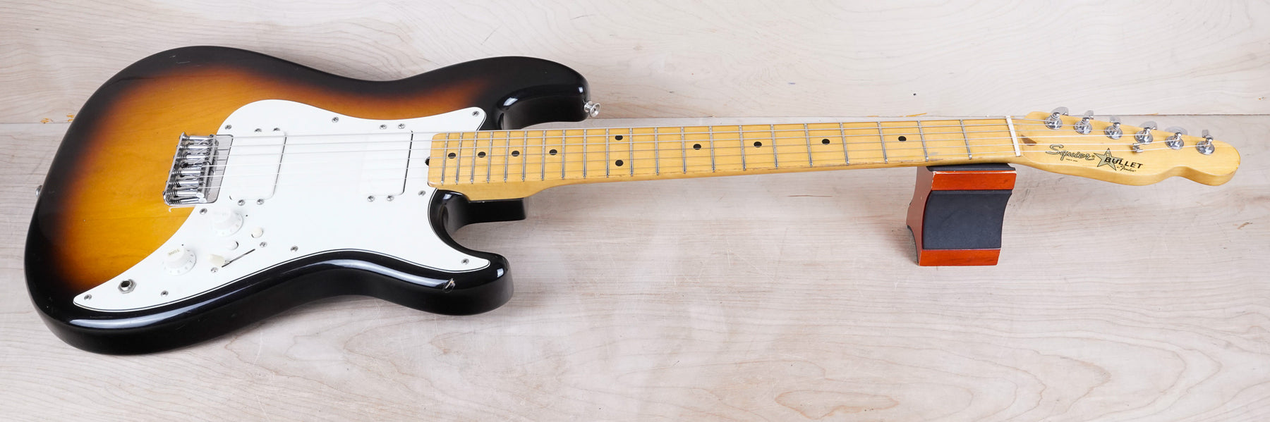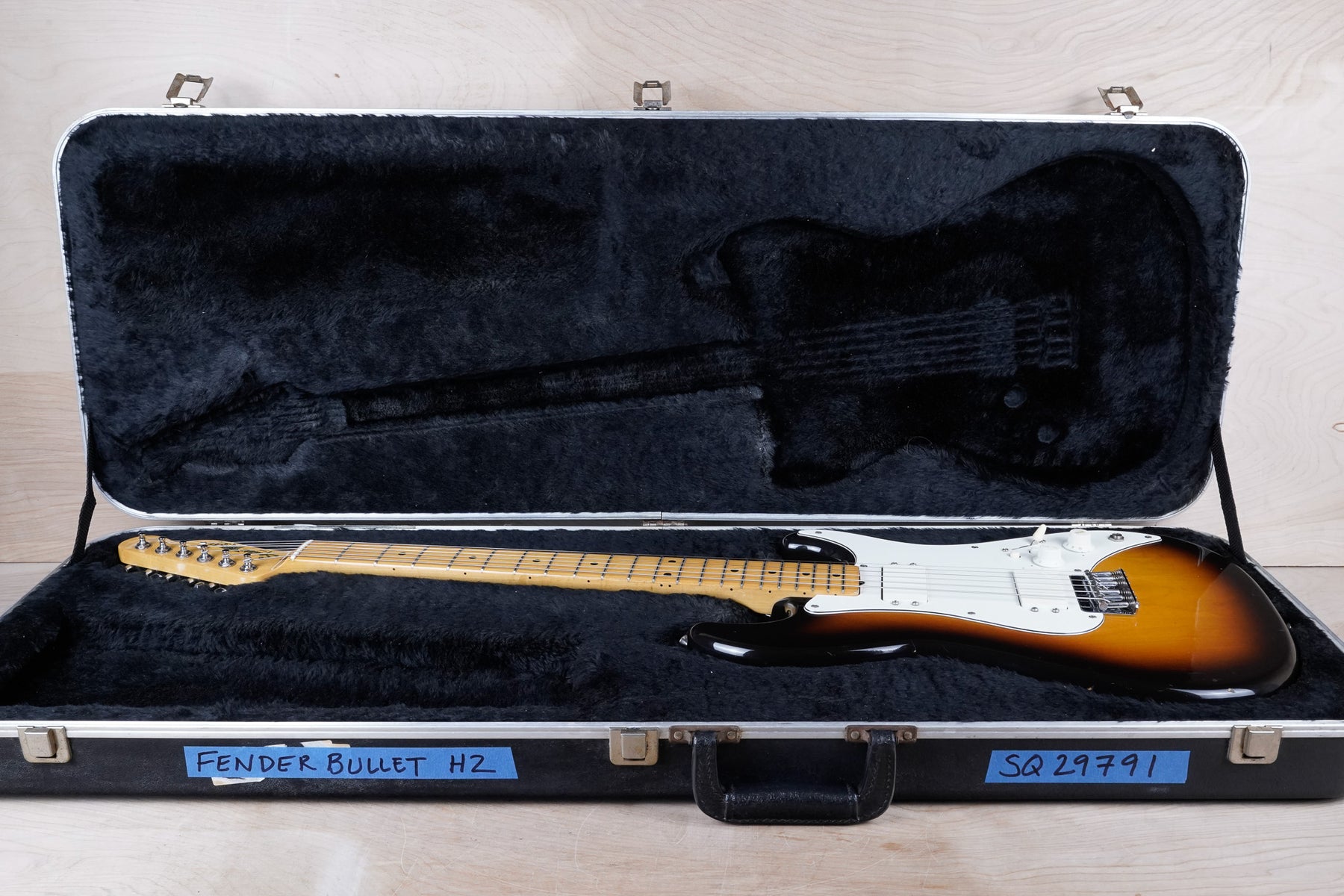 This vintage Squier Bullet H2 plays and sounds great! The H2 model sports two humbuckers with 2 button controls for coil tapping capabilities. The guitar is comprised of an alder body, "D" shape maple neck, and maple fretboard.