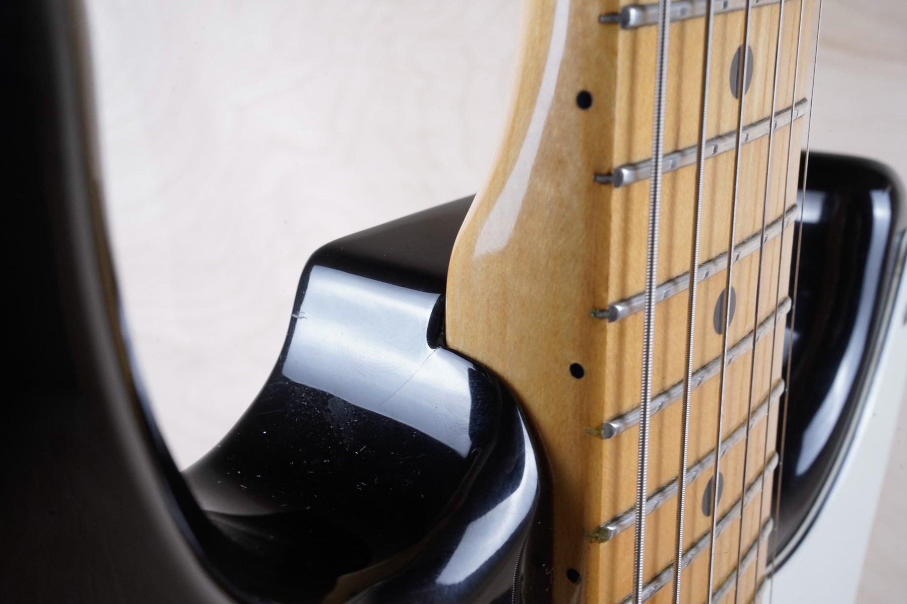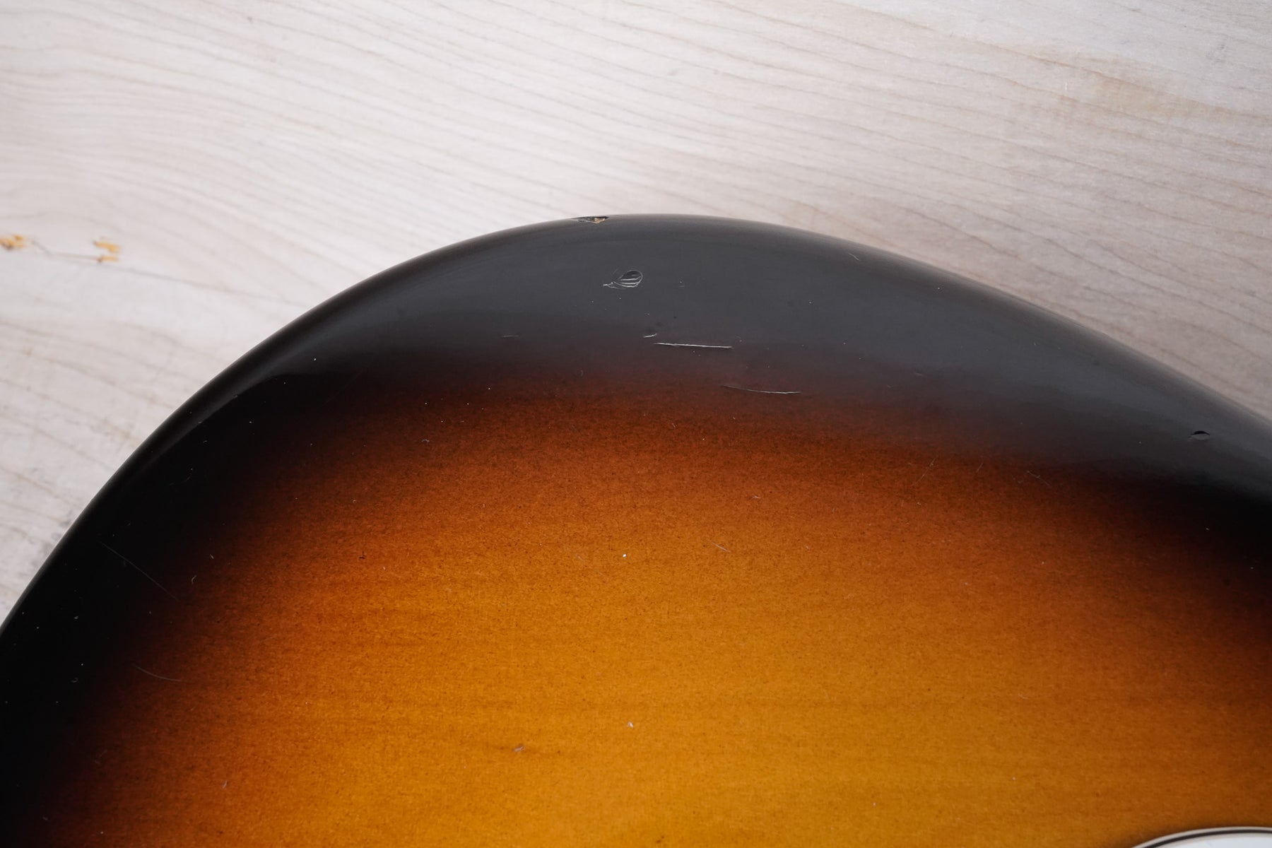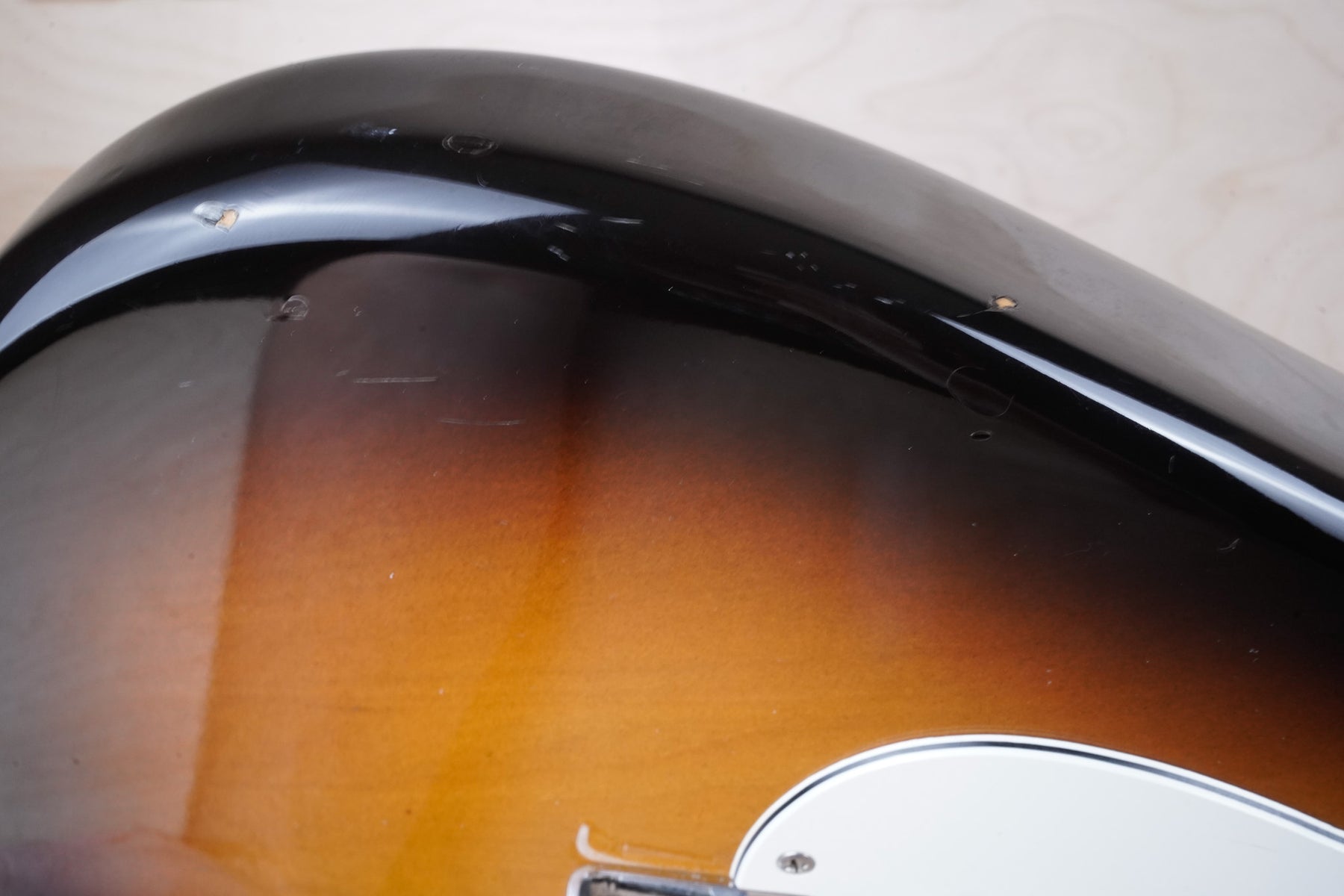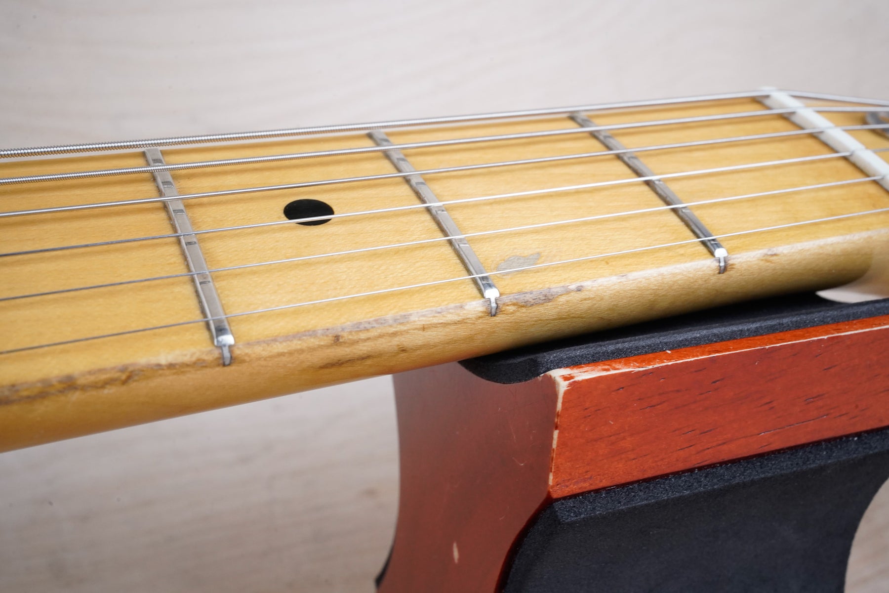 This guitar does show some cosmetic wear from over the years that includes various surface scratches, scuffs, dents, and finish chips throughout the body with additional dings along the back of the neck and headstock. The maple fretboard also shows some lacquer wear near the second fret. The frets are used but otherwise still play great along the neck and the electronics work as they should.