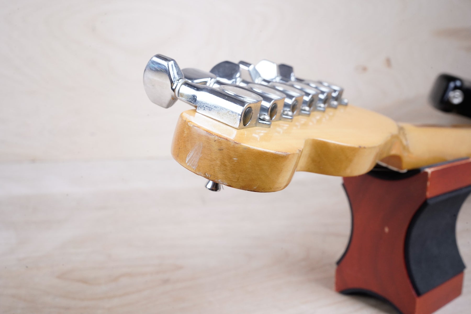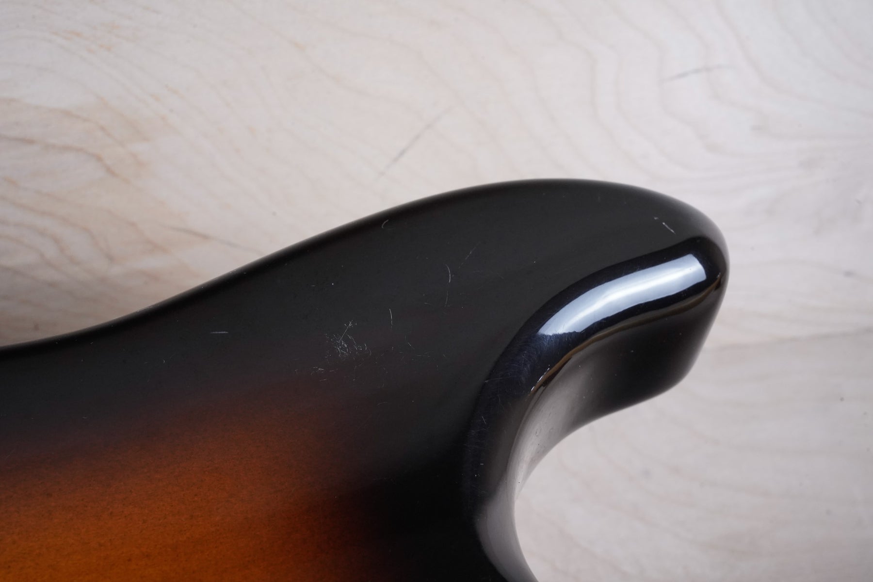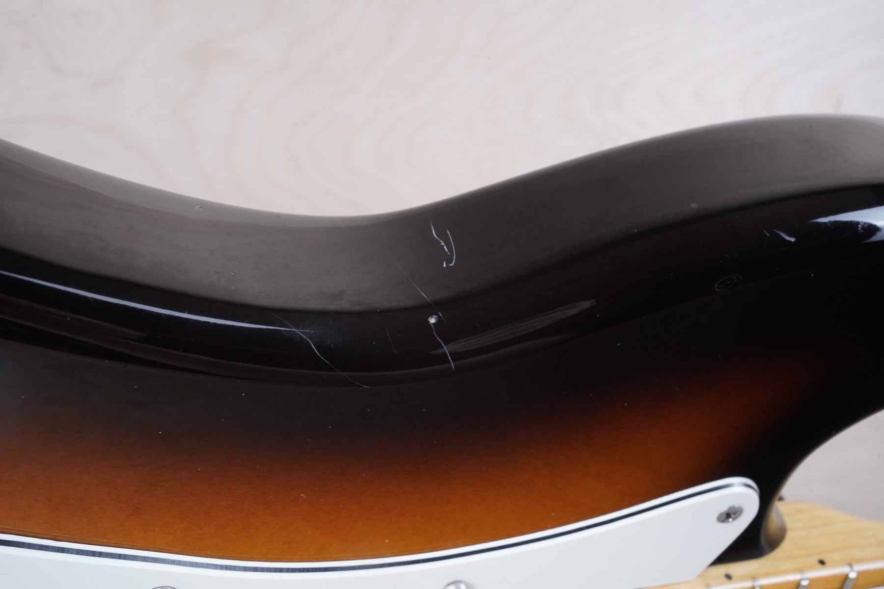This guitar does show some cosmetic wear from over the years that includes various surface scratches, scuffs, dents, and finish chips throughout the body with additional dings along the back of the neck and headstock. The maple fretboard also shows some lacquer wear near the second fret. The frets are used but otherwise still play great along the neck and the electronics work as they should.