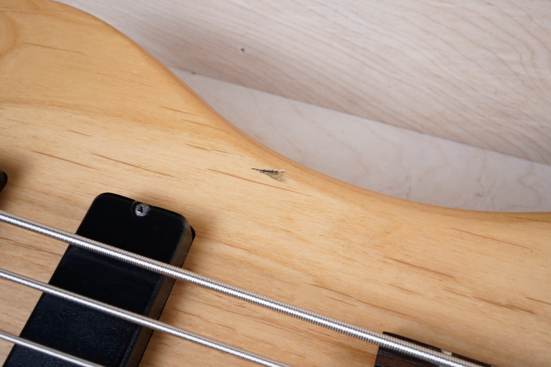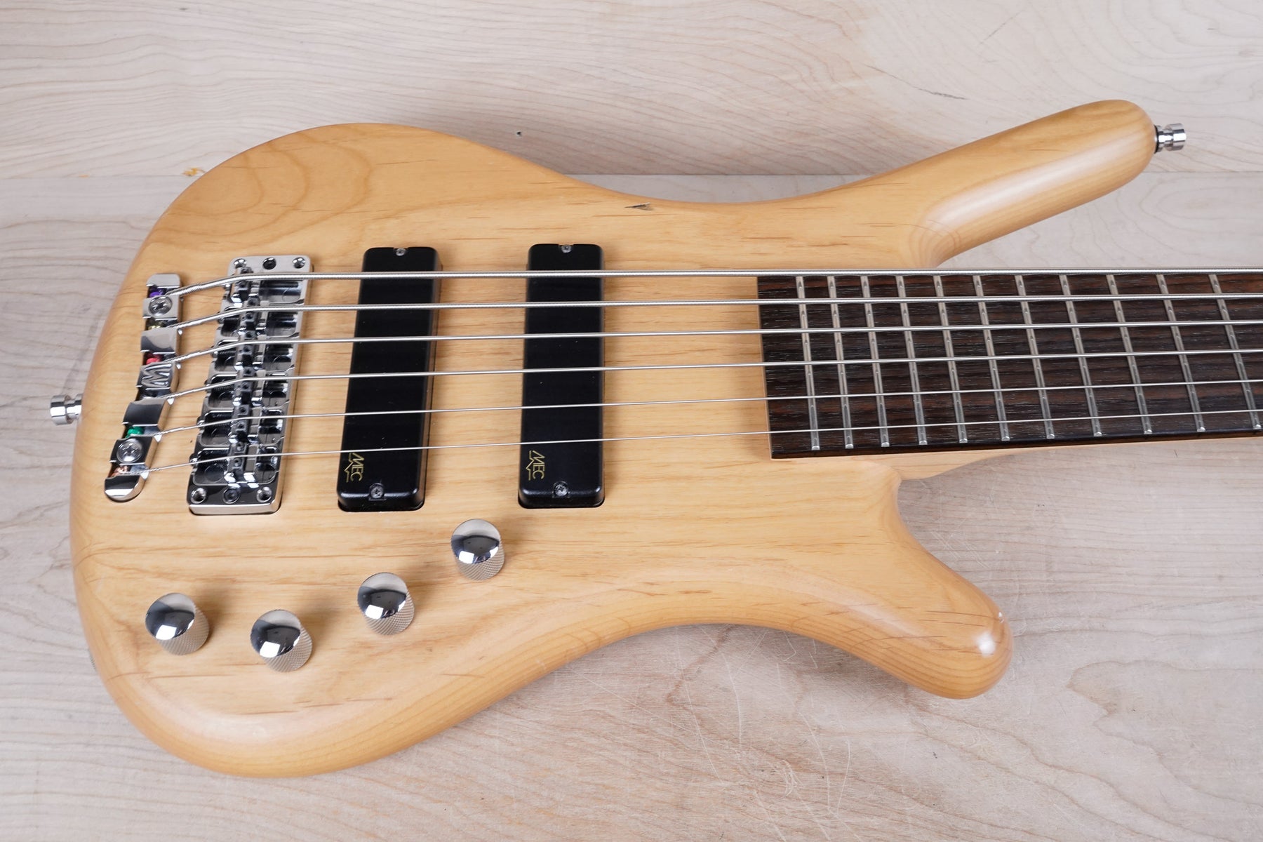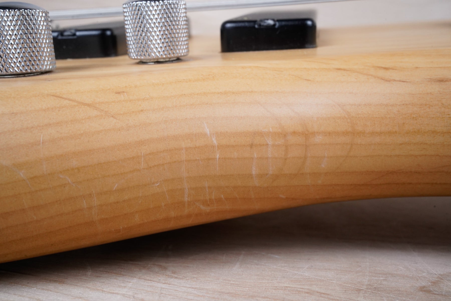 This bass does show some cosmetic wear that includes various surface scratches, scuffs, and dents throughout the body with additional small dings along the back of the neck and headstock. The frets are still in nice shape and the electronics work as they should.