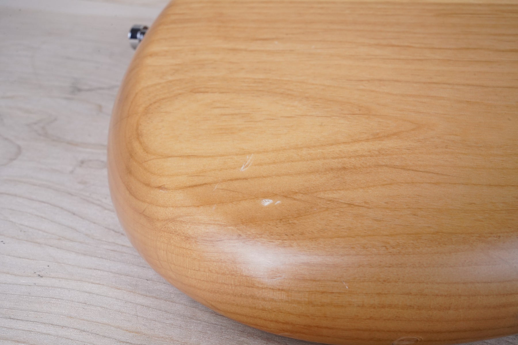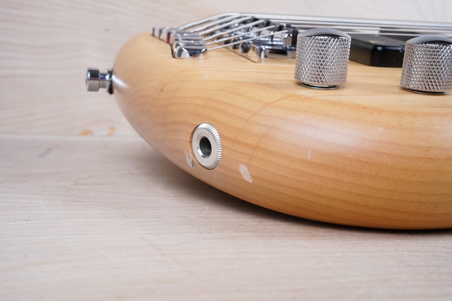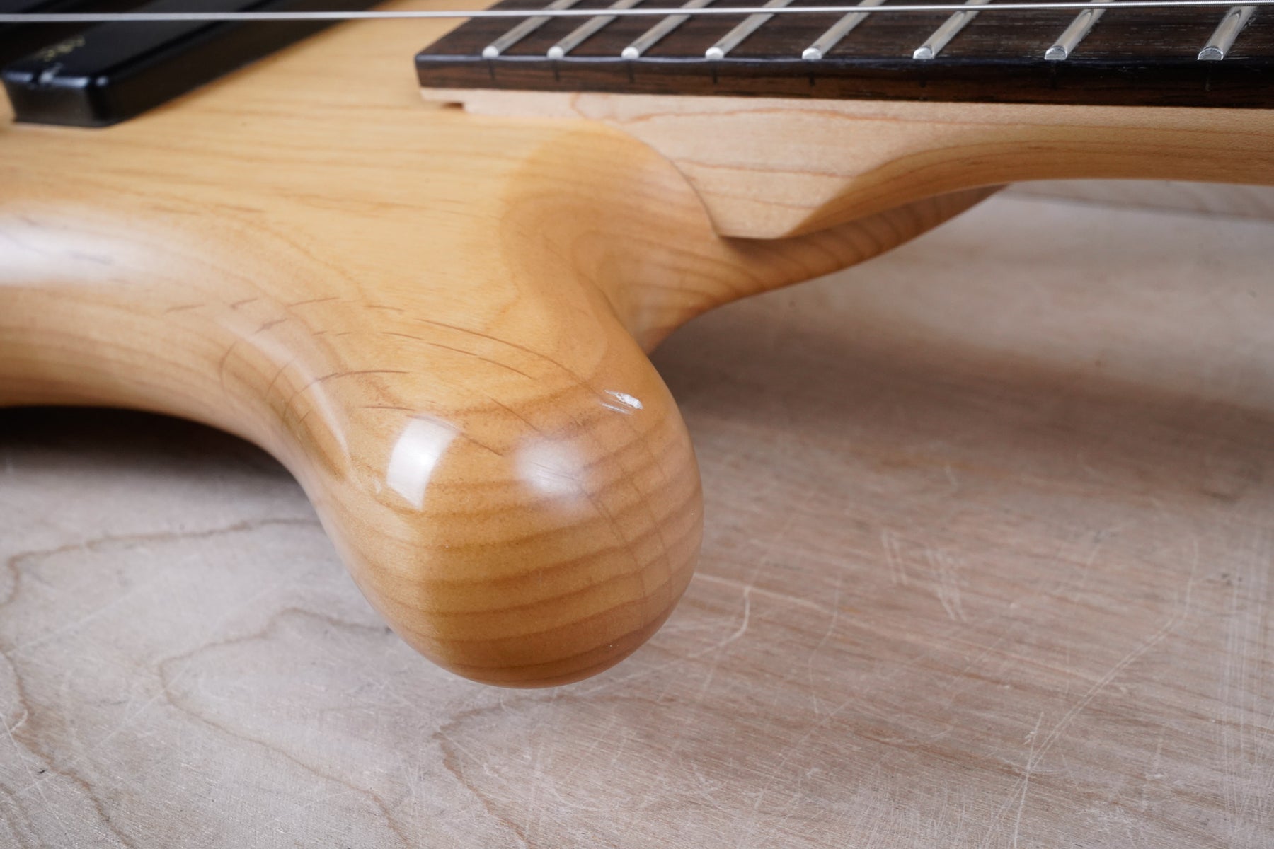 This bass does show some cosmetic wear that includes various surface scratches, scuffs, and dents throughout the body with additional small dings along the back of the neck and headstock. The frets are still in nice shape and the electronics work as they should.