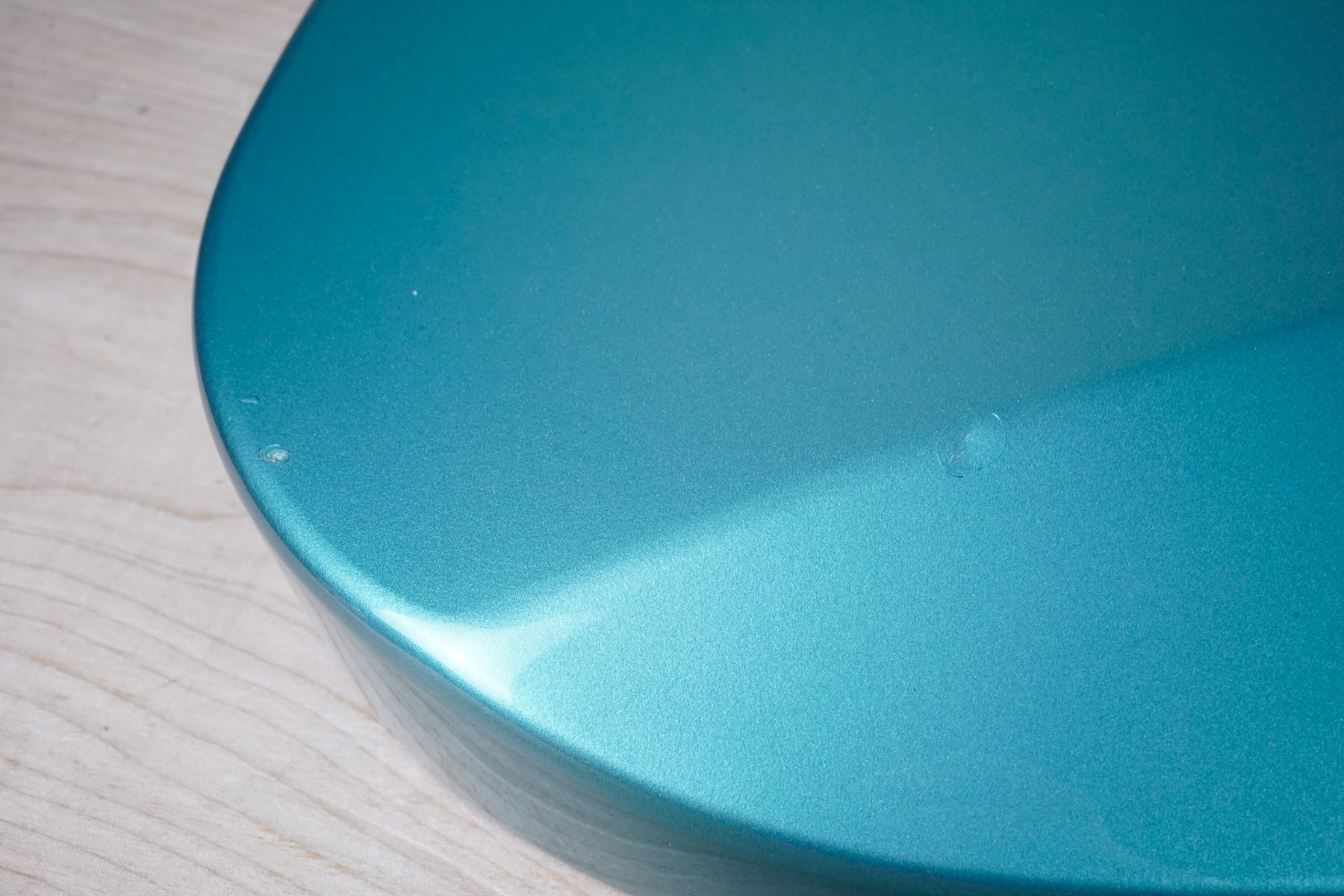 This guitar does show some minor cosmetic wear that includes a few finish dents located on the back of the side of the body and a couple of small dings located on the headstock. The frets play great and the electronics work as they should.
