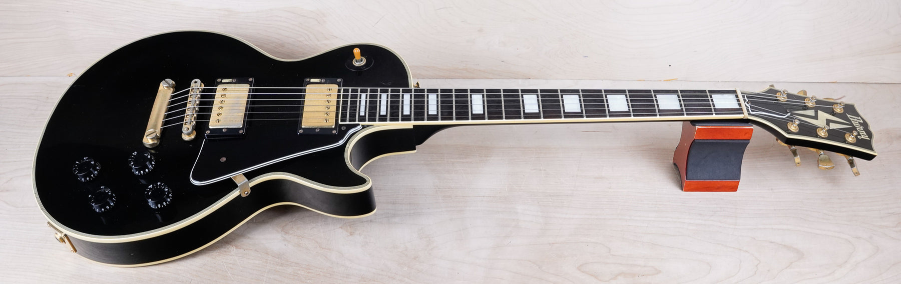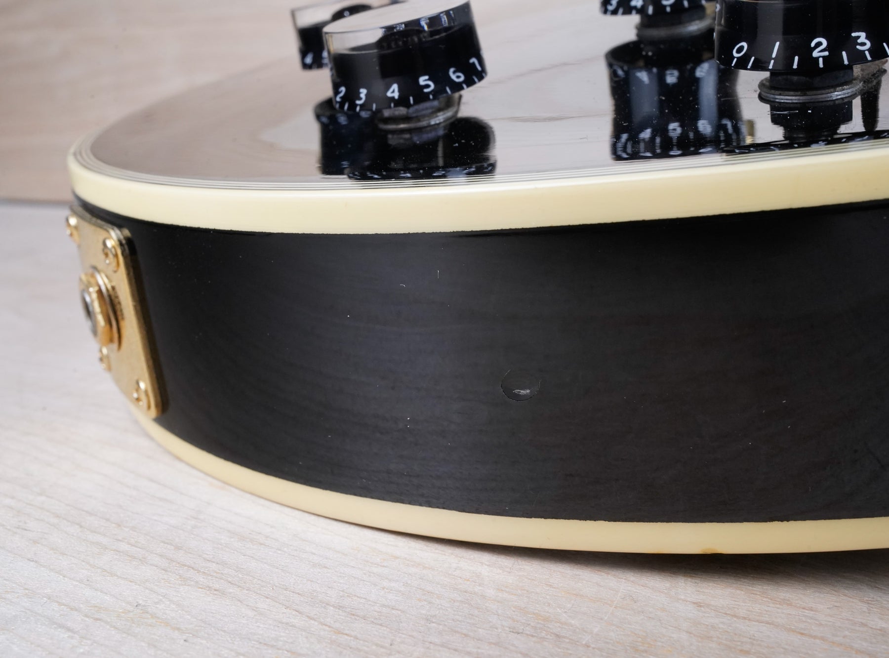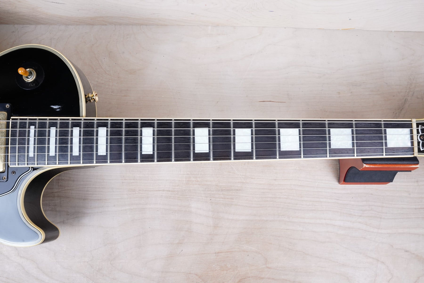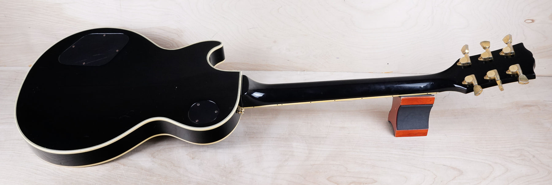 This Burny RLC-60 Custom plays and sounds great! This Burny is a take on the iconic 1960 Les Paul Custom. The neck has a comfortable slim '60s neck profile. This guitar does not have a serial so the date of manufacture has been determined based on catalogs. The guitar is equipped with a set of VH-3 Humbuckers.