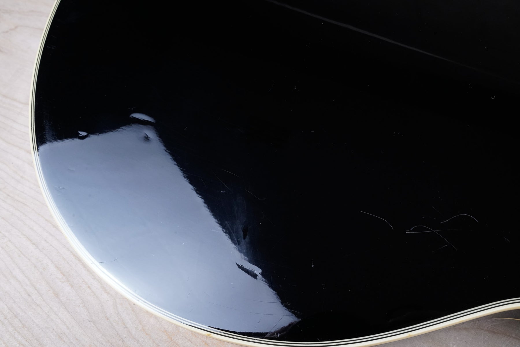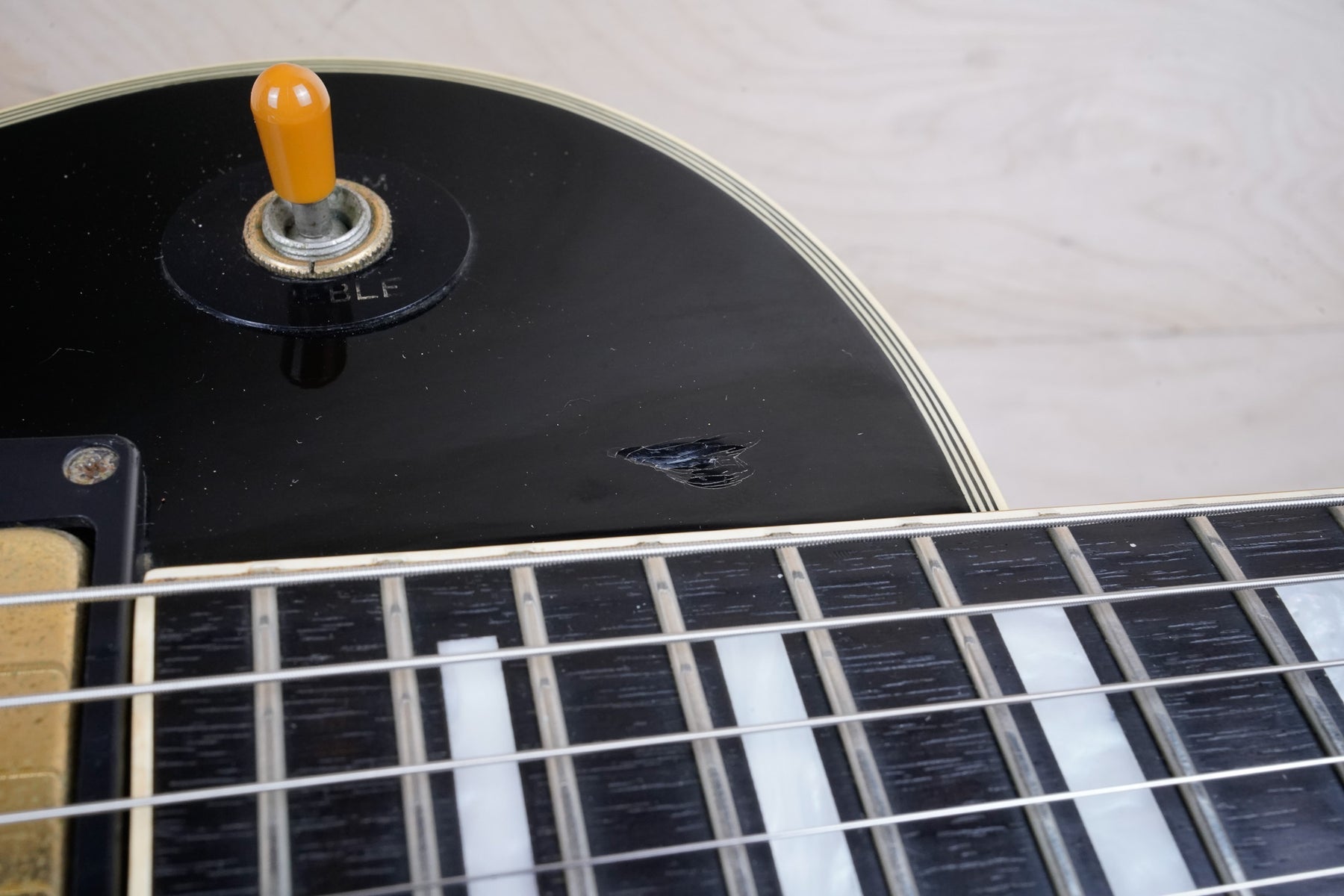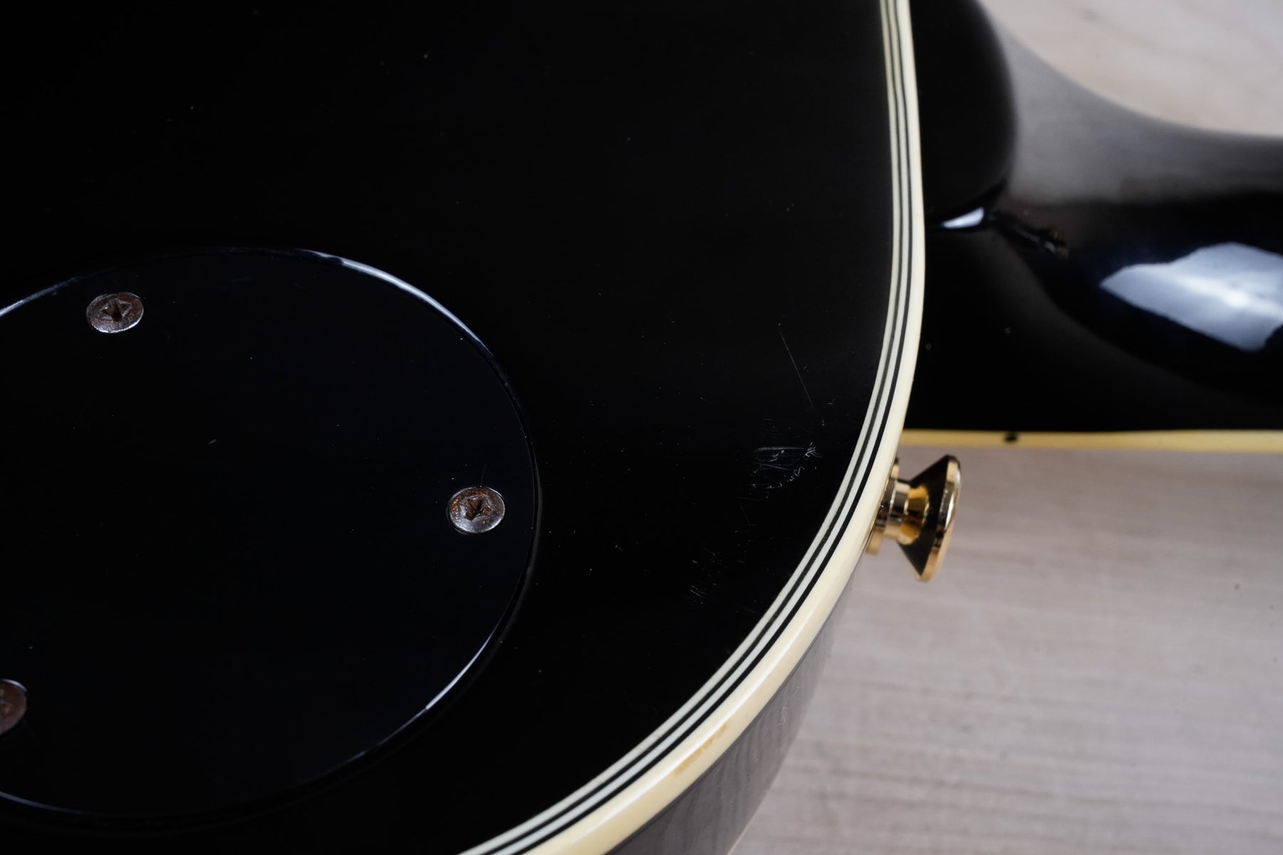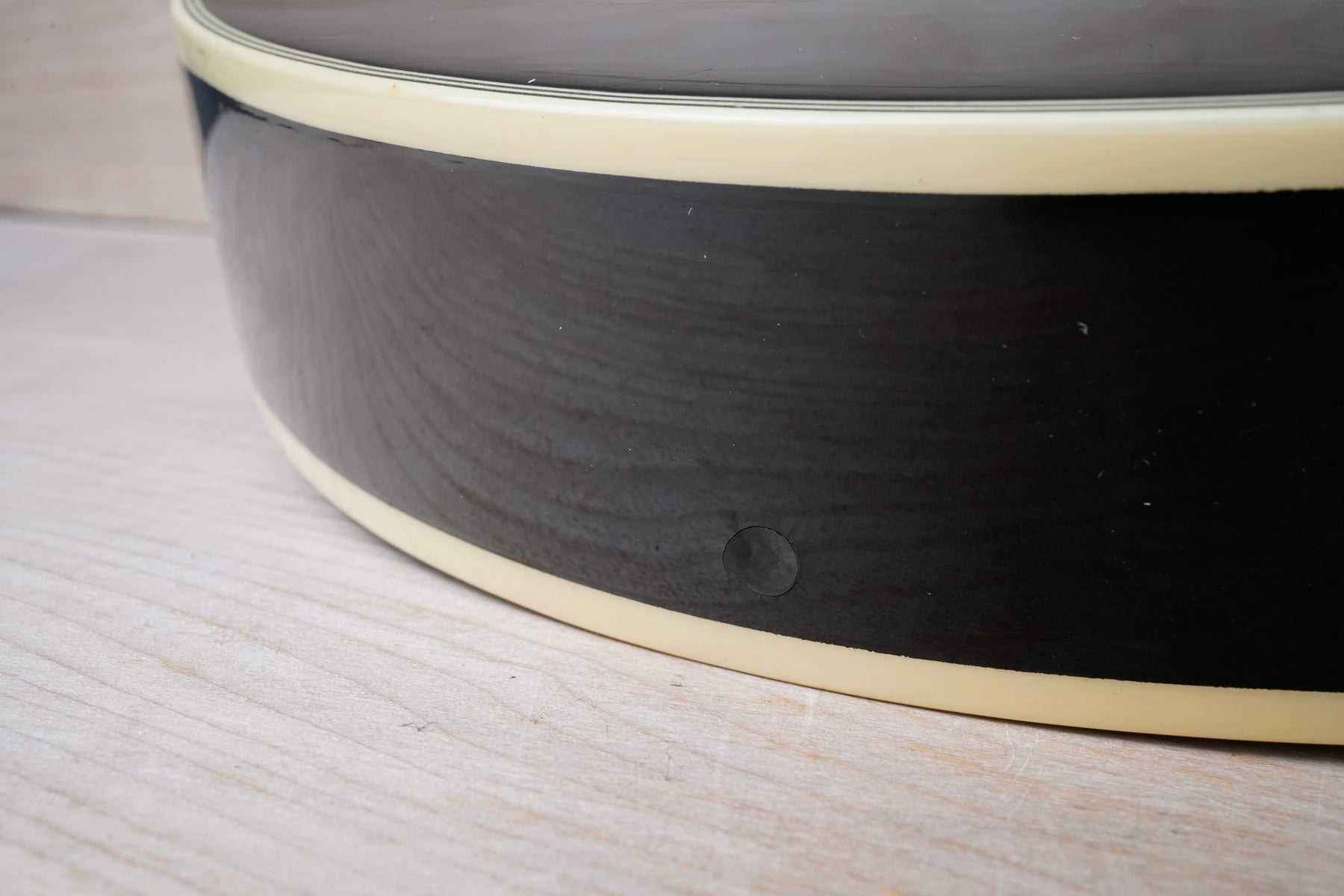 This guitar does show some cosmetic wear from over the years that includes various surface scratches, scuffs, and dents throughout the body with additional scratching along the back of the neck and headstock. The gold hardware shows normal tarnishing and the binding has yellowed from over time. The frets are used but still play great overall. Despite the cosmetic wear, there are no breaks or repairs and all of the electronics work as they should.