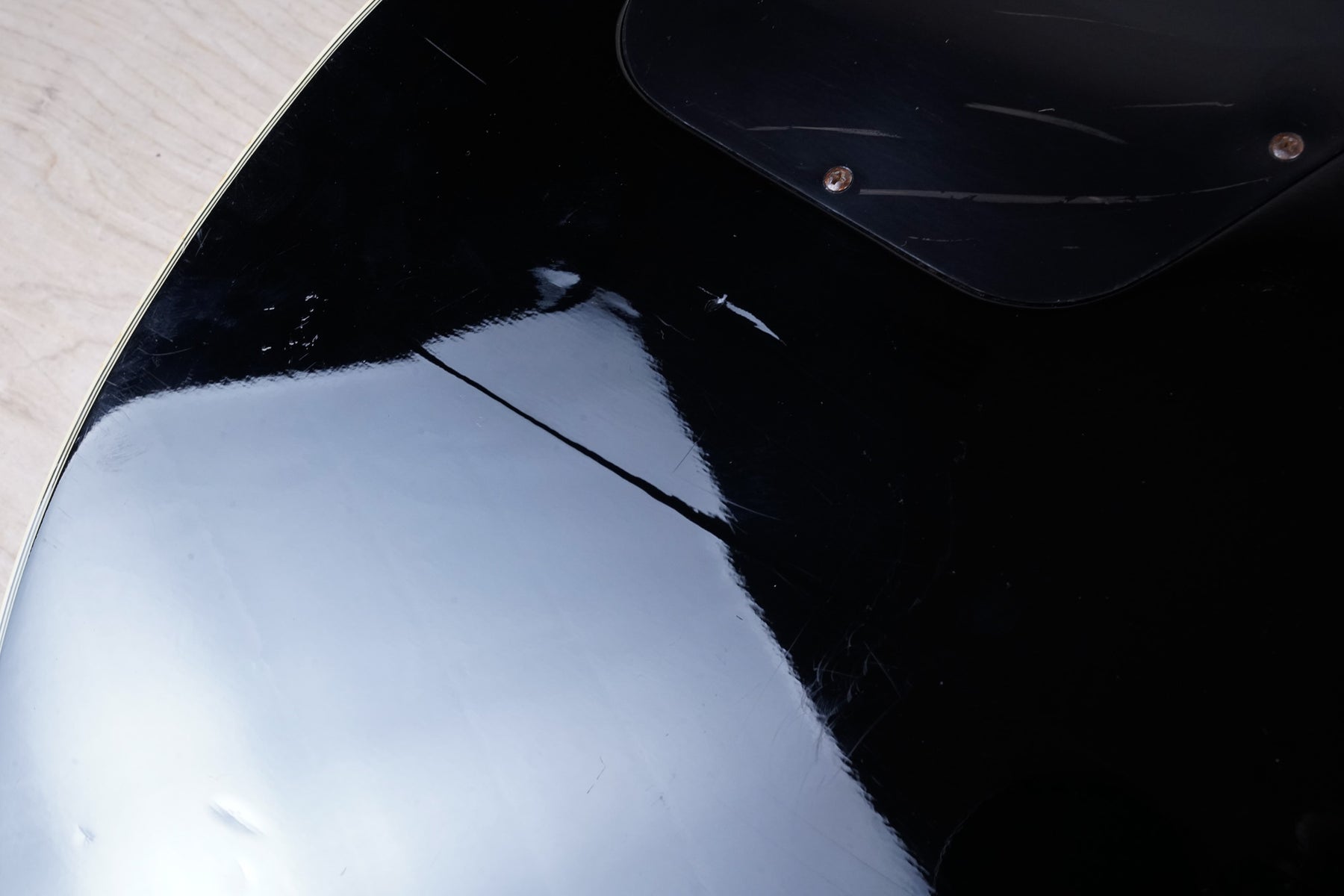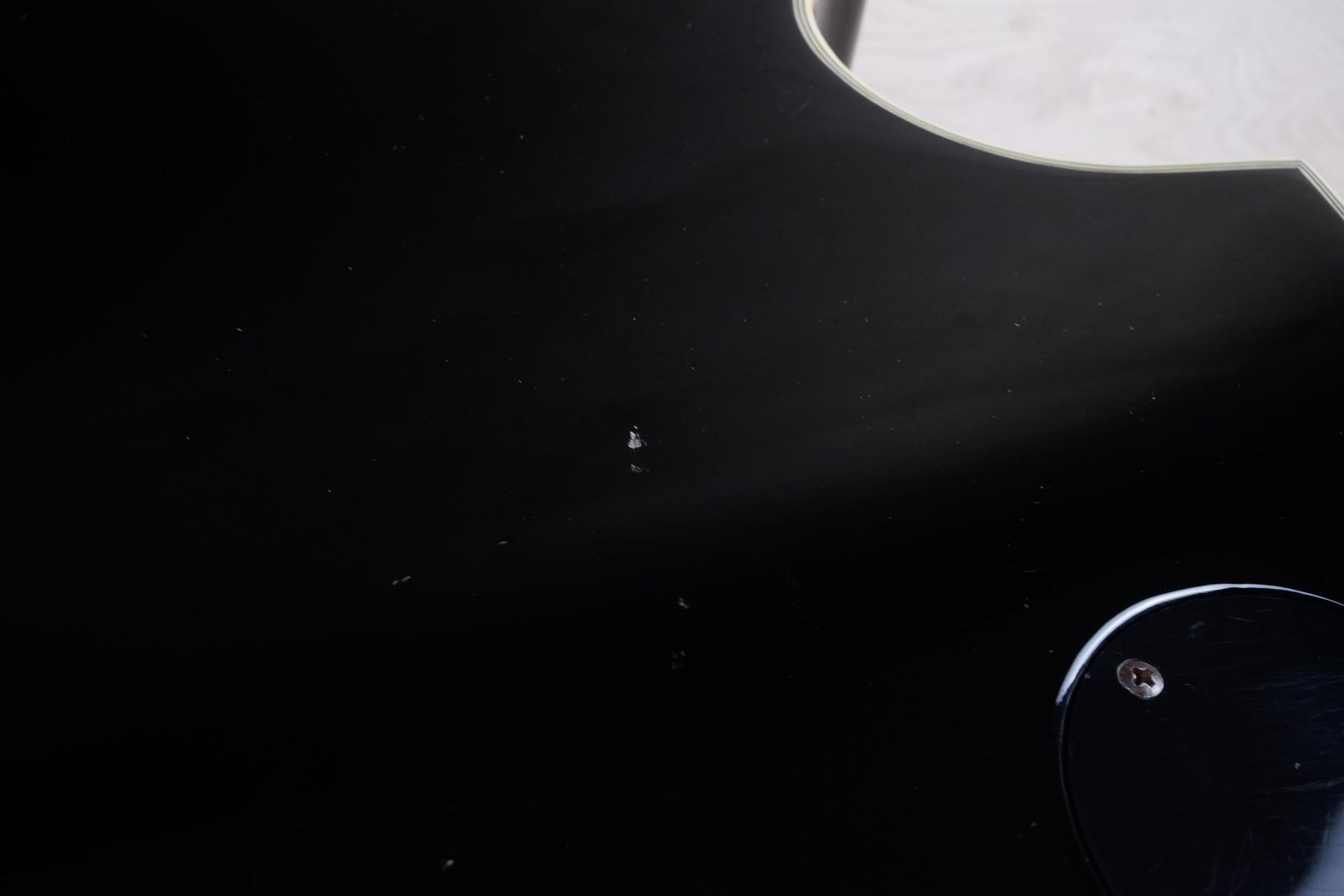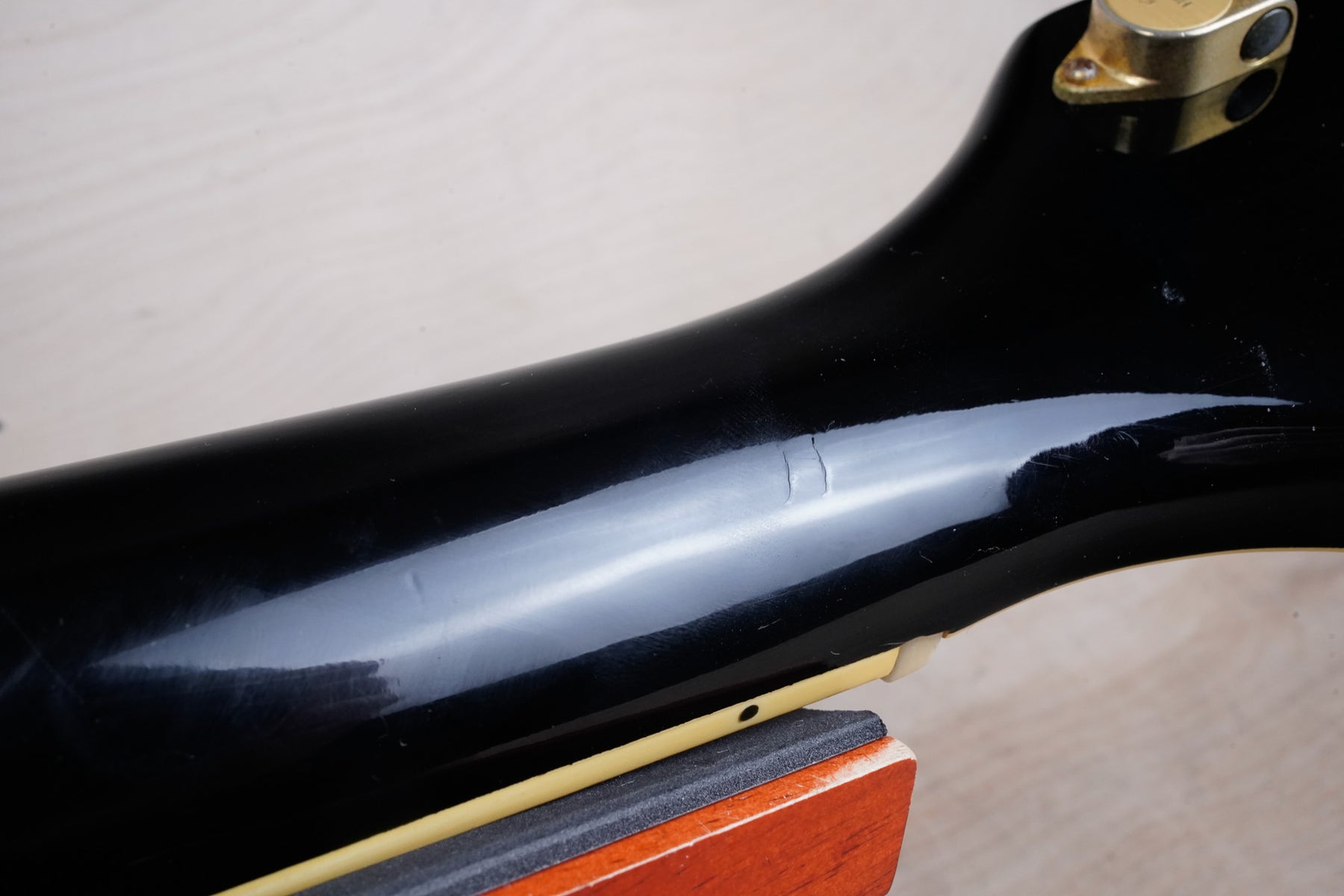 This guitar does show some cosmetic wear from over the years that includes various surface scratches, scuffs, and dents throughout the body with additional scratching along the back of the neck and headstock. The gold hardware shows normal tarnishing and the binding has yellowed from over time. The frets are used but still play great overall. Despite the cosmetic wear, there are no breaks or repairs and all of the electronics work as they should.