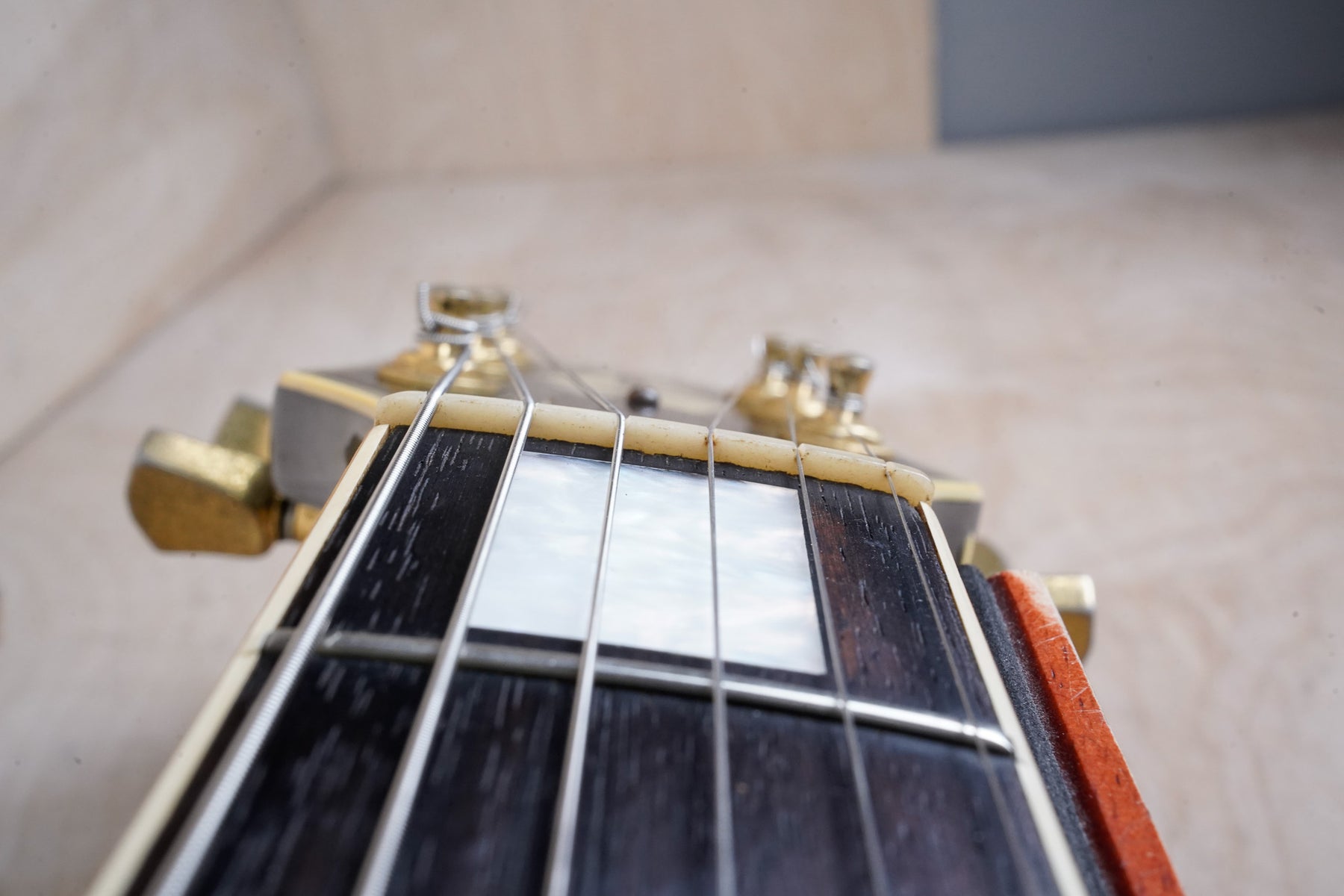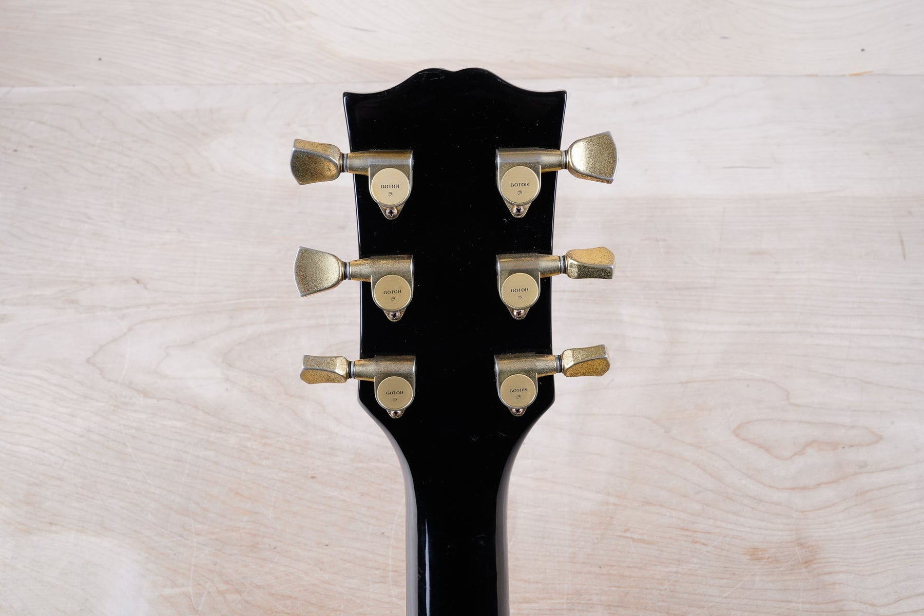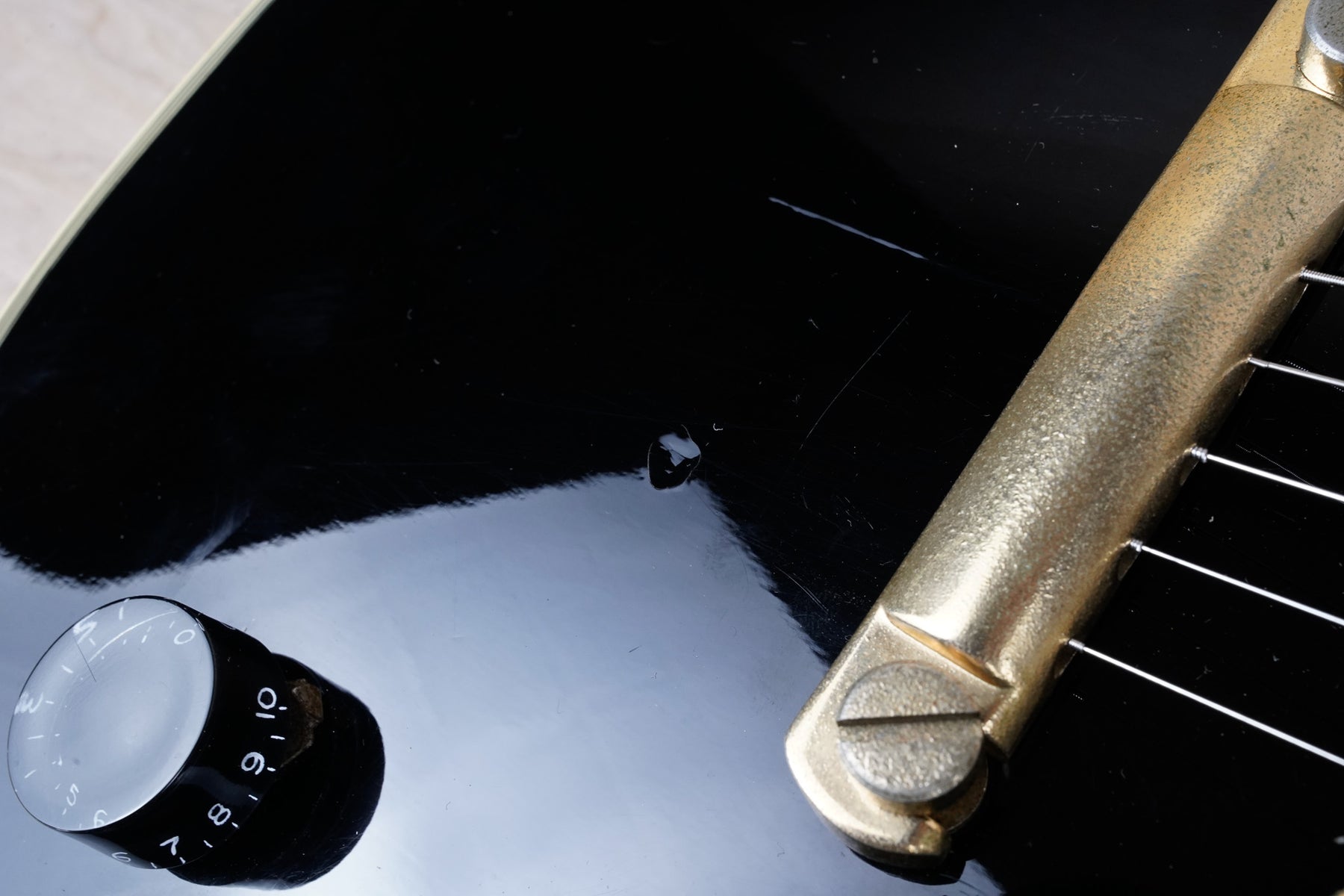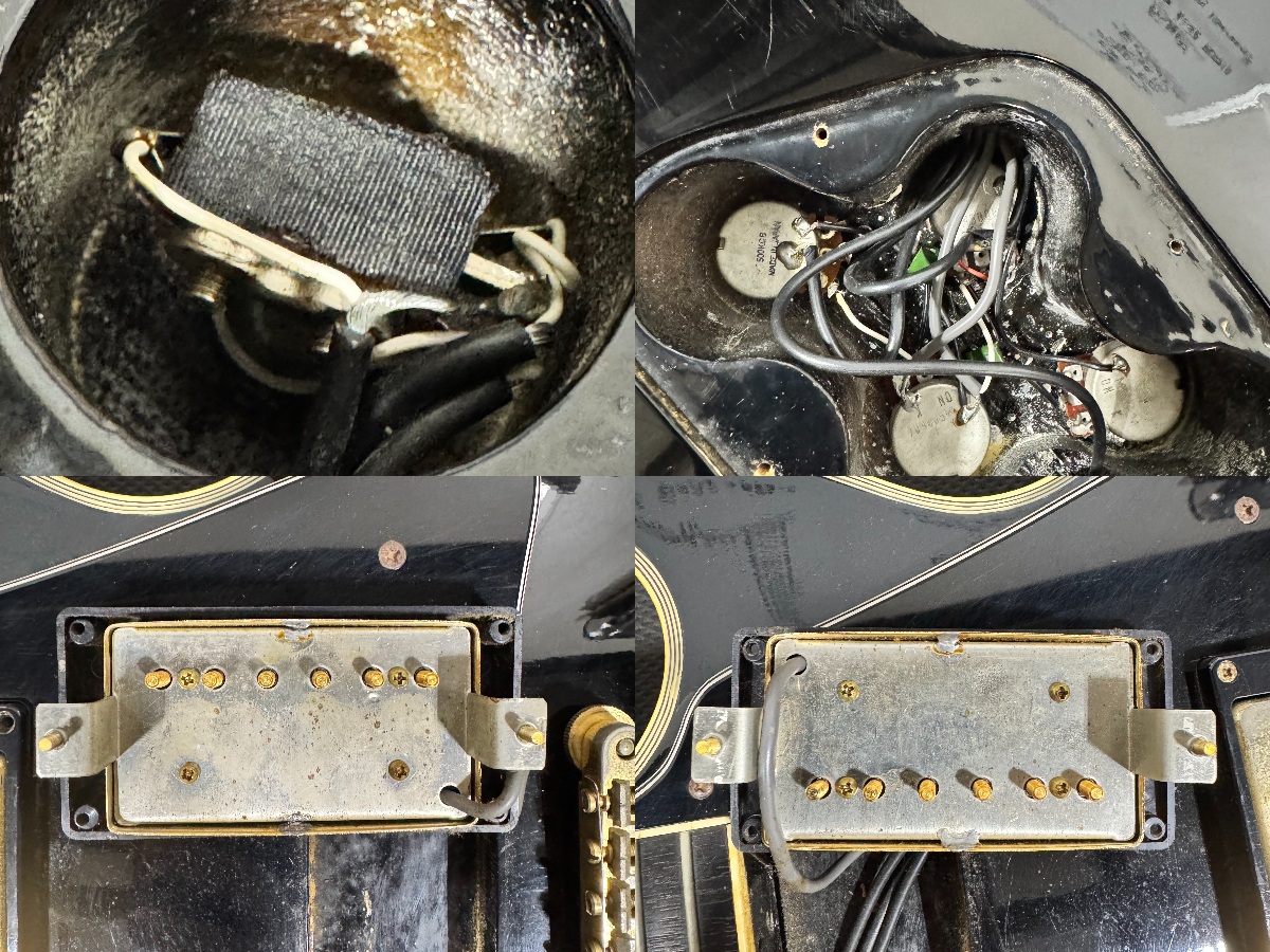 This guitar does show some cosmetic wear from over the years that includes various surface scratches, scuffs, and dents throughout the body with additional scratching along the back of the neck and headstock. The gold hardware shows normal tarnishing and the binding has yellowed from over time. The frets are used but still play great overall. Despite the cosmetic wear, there are no breaks or repairs and all of the electronics work as they should.