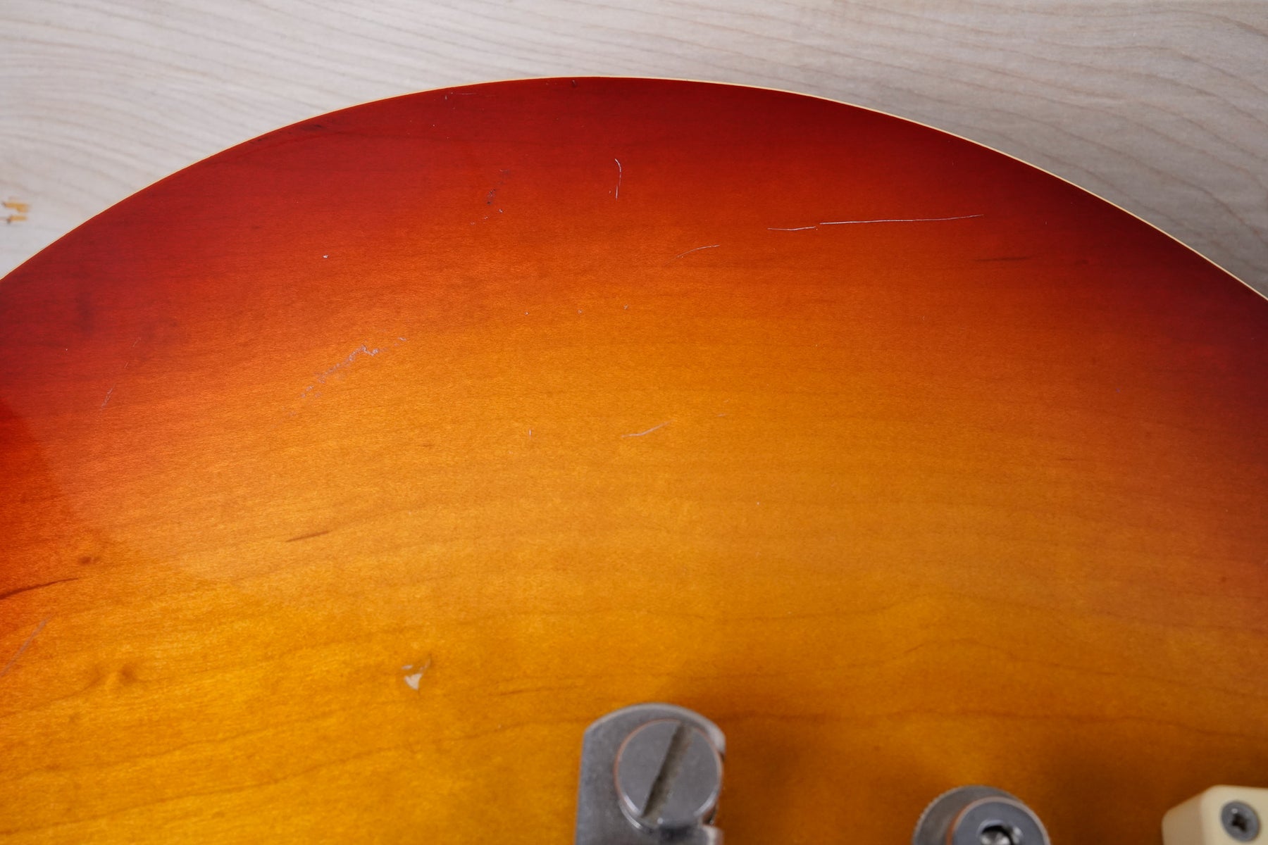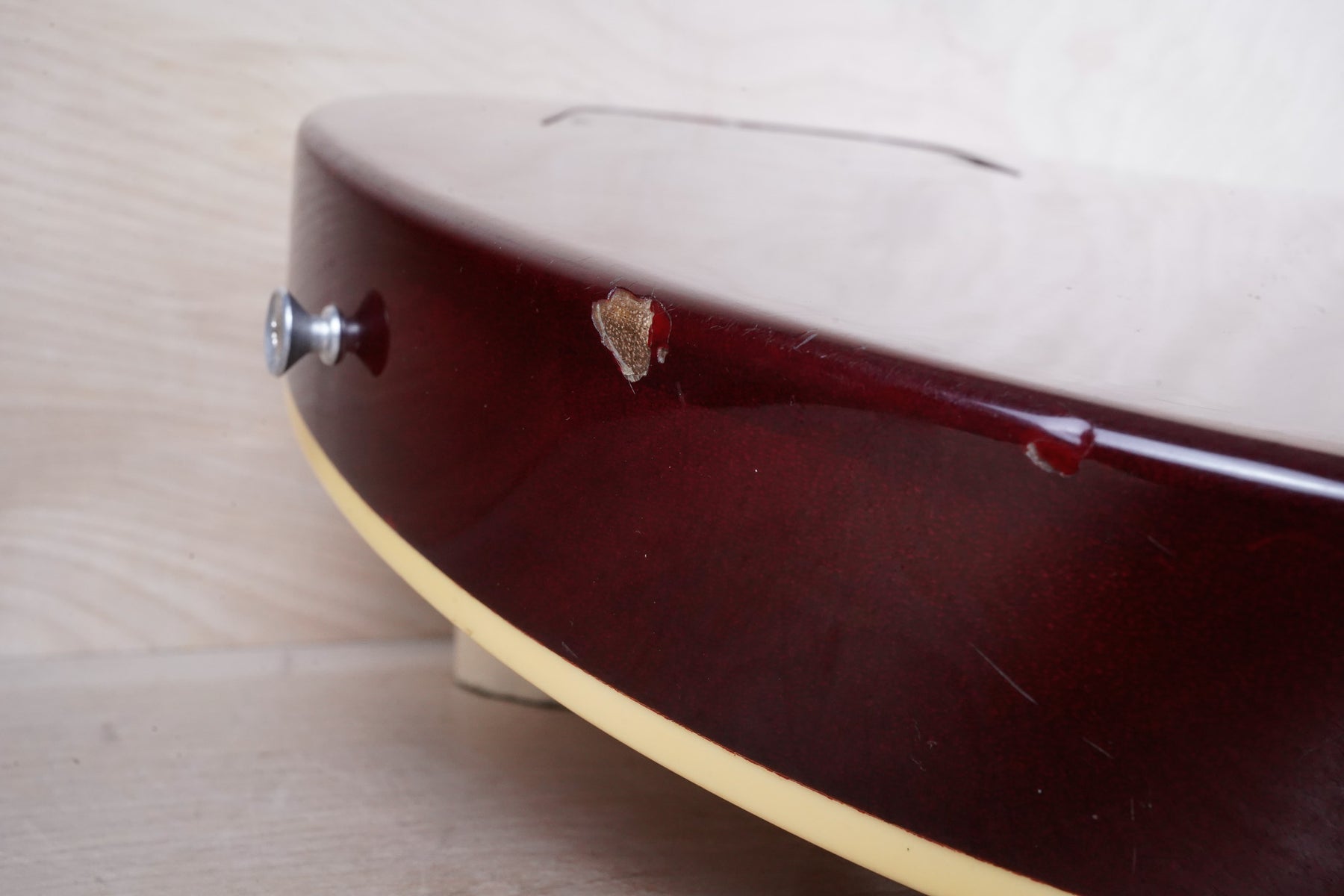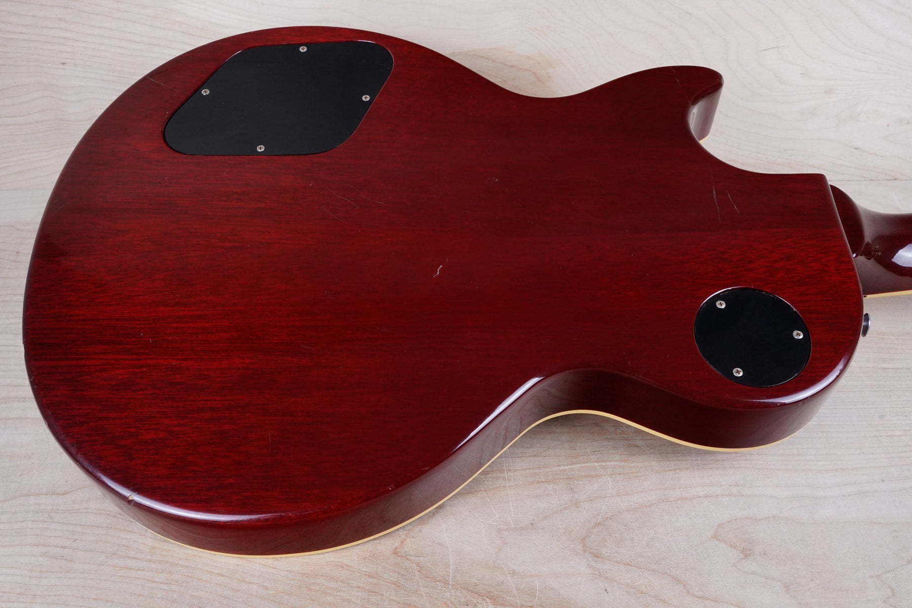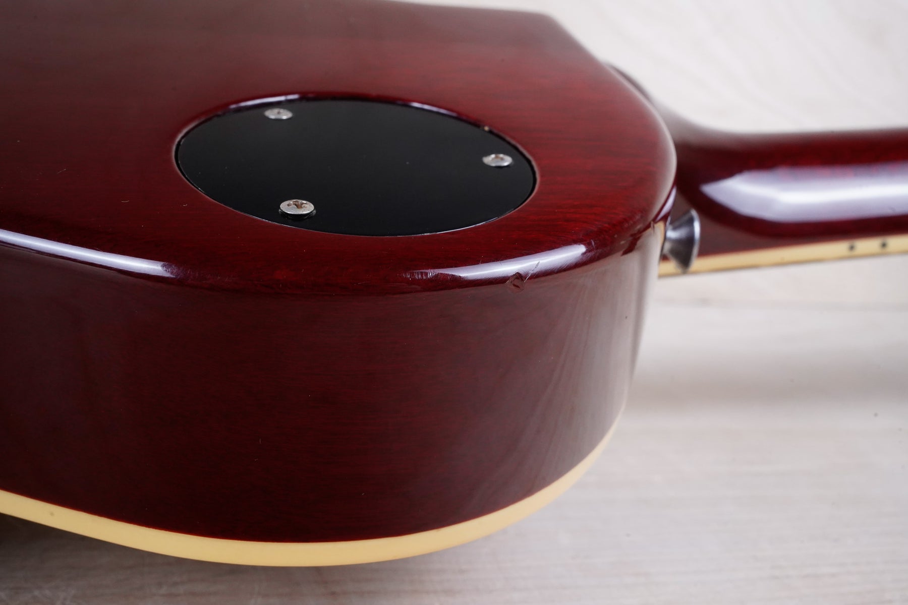 This guitar does show some cosmetic wear from over the years that includes various surface scratches, scuffs, and dents throughout the body with additional dings along the back of the neck and headstock. The binding and plastics have yellowed from over time and the hardware shows normal tarnishing. The frets are used but still play great and the electronics work as they should.