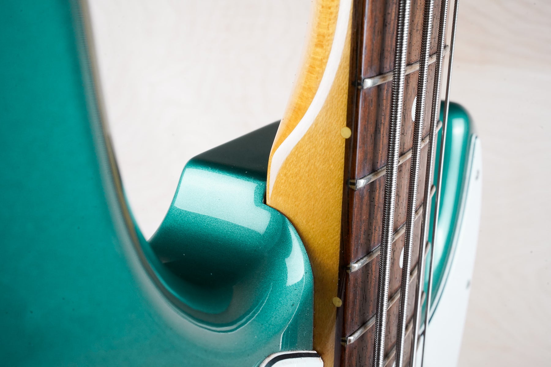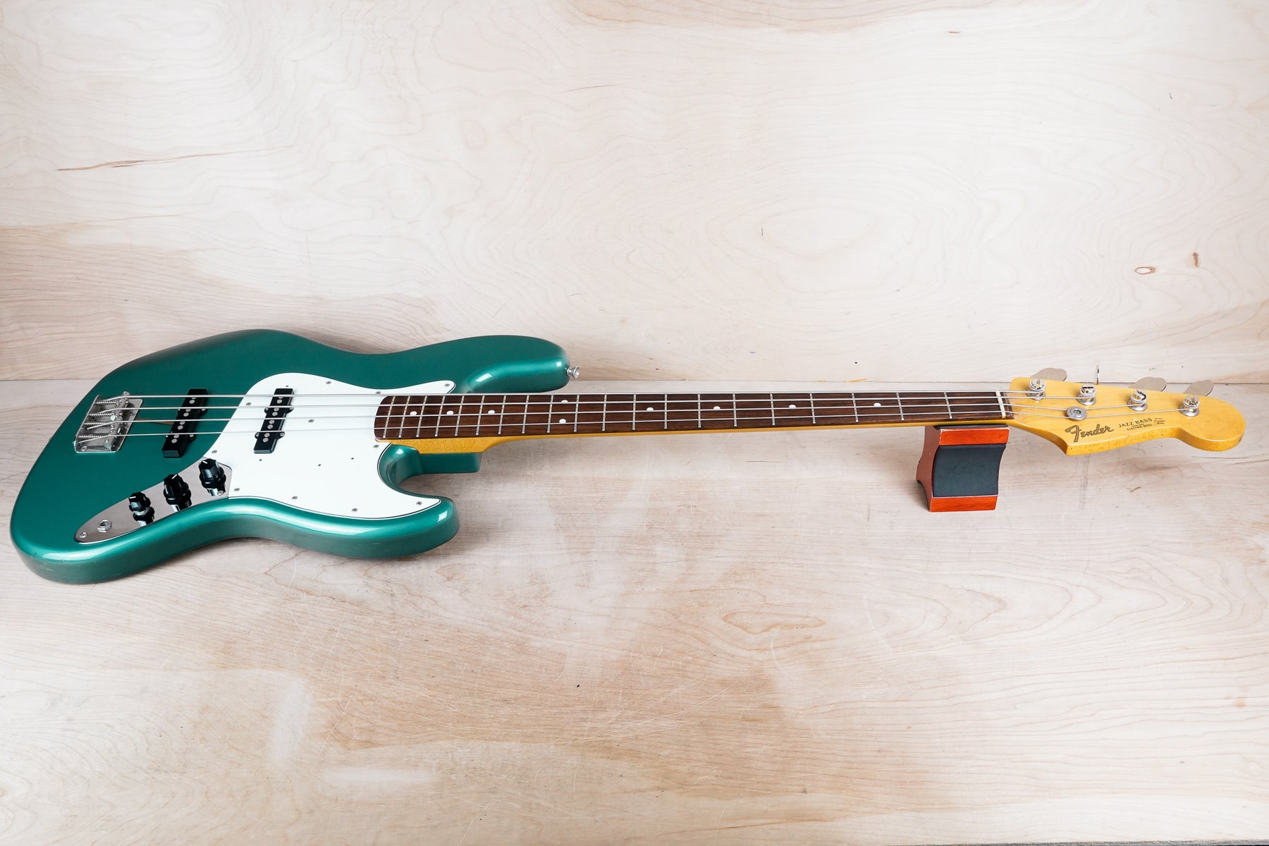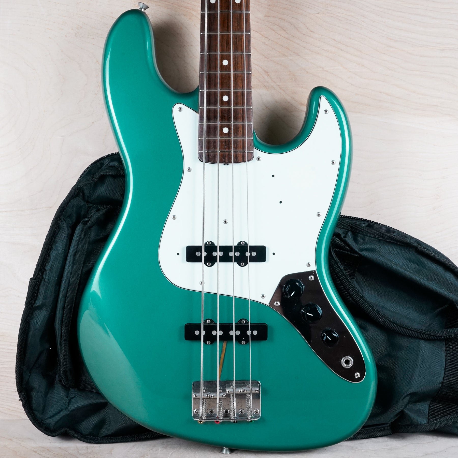 This crafted in Japan Fender JB-62 Jazz Bass Reissue plays and sounds great! The bass is comprised of a basswood body, "C" shape maple neck, and rosewood fretboard. The ocean turquoise metallic finish is a really nice color!