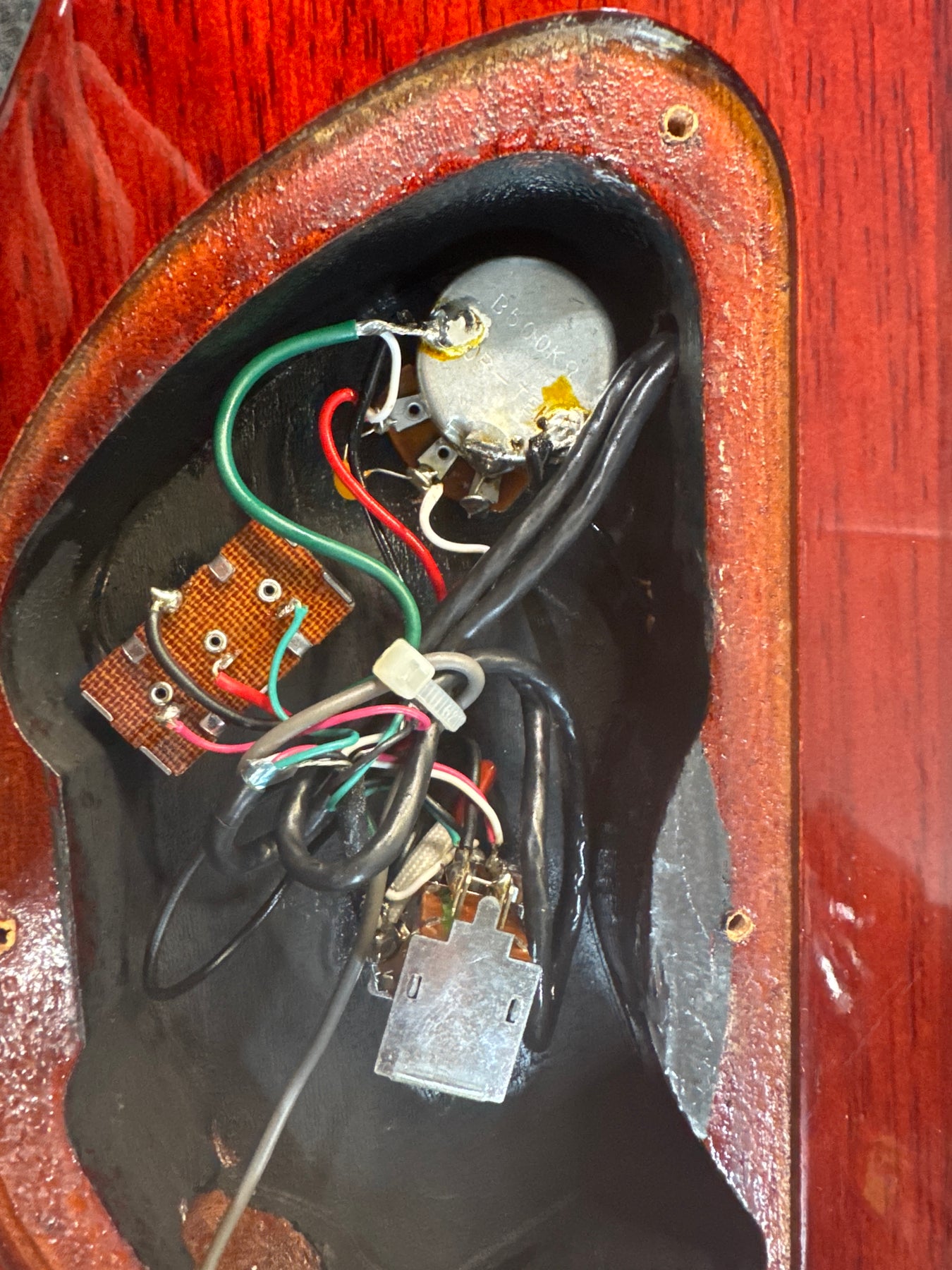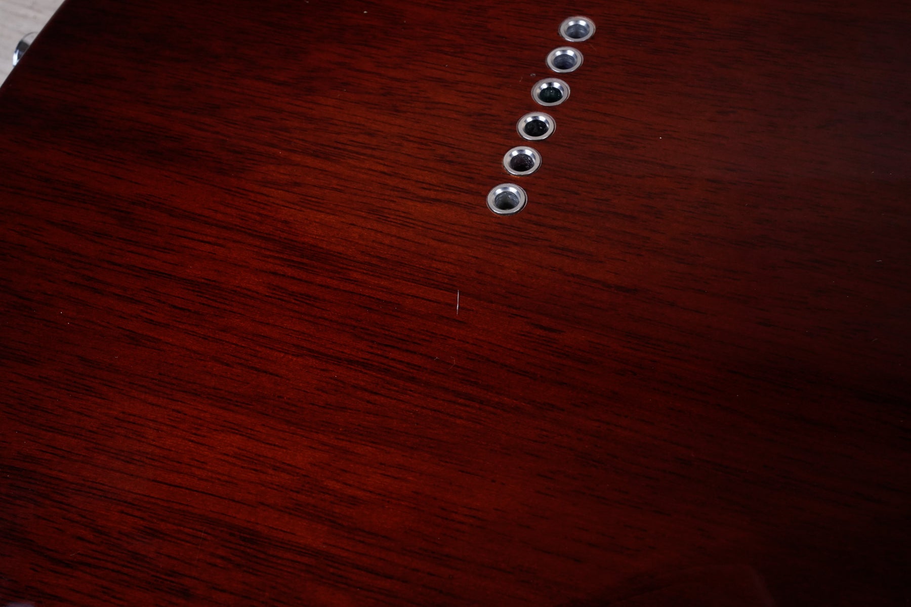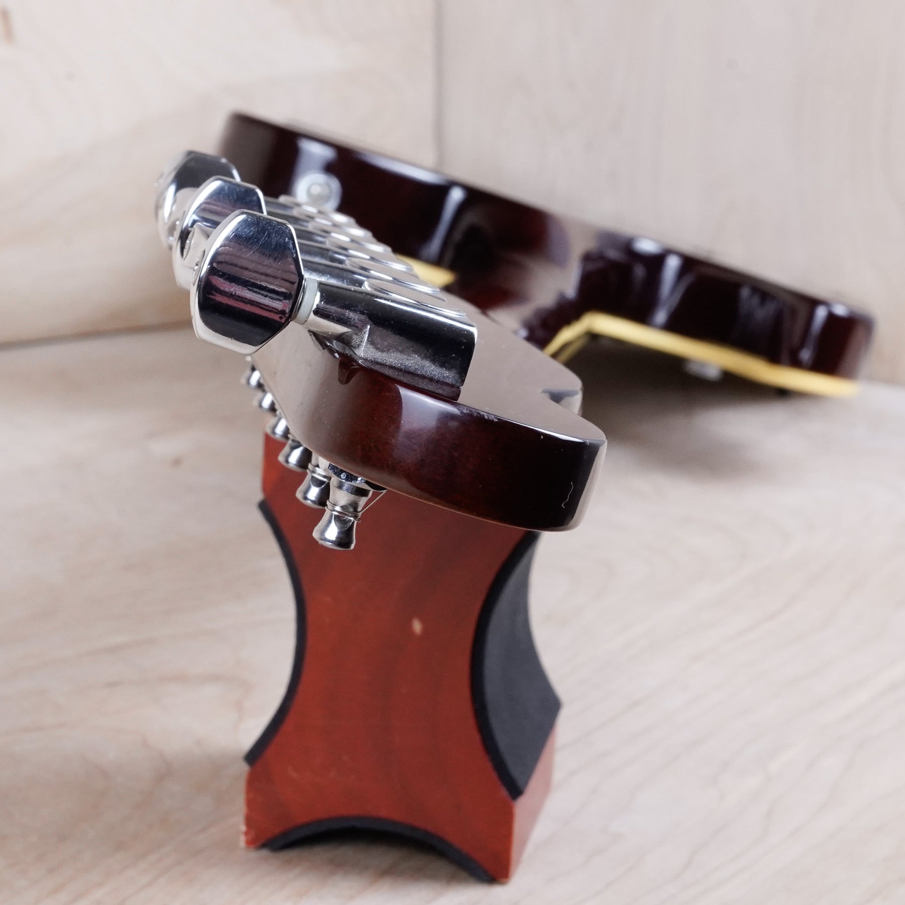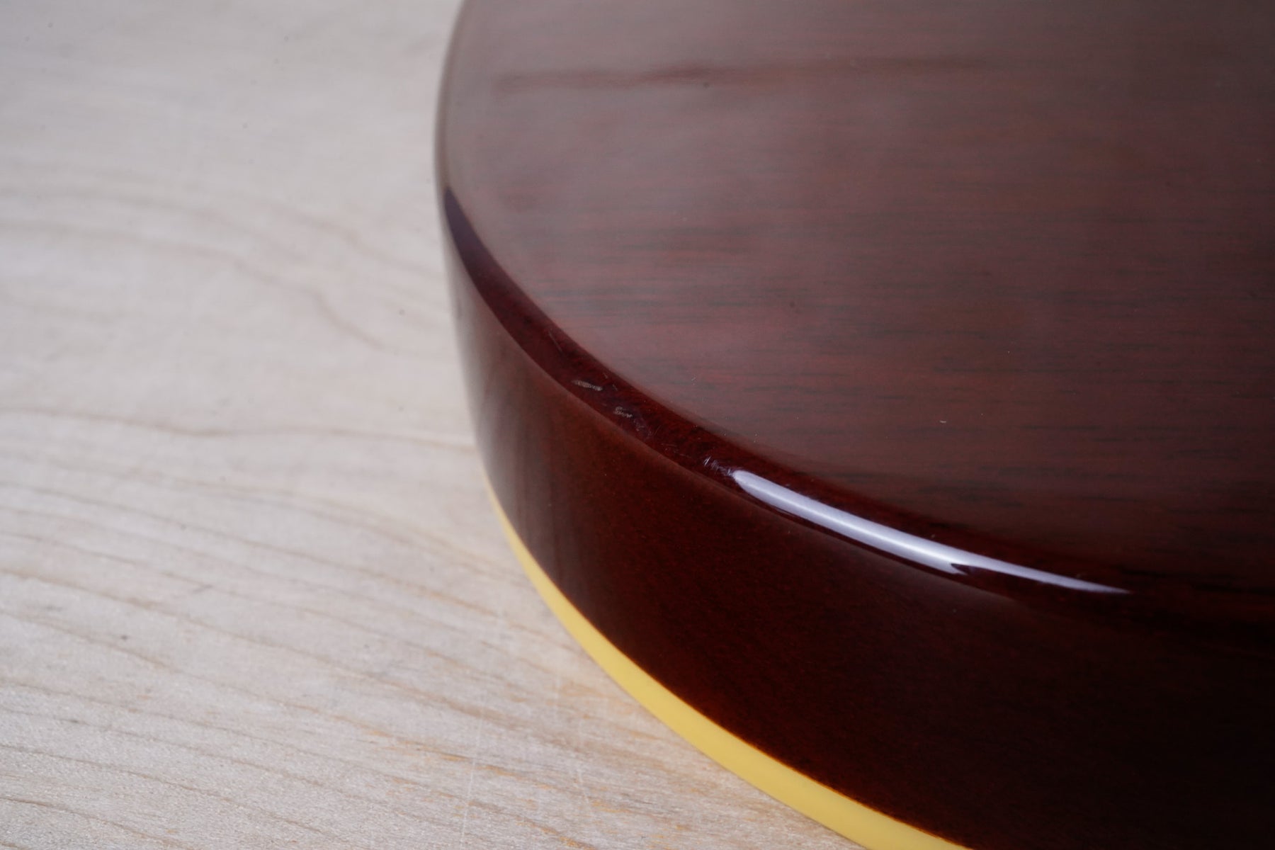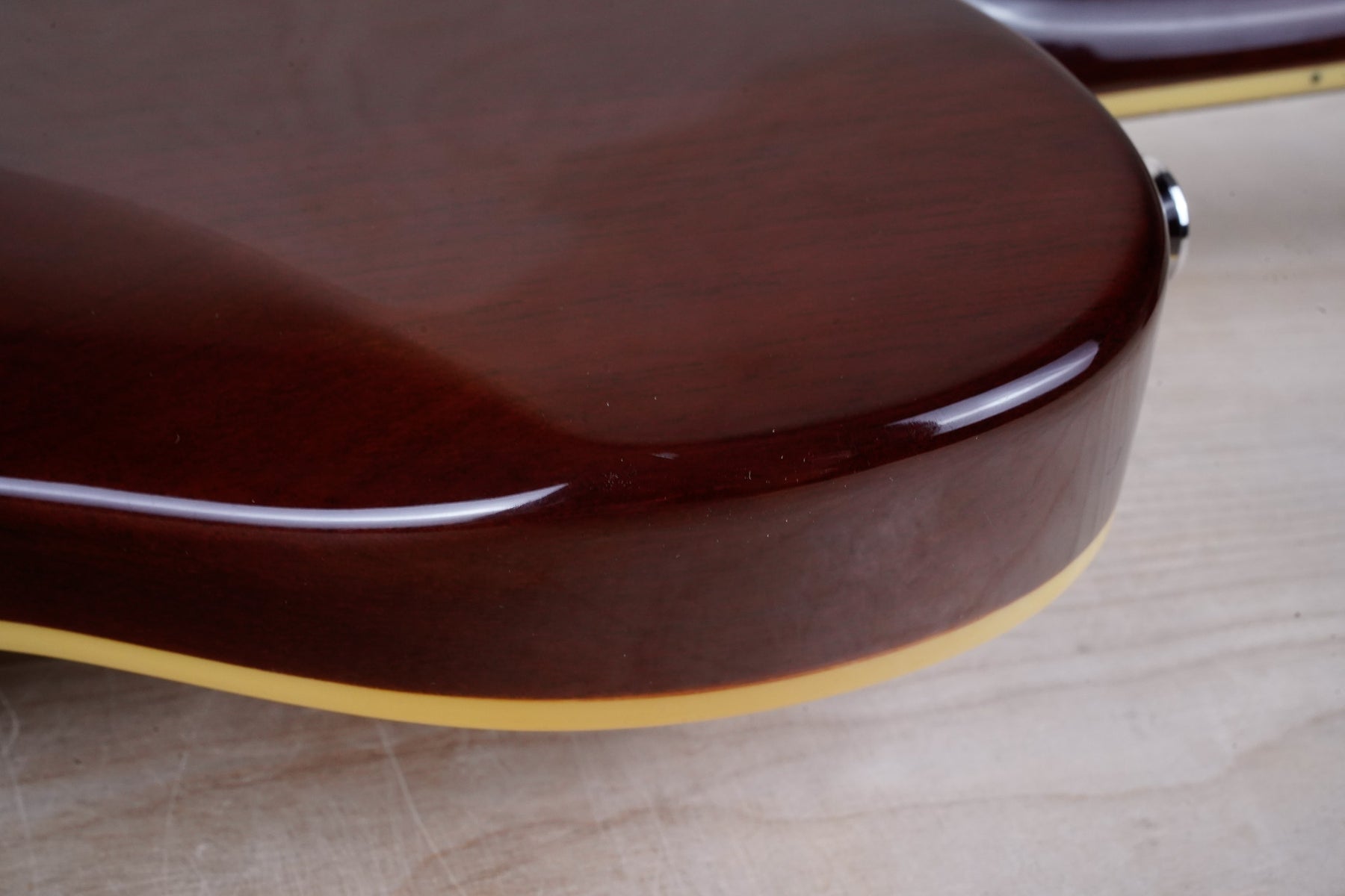 This guitar does show some cosmetic wear that includes light surface scratches, scuffs, and dents throughout the body with additional minor dings on the back of the neck and headstock. The binding has also started to yellow from over time. The frets are still in nice shape and the electronics work as they should.