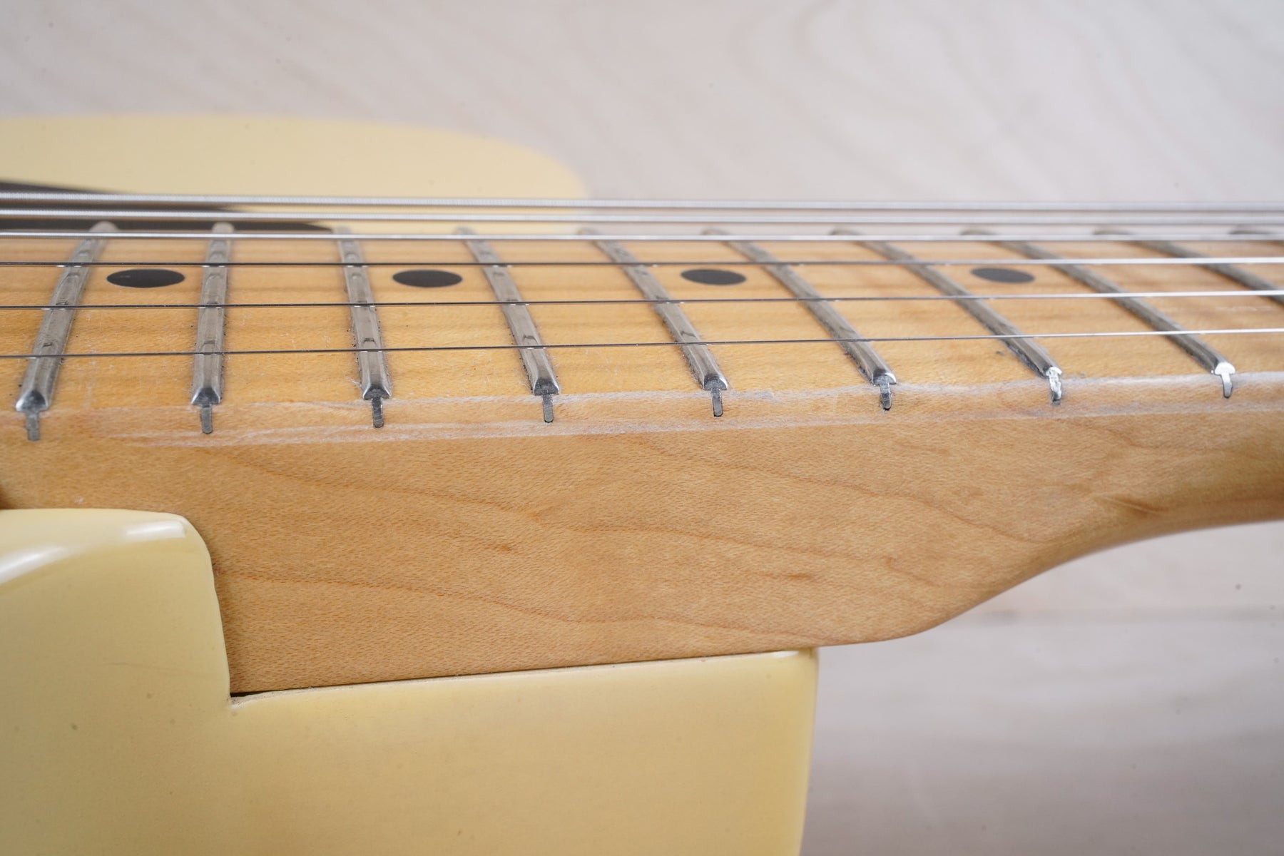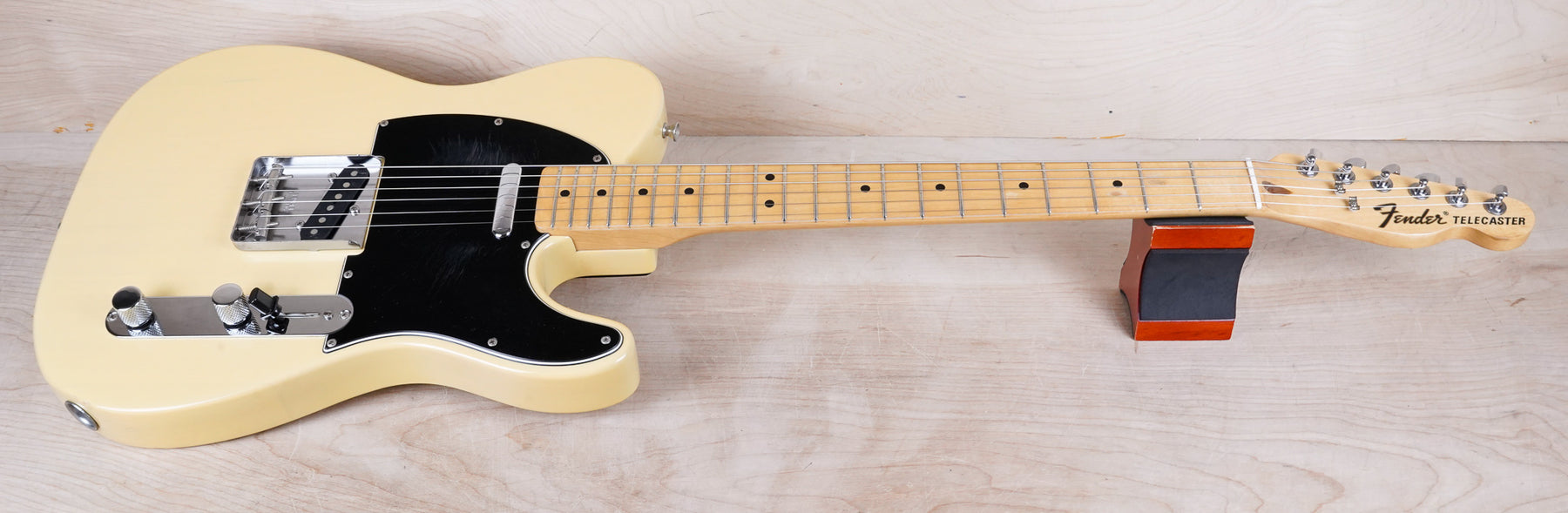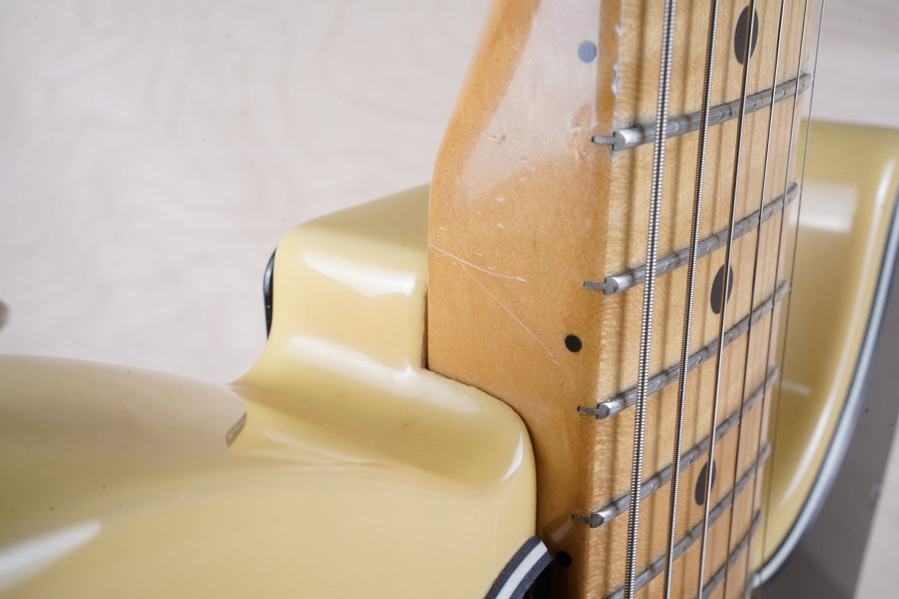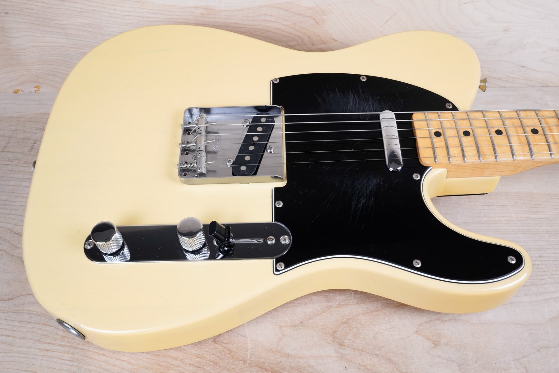 This guitar does show some cosmetic wear from over the years that includes various surface scratches, scuffs, and dents throughout the body with additional dings along the back of the neck and headstock. The off white blonde finish has aged from over time and the hardware shows normal tarnishing. The pickguard shows lots of rigorous scratches from the many years of play and there's some lacquer wear on the fretboard. The frets are used but still play great and the electronics work as they should.