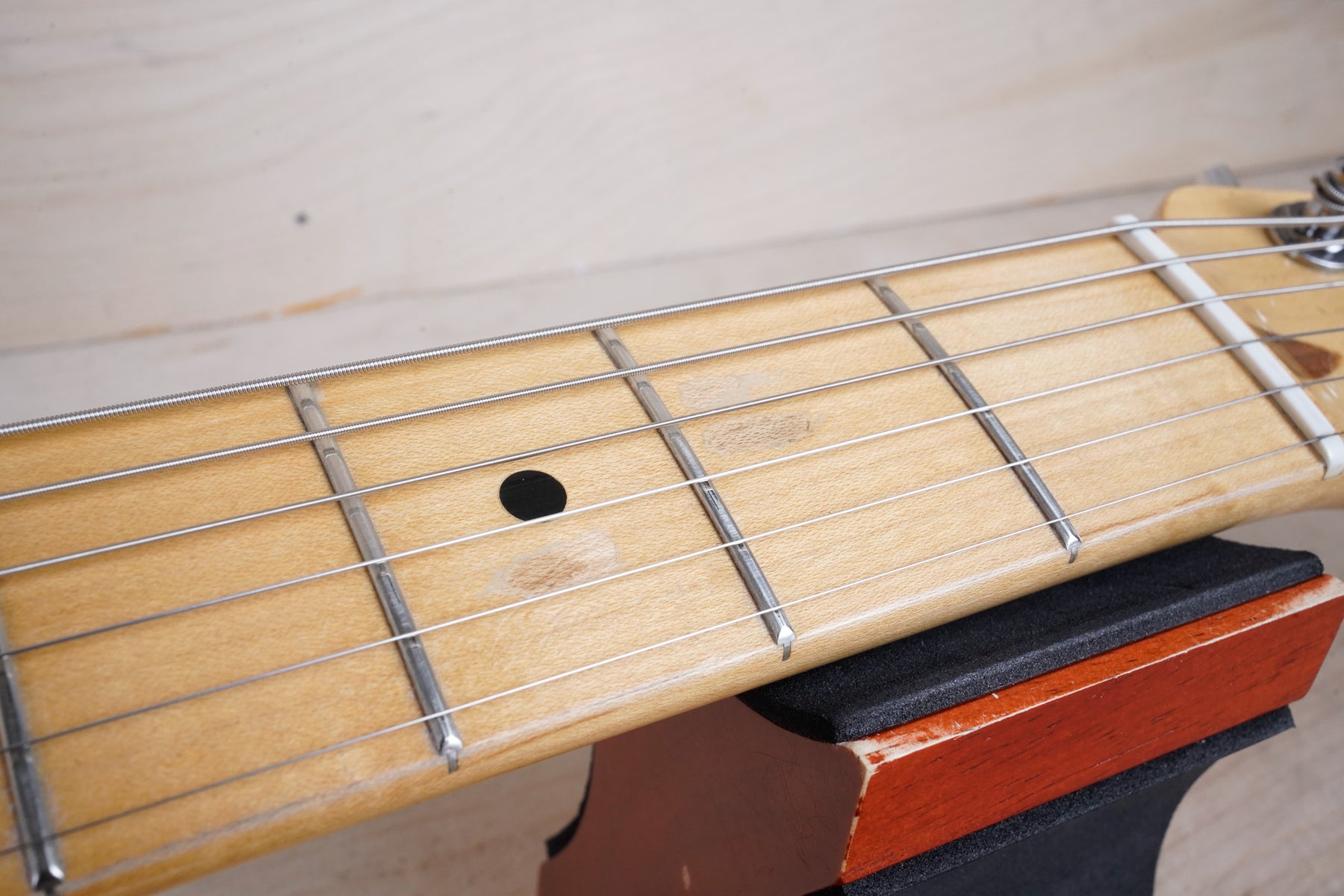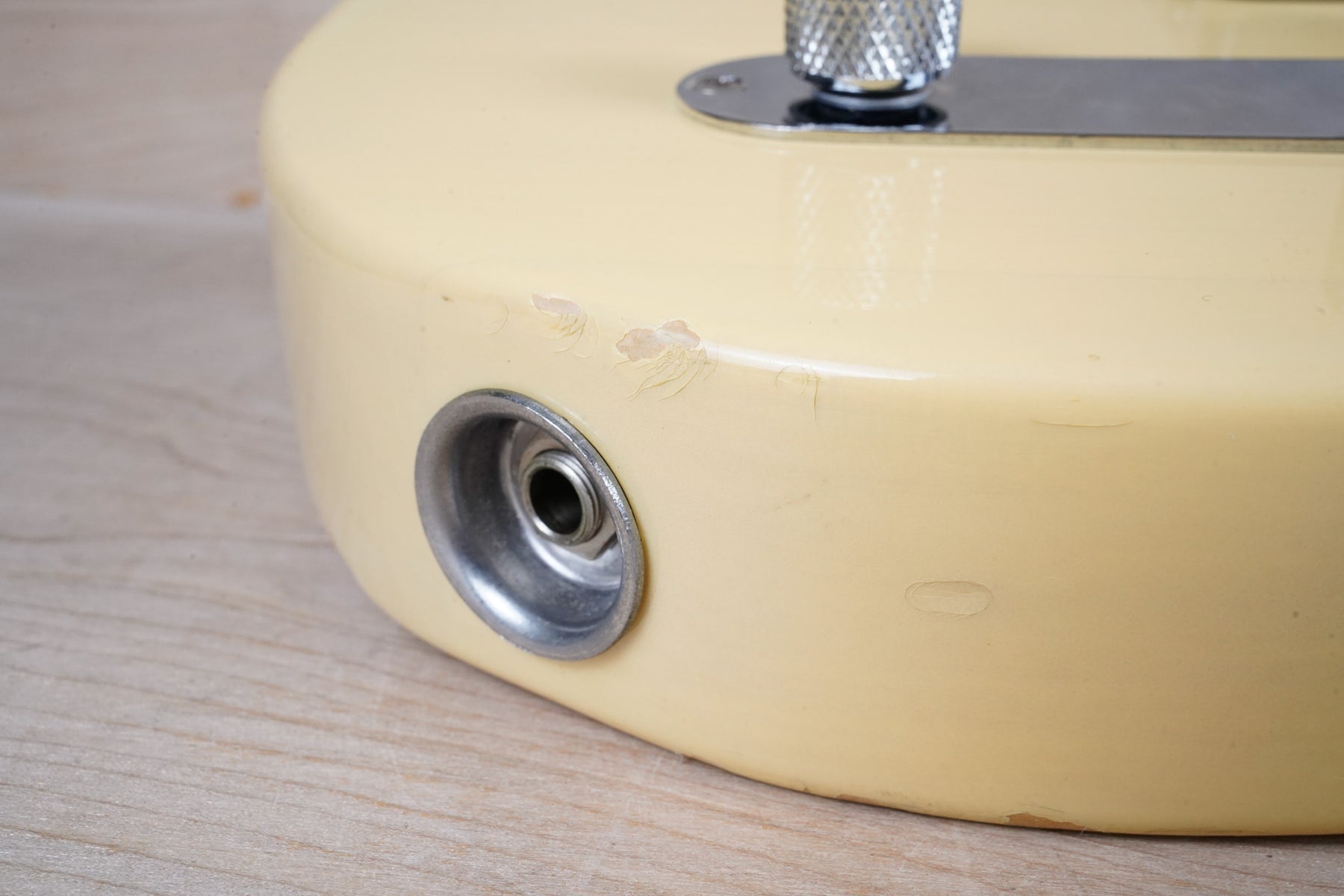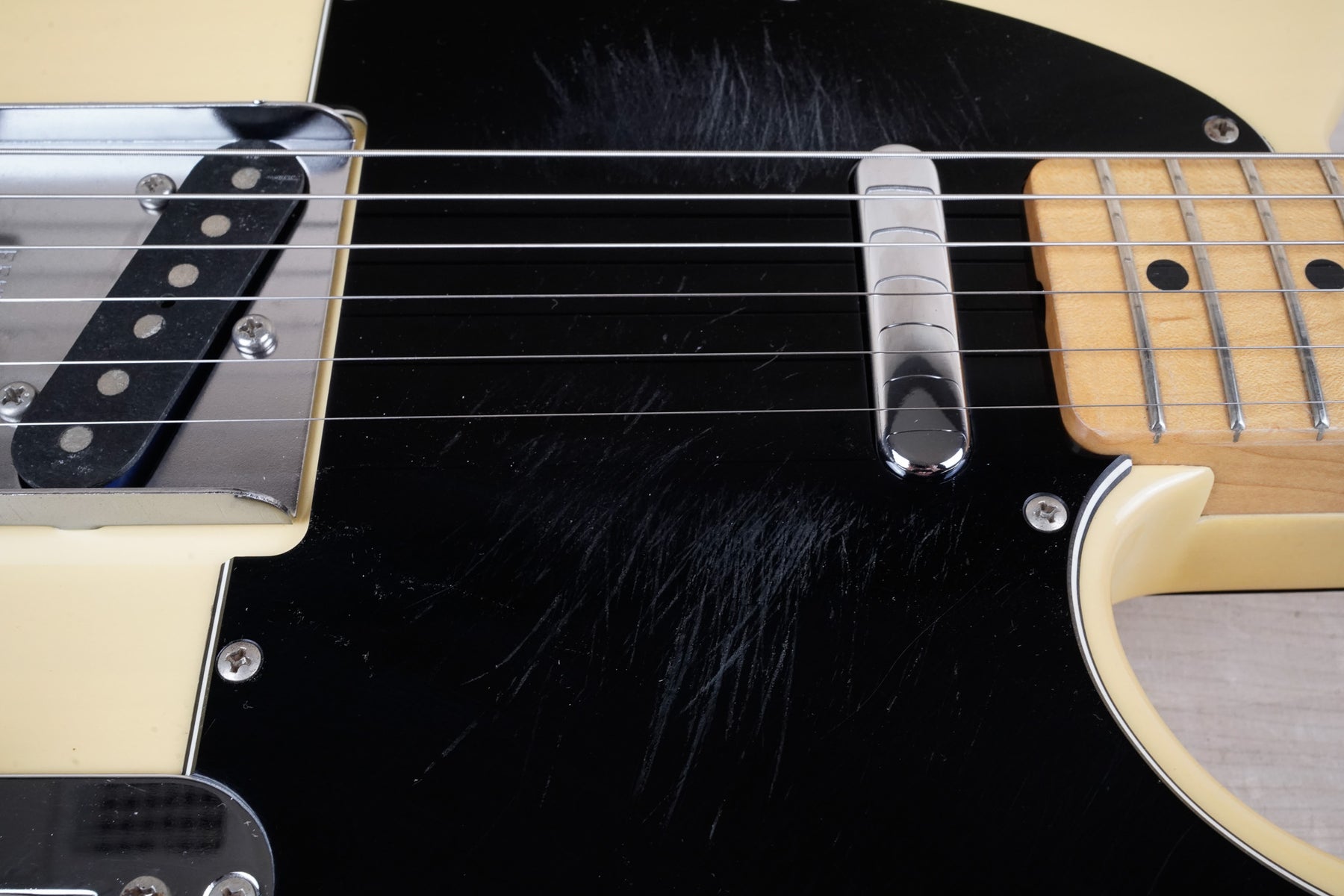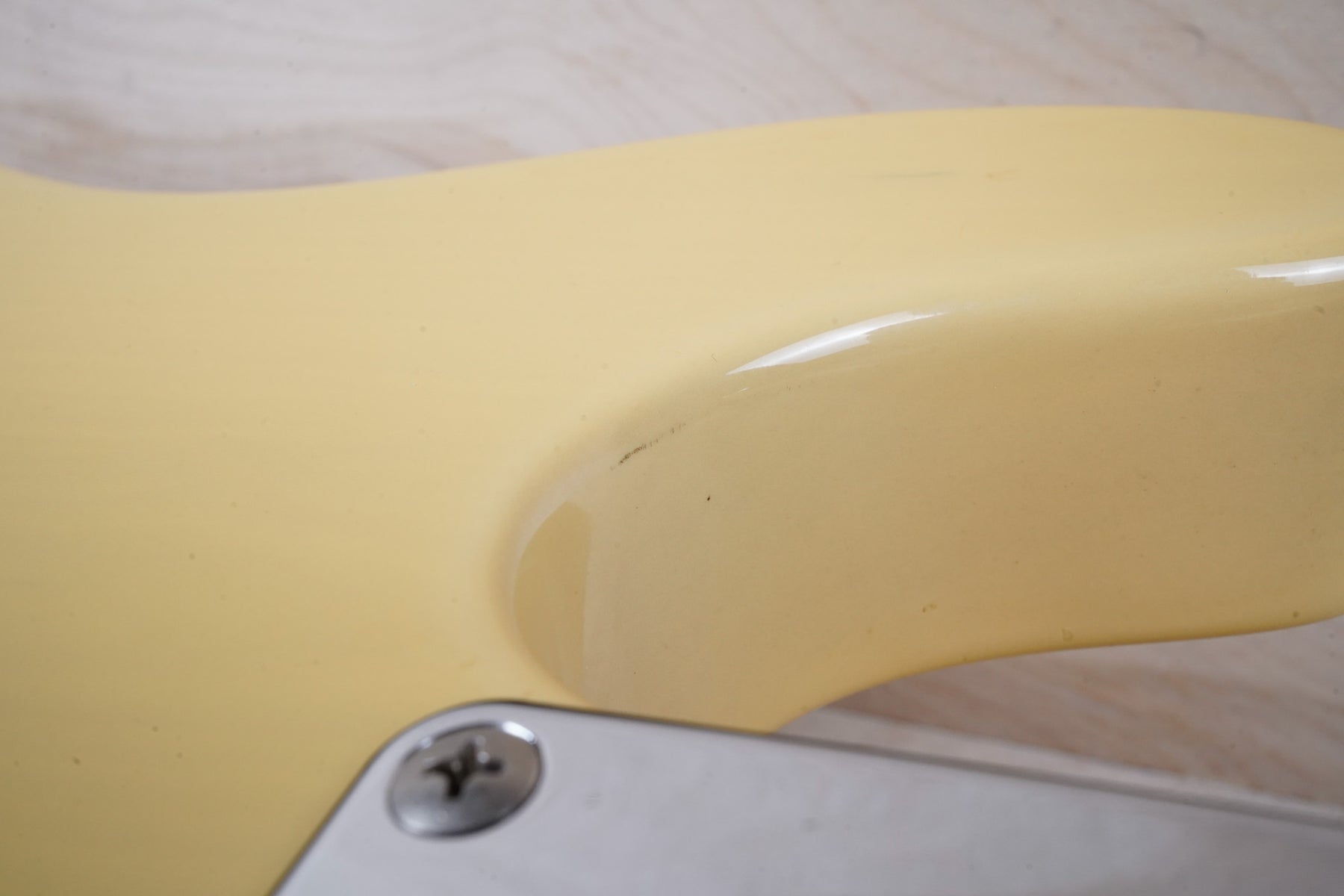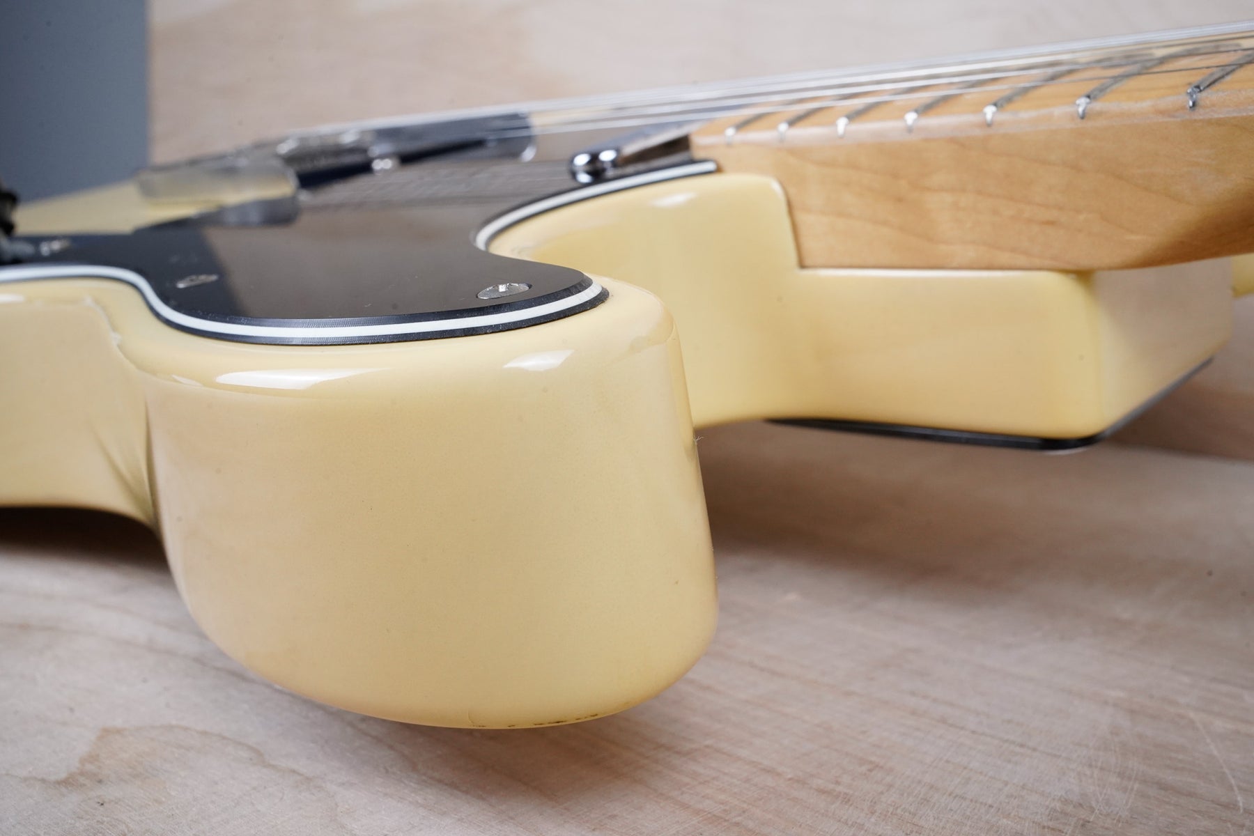 This guitar does show some cosmetic wear from over the years that includes various surface scratches, scuffs, and dents throughout the body with additional dings along the back of the neck and headstock. The off white blonde finish has aged from over time and the hardware shows normal tarnishing. The pickguard shows lots of rigorous scratches from the many years of play and there's some lacquer wear on the fretboard. The frets are used but still play great and the electronics work as they should.
